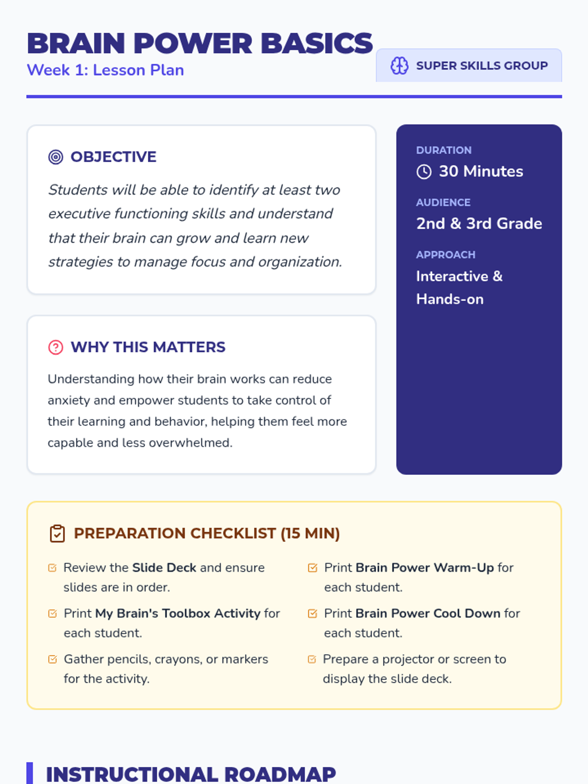 A comprehensive 6-week executive functioning group for 2nd and 3rd graders. Students learn about 'brain superpowers' like focus, organization, memory, impulse control, and planning through interactive lessons, hands-on activities, and strategy building to manage ADHD and anxiety symptoms.