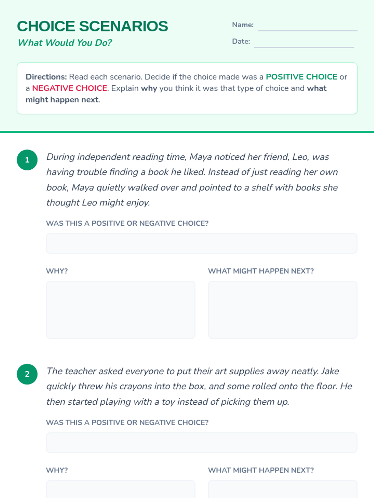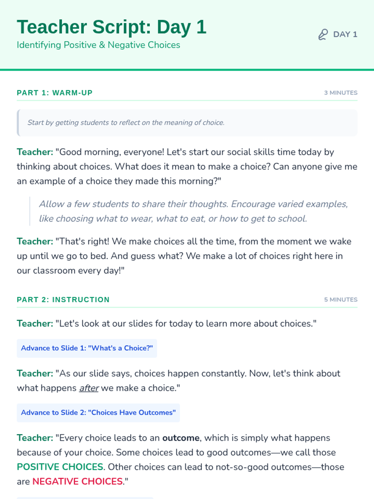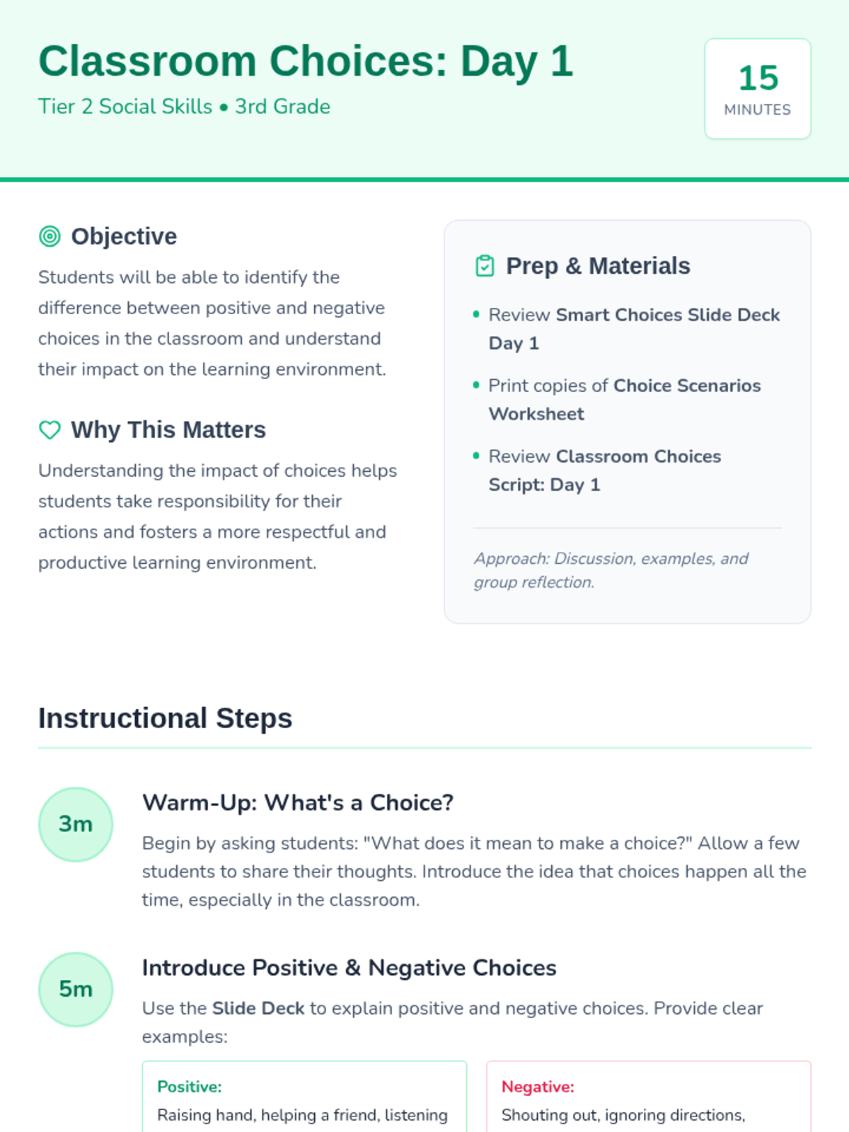 A two-day social skills lesson sequence for 3rd-grade Tier 2 groups, focusing on identifying positive and negative classroom choices and applying the 'Stop, Think, Act' strategy.