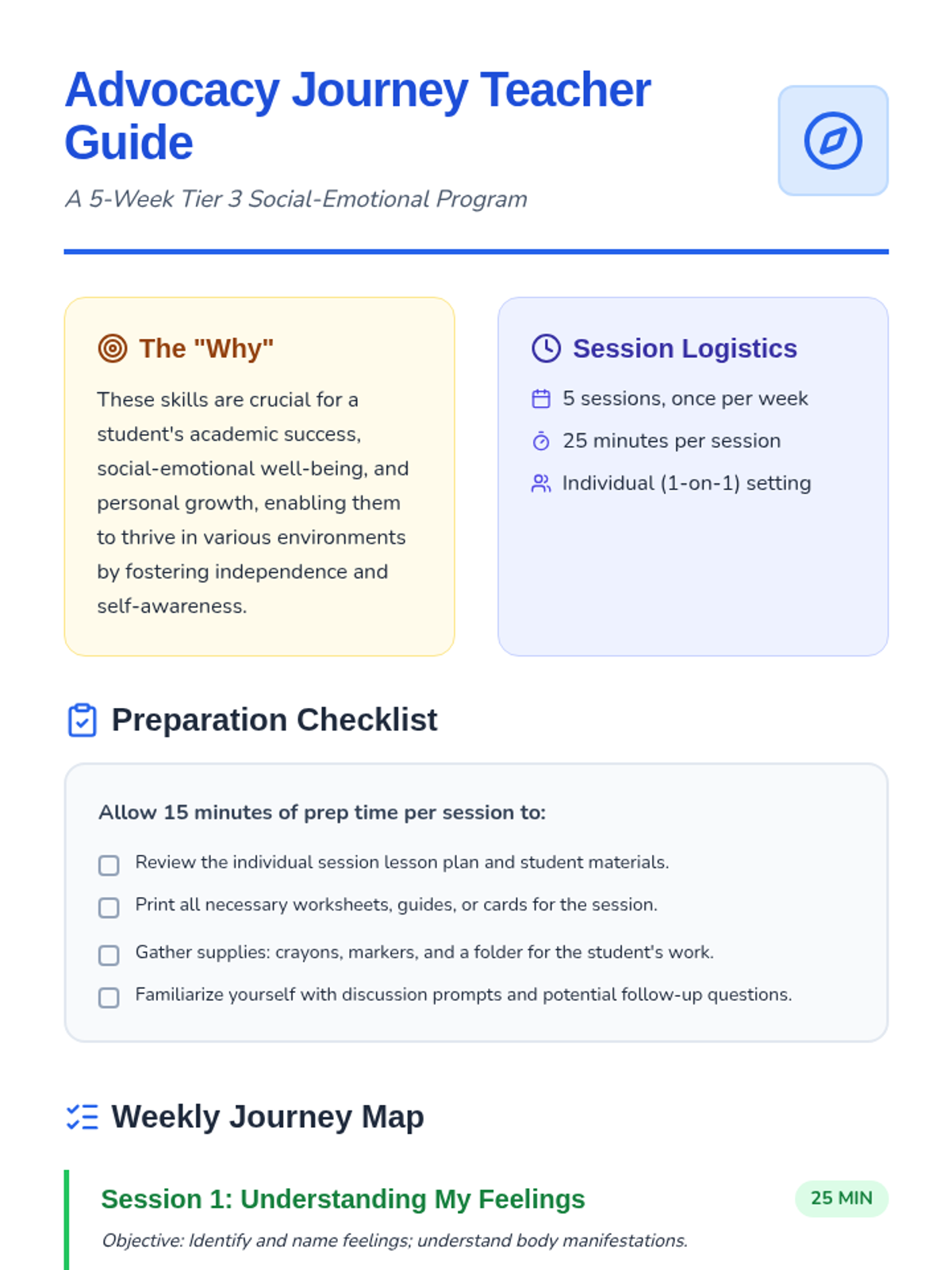 A 6-week social-emotional intervention designed for a 3rd-grade student to build emotional resilience, behavioral self-regulation, and interpersonal skills using a 'Navigator' theme. Each week focuses on a core area of growth through discussion, scenarios, and hands-on activities.