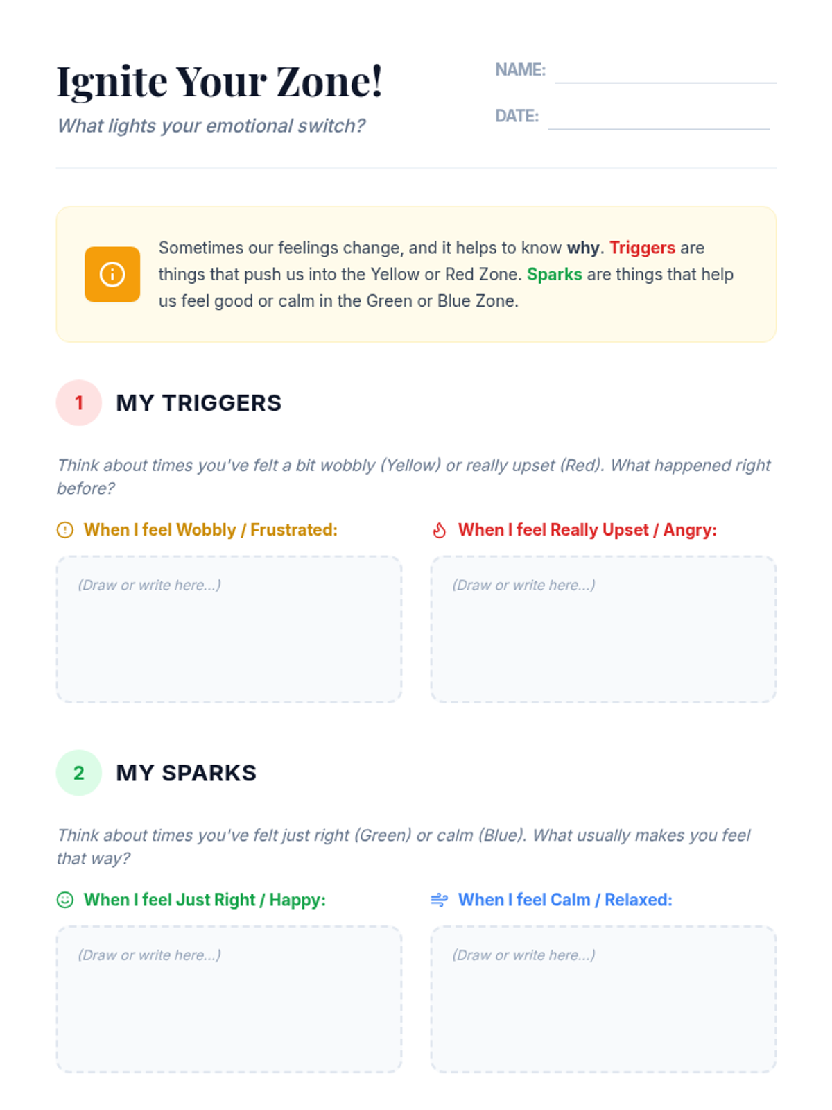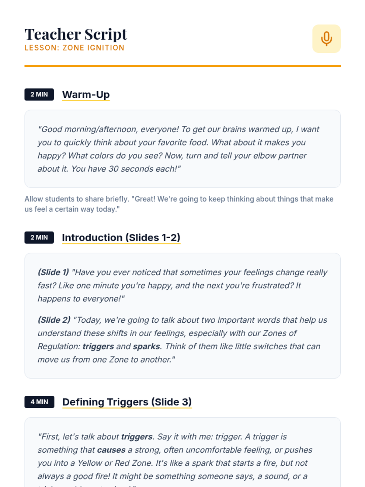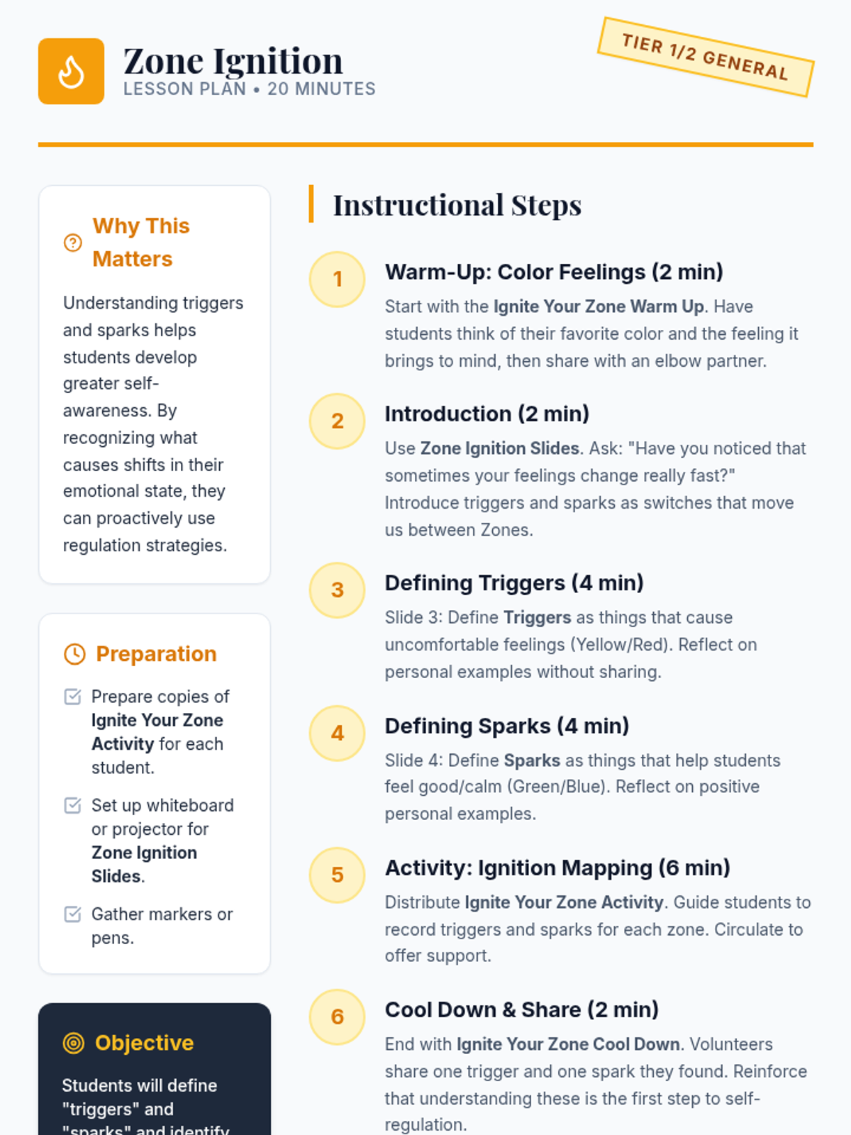 This sequence provides a tiered approach to understanding emotional triggers and 'sparks' within the Zones of Regulation framework. It begins with a general classroom introduction to the concepts and transitions into an intensive, small-group 'detective' investigation for students needing Tier 3 support.