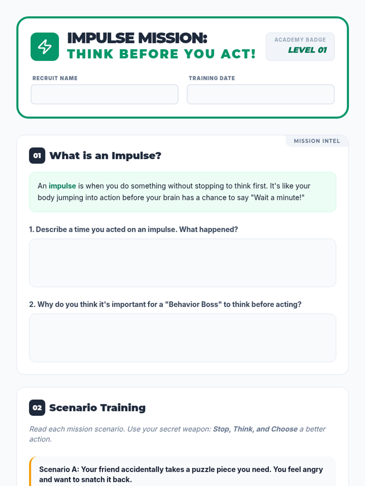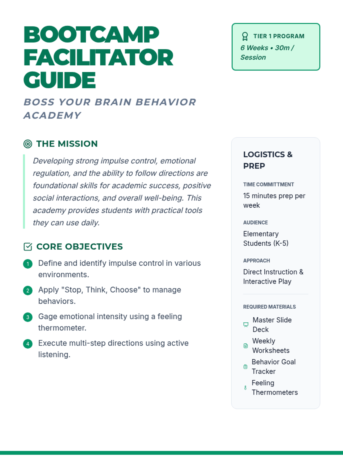 A 6-week behavior academy sequence for elementary students focusing on impulse control, emotional regulation, and following directions through engaging "bootcamp" style training.
