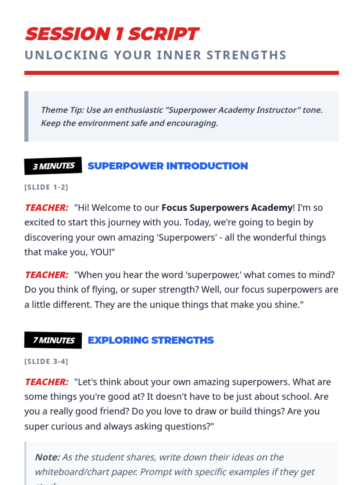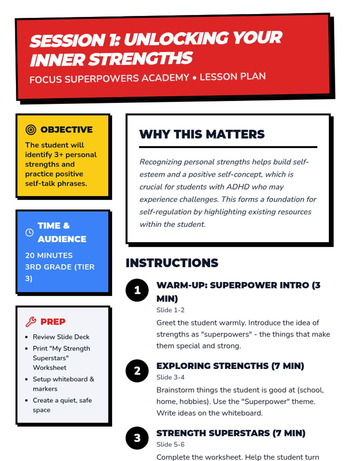 A 12-session Tier 3 individual counseling series for 3rd-grade students with ADHD, focusing on self-regulation, identifying triggers, and building a toolkit of "focus superpowers" through a trauma-informed, superhero-themed curriculum.