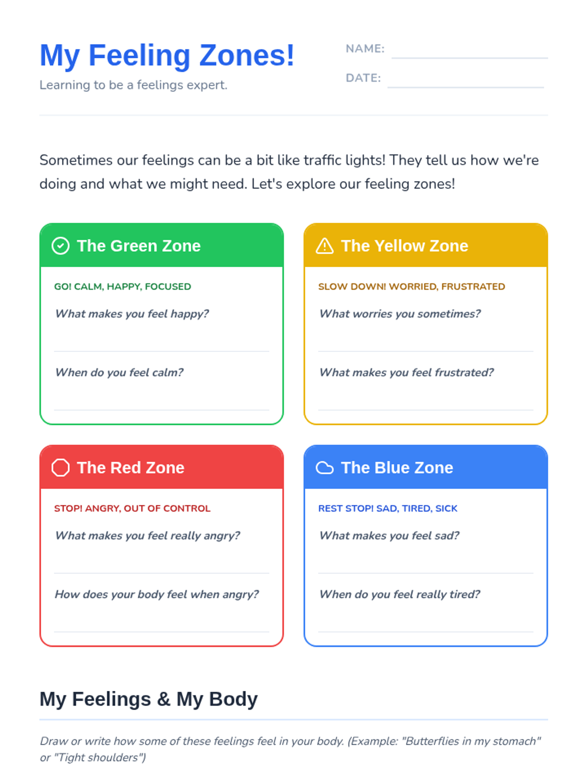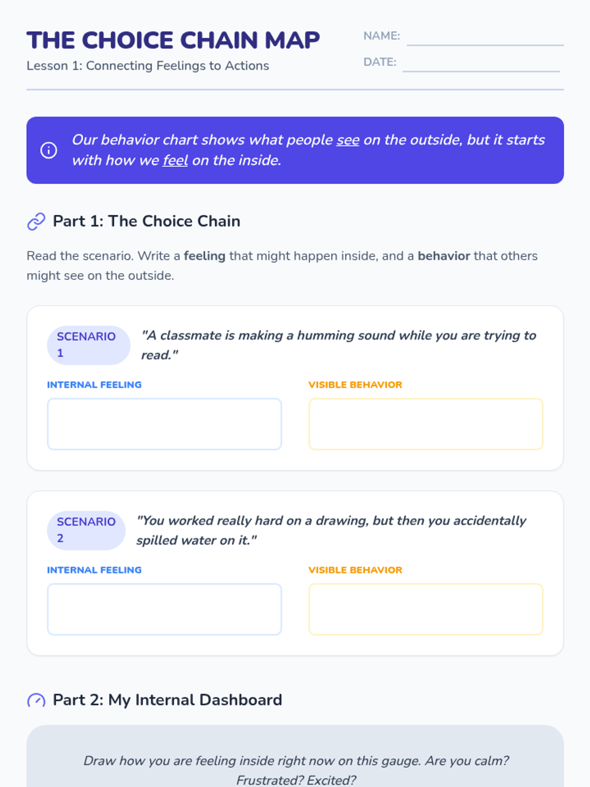 A 5-lesson unit for 3rd grade students focusing on the emotional regulation behind behavior tracking systems. Students learn to map internal feelings to external behaviors, categorize actions into color zones, develop 'Yellow Zone' coping strategies, and practice the mindset of a 'reset' for emotional growth.
