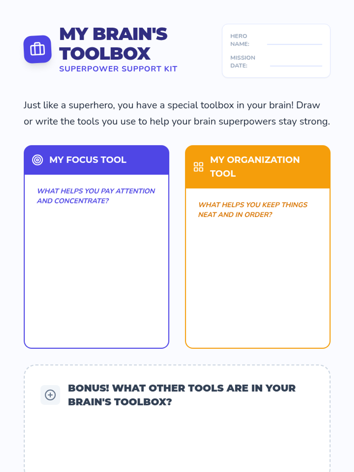 A Tier 3 intervention sequence designed for elementary students with ADHD, focusing on building a personal 'toolbox' of self-regulation and focus strategies. Over eight sessions, students develop awareness of their distractions and learn practical tools for school and home.