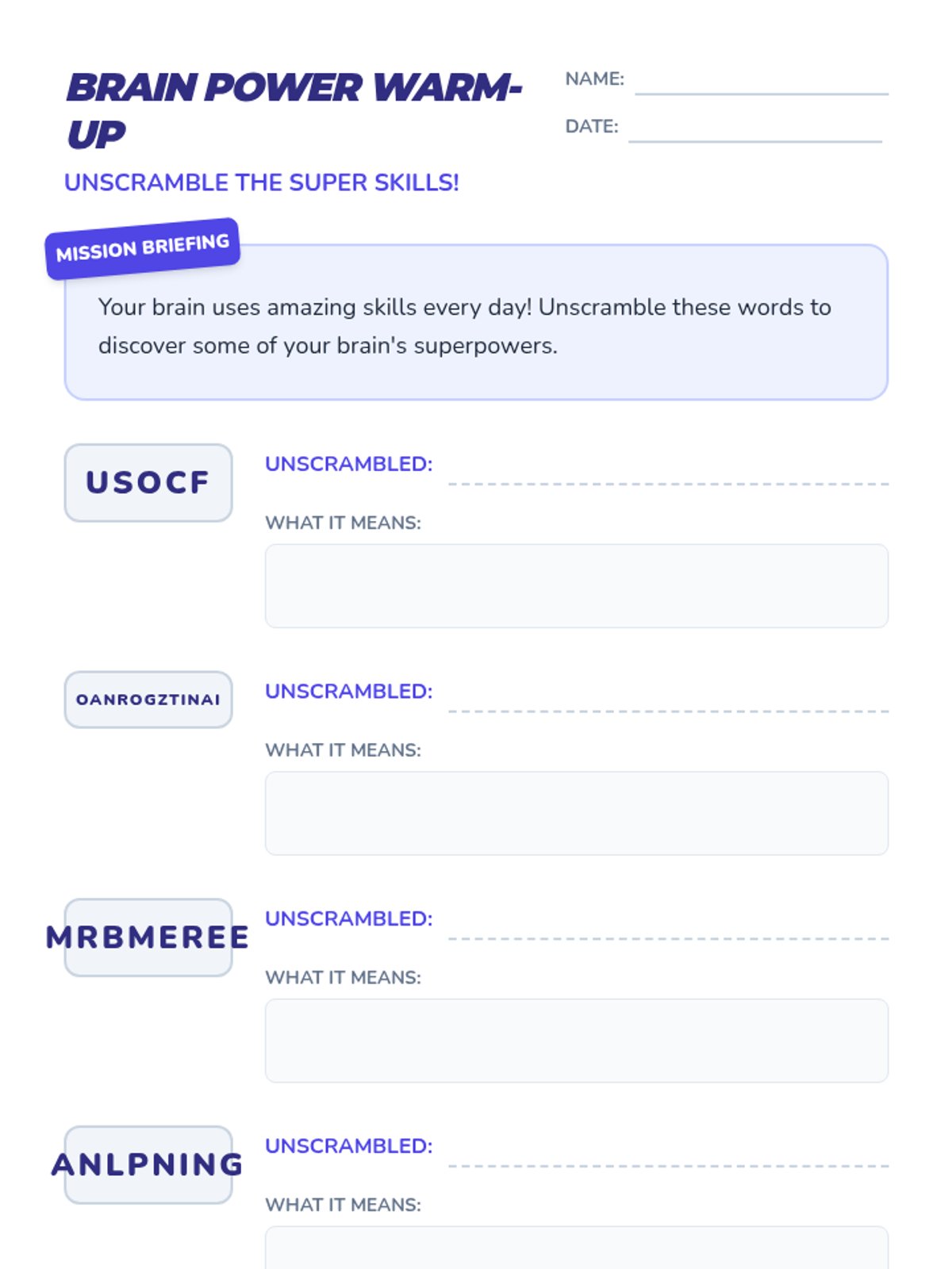 A sequence for 3rd graders to master self-talk strategies for task initiation. Students take on the role of 'Brain Coaches' to externalize executive function challenges and build a toolkit for overcoming procrastination through role-play, games, and simulations.