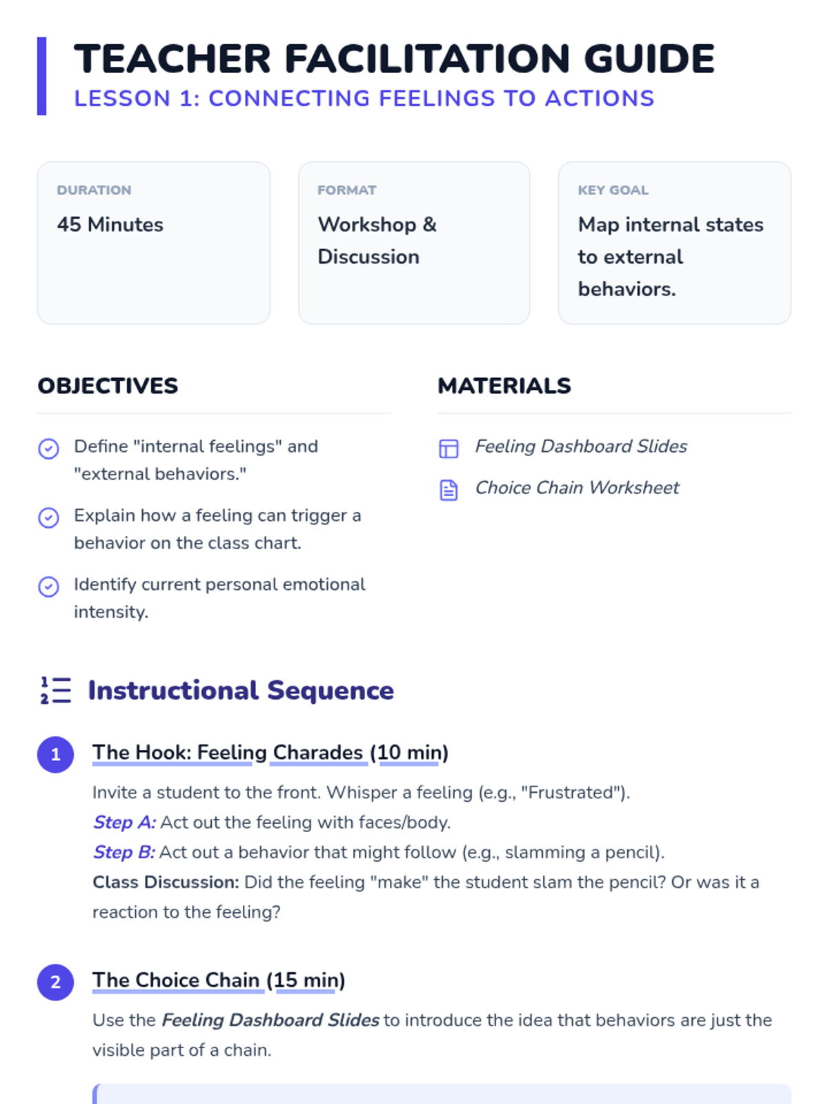 This inquiry-based sequence helps students identify the physiological and environmental precursors to behavioral outbursts. Students learn to recognize their body's 'rumble' signals, identify personal triggers, understand the brain's role in emotional regulation, and create a personalized early warning system for self-regulation.