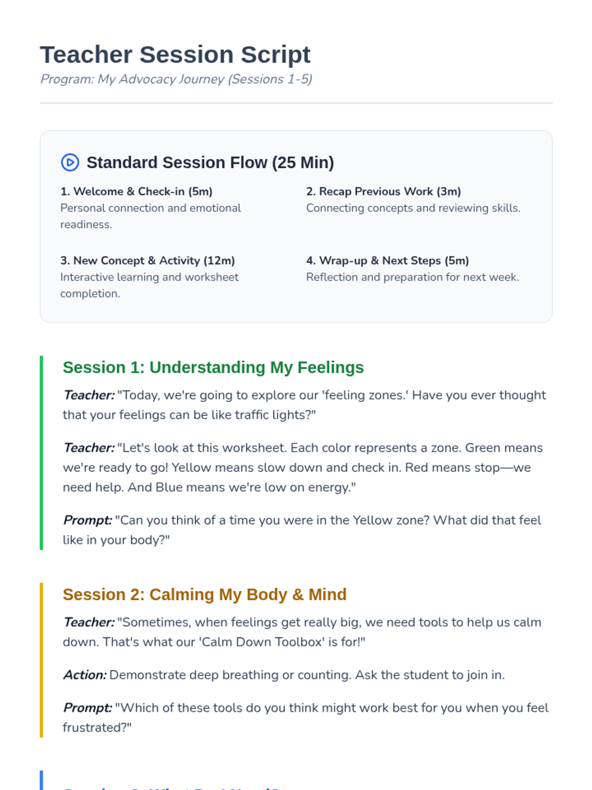 A comprehensive 20-week curriculum designed to empower students with self-advocacy skills, moving from identifying barriers to implementing personalized solutions.