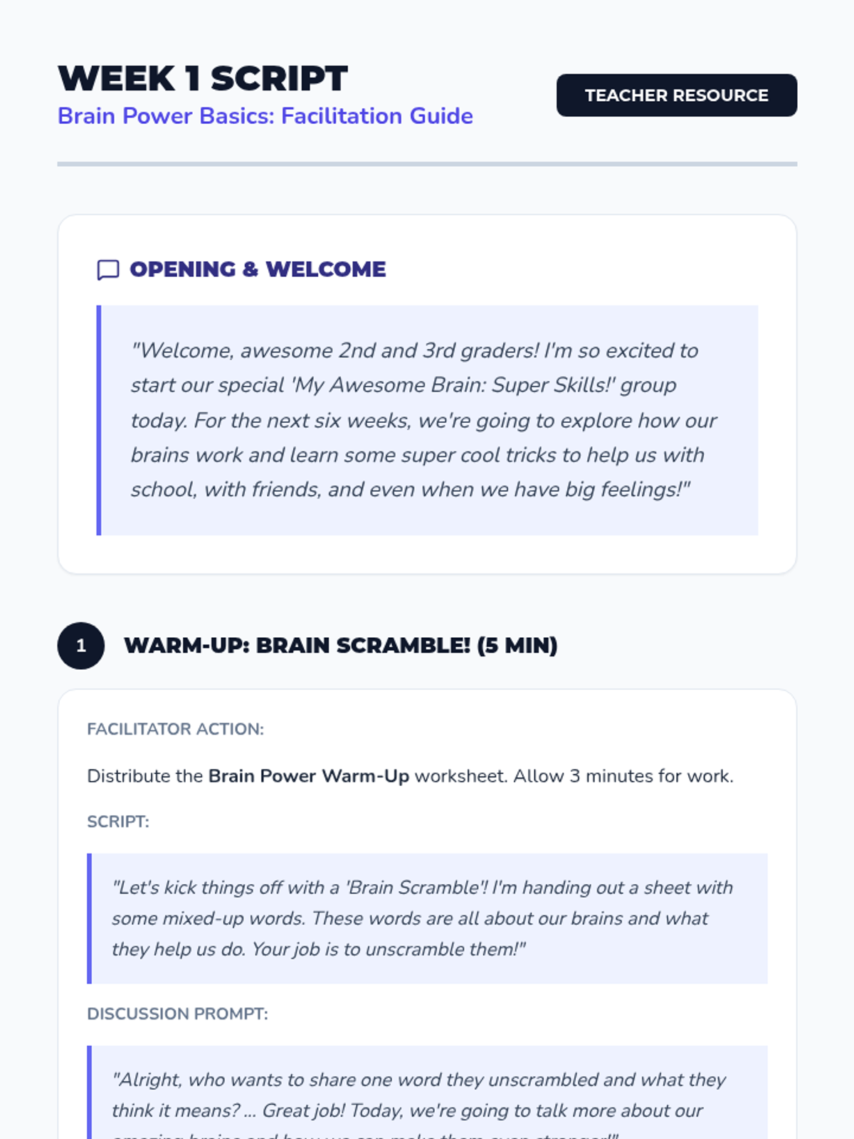 A 6-session intervention sequence designed to build flexible thinking, coping skills, and boundary awareness in elementary students. Each session uses the 'Flexi-Mind Gym' metaphor to tackle specific academic and social challenges through guided instruction and practice.