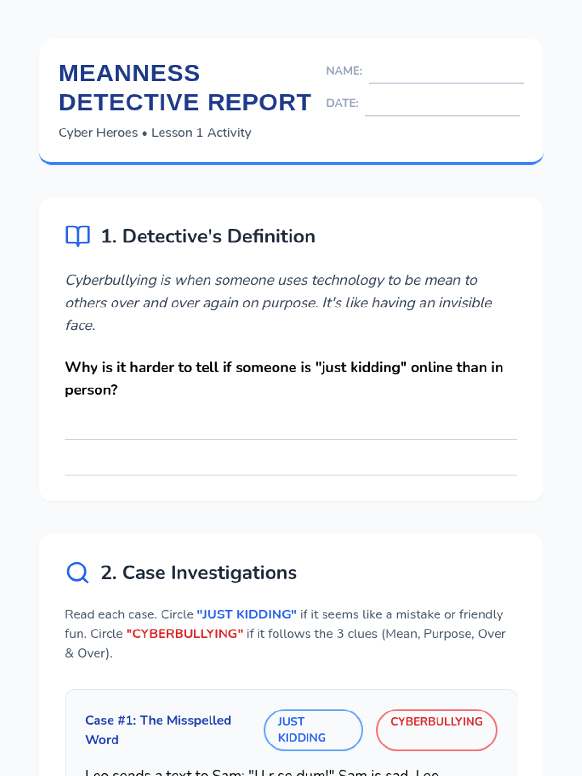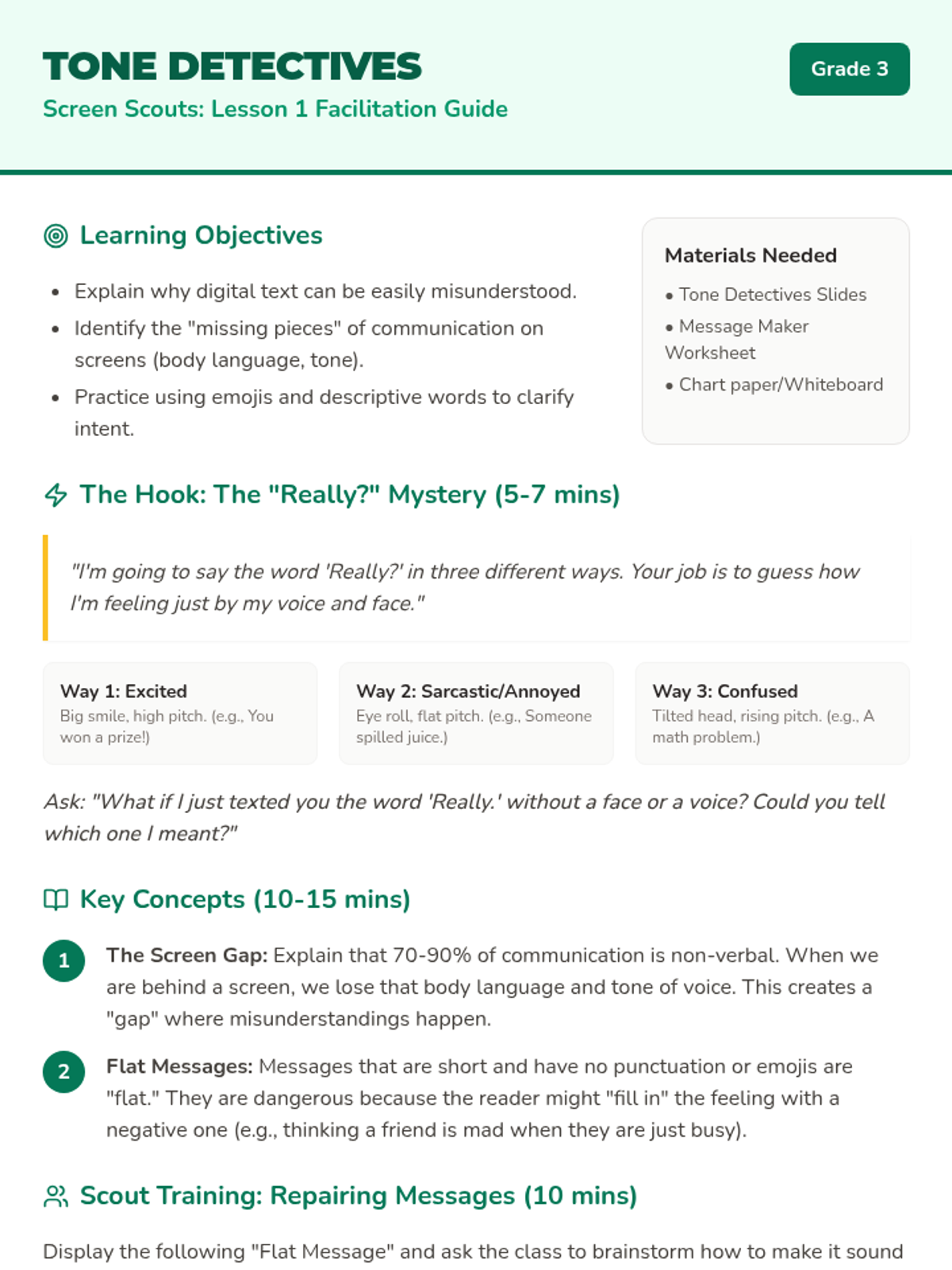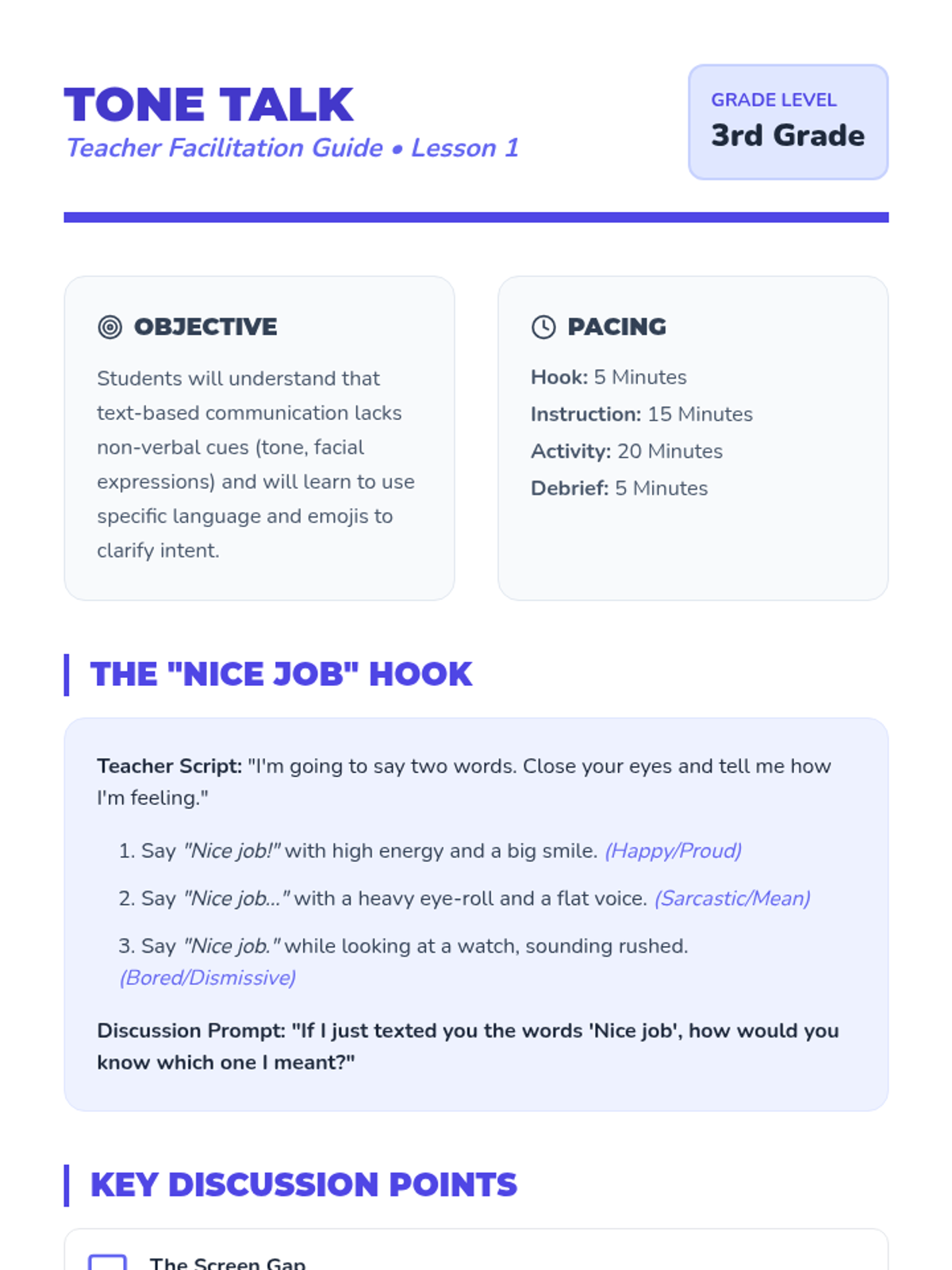 A comprehensive 5-lesson sequence for 3rd graders on navigating online interactions. Students learn to interpret digital tone, identify cyberbullying, act as upstanders, report inappropriate behavior, and foster a positive online community.