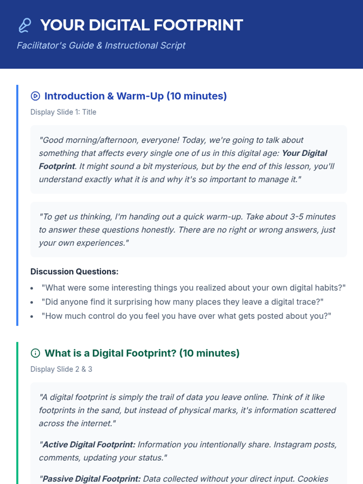 A comprehensive digital citizenship sequence for 3rd grade students focusing on distinguishing personal from public information, creating safe identities, and securing digital accounts through passwords and privacy settings.