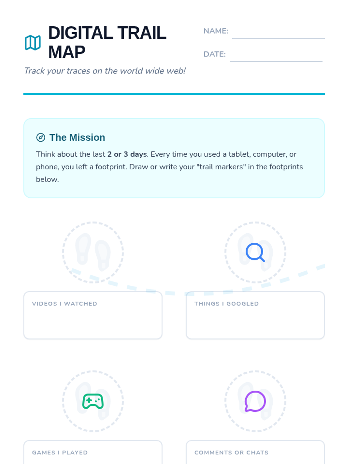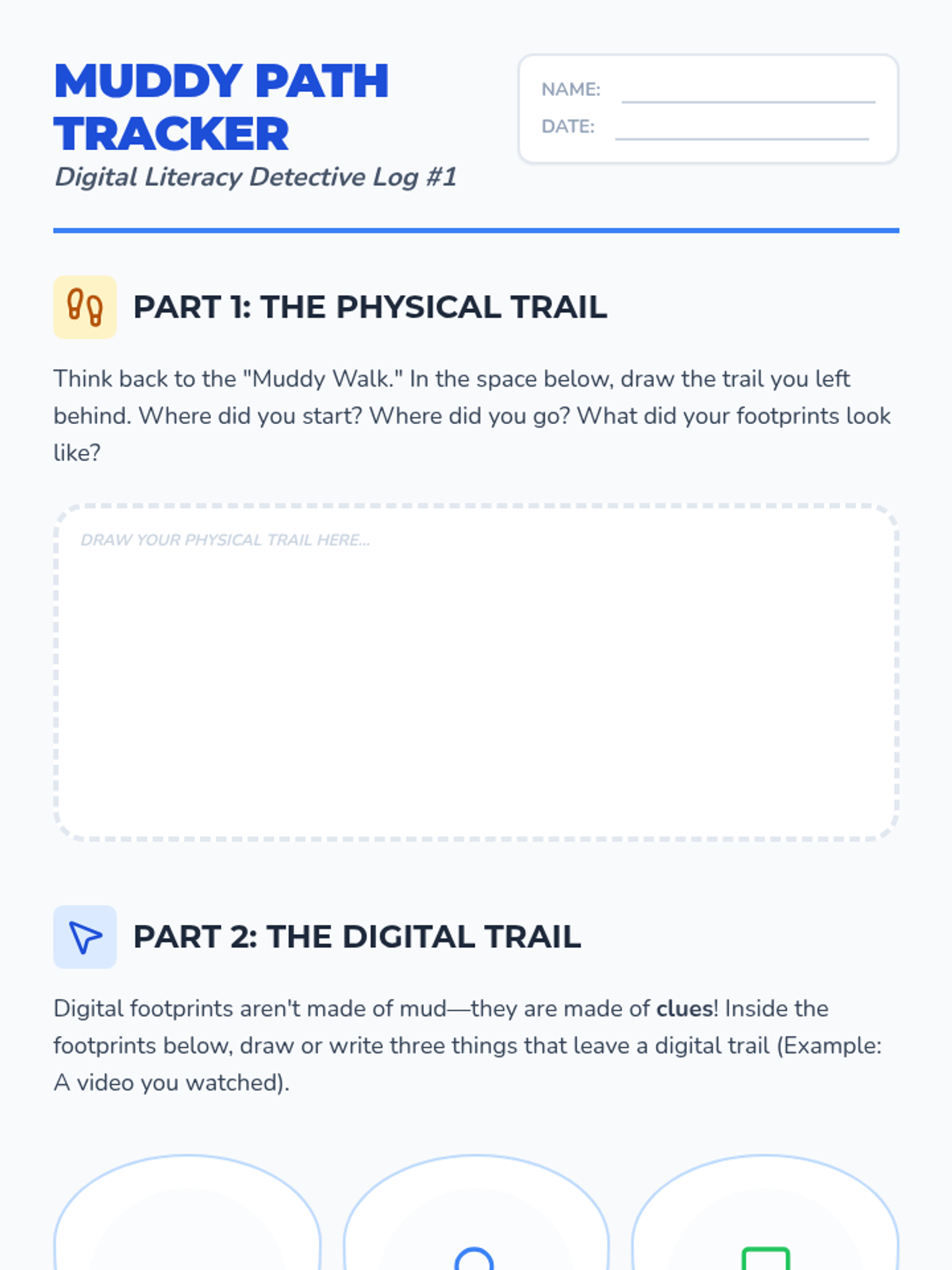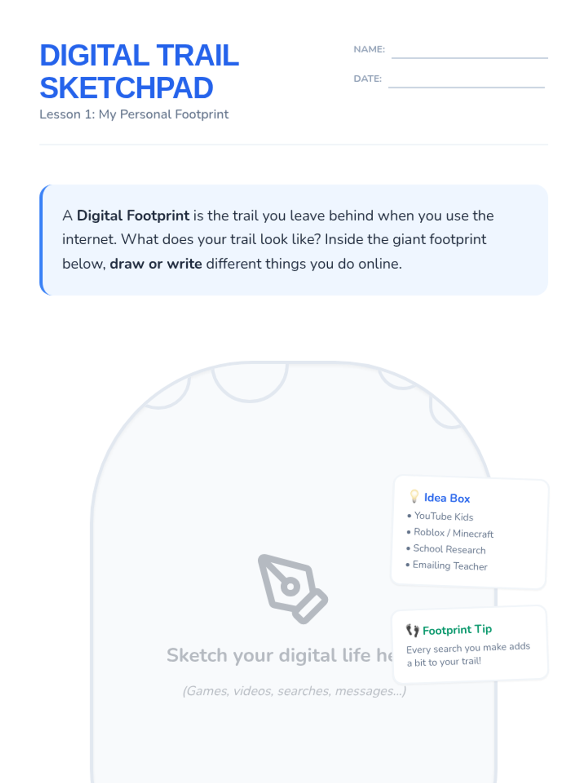 A 3rd-grade sequence focused on the permanence of online actions and building a positive digital reputation through the metaphor of a 'digital footprint'. Students learn that every click and post leaves a trail, exploring themes of digital permanence and responsible communication.
