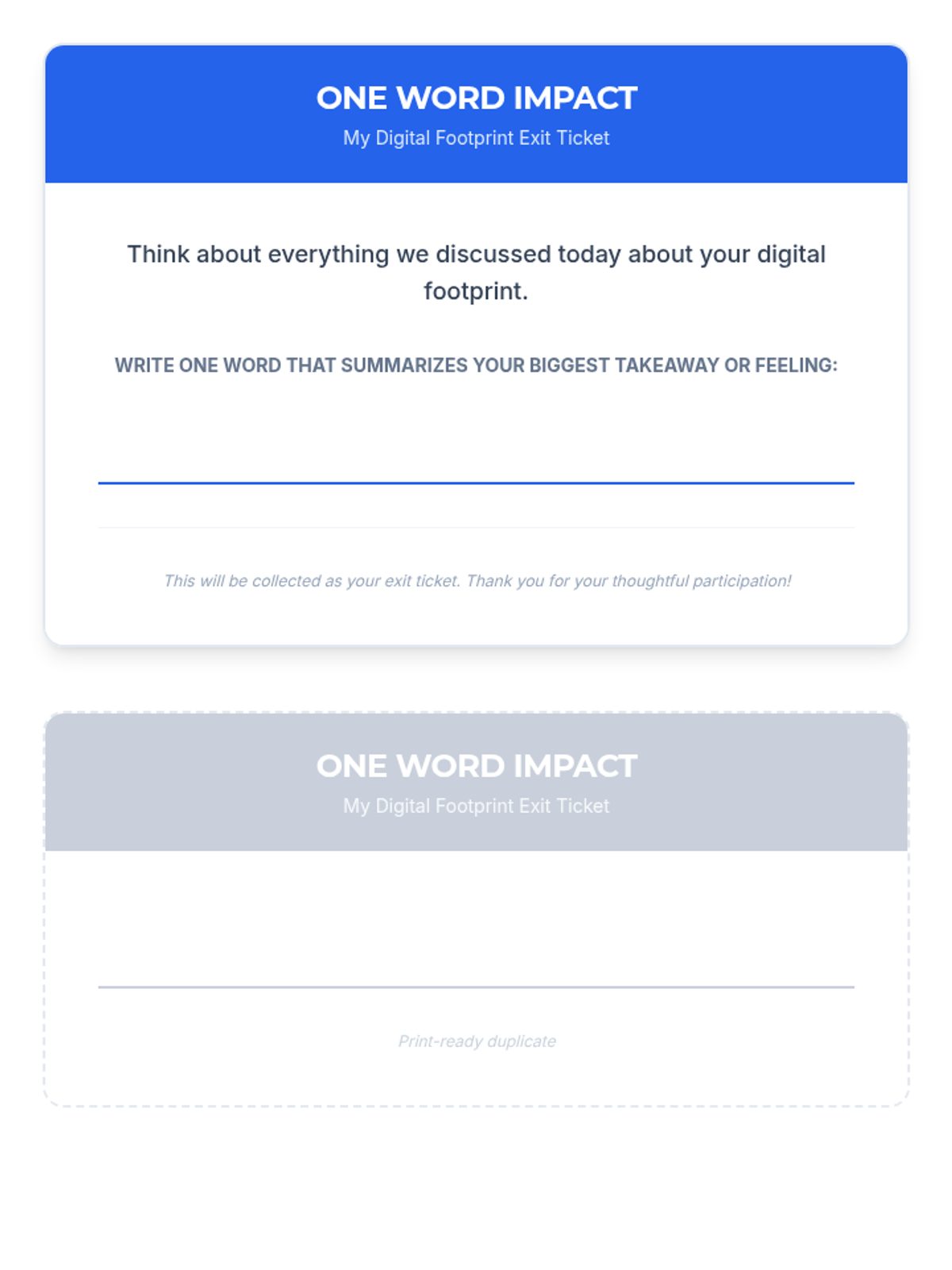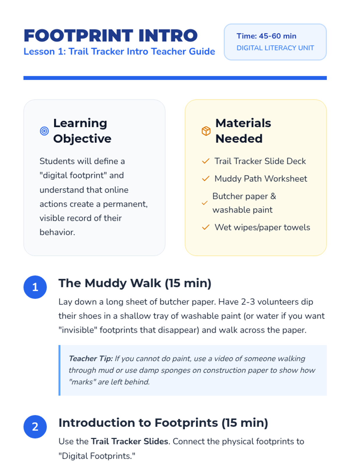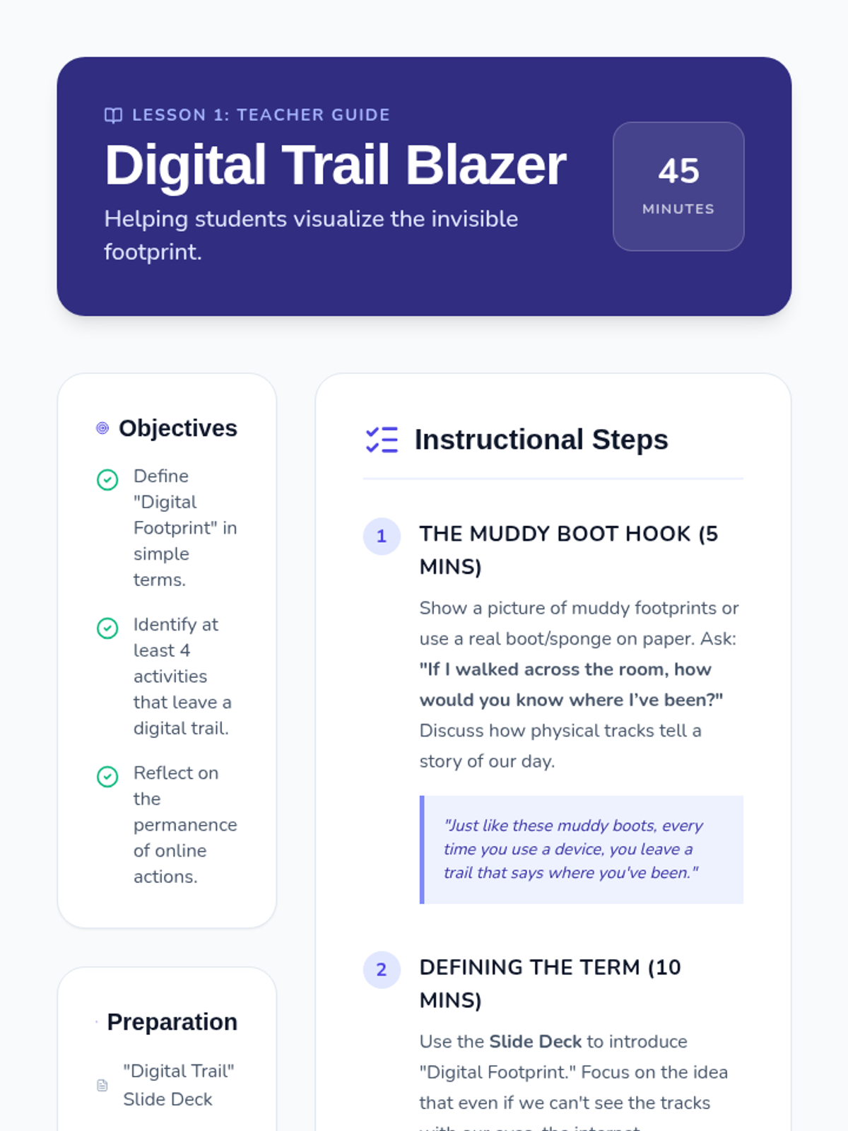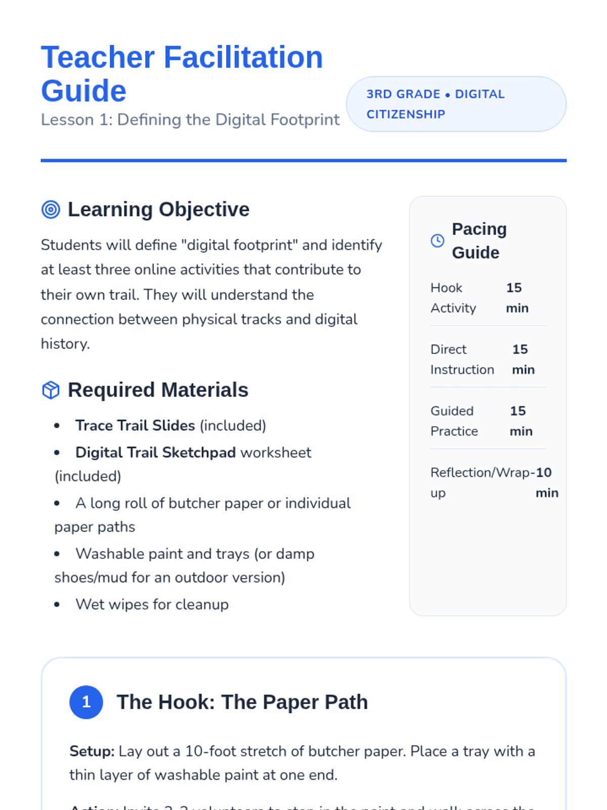A 3rd-grade sequence focused on the permanence of online actions and building a positive digital reputation through the metaphor of a 'digital footprint'. Students learn that every click and post leaves a trail, exploring themes of digital permanence and responsible communication.