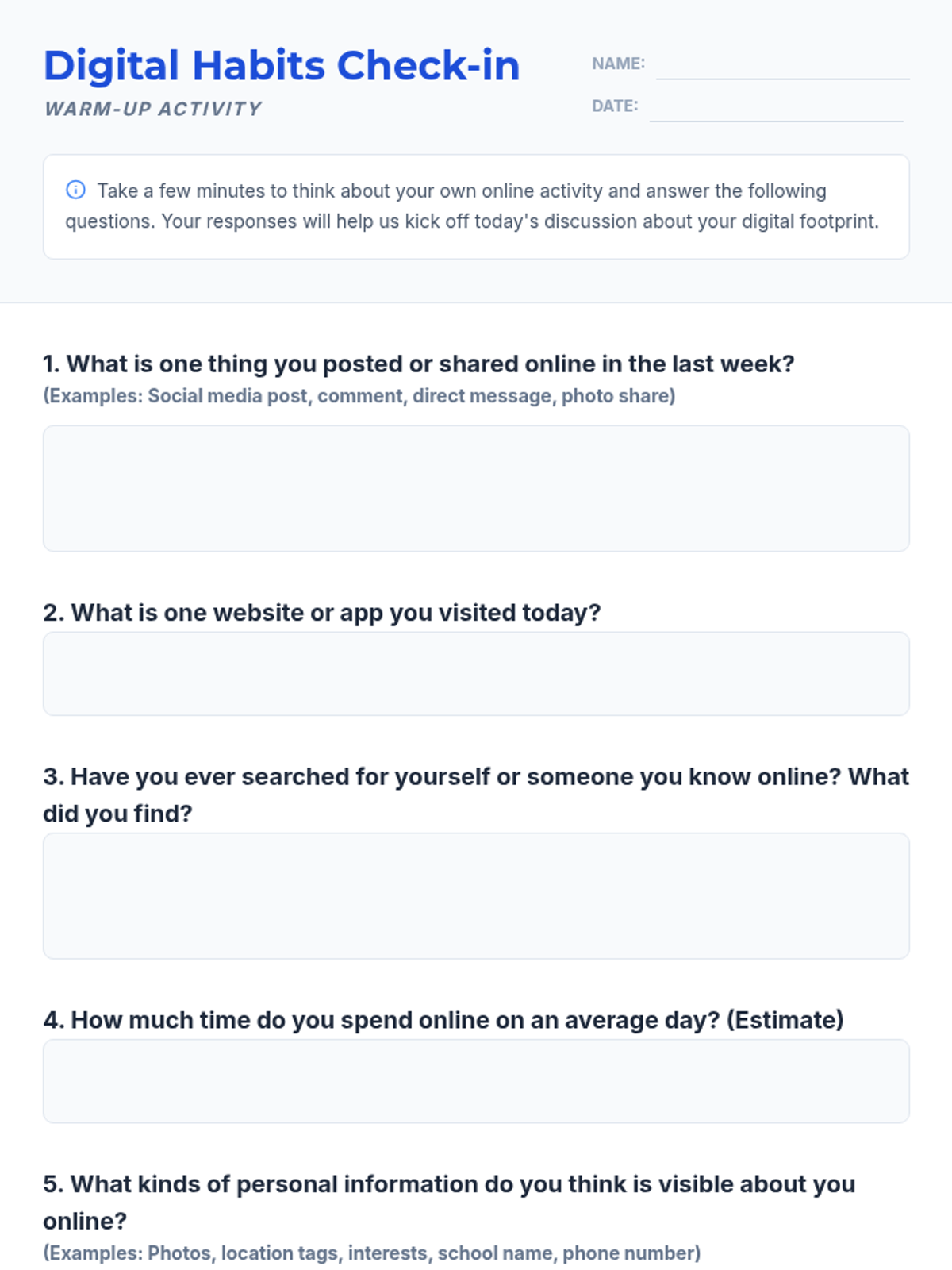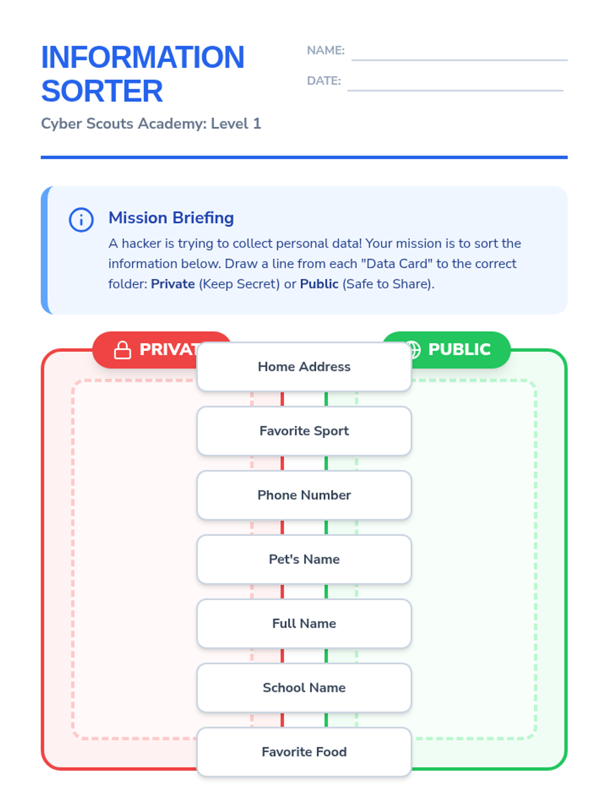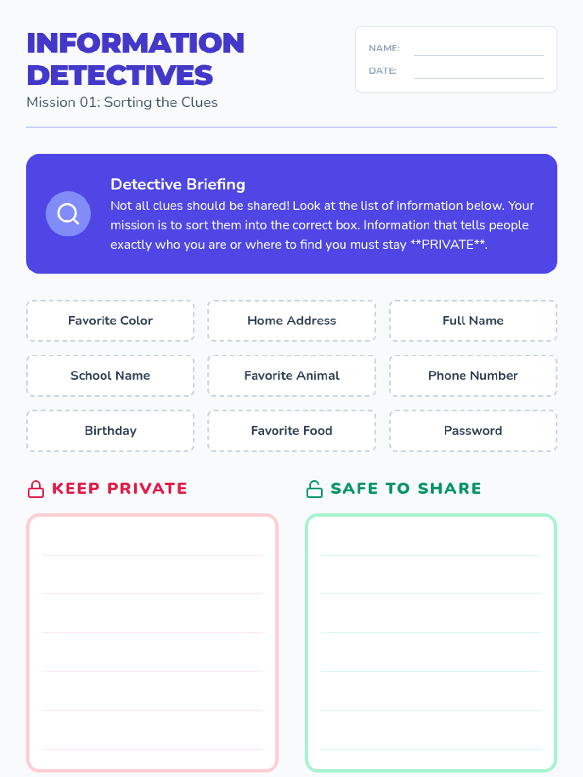 A comprehensive 5-lesson unit for 3rd-grade students focused on navigating the digital world safely. Students learn to distinguish between public and private information, understand the permanence of their digital footprint, recognize online manipulation, practice kindness in digital spaces, and create a personal safety pledge.