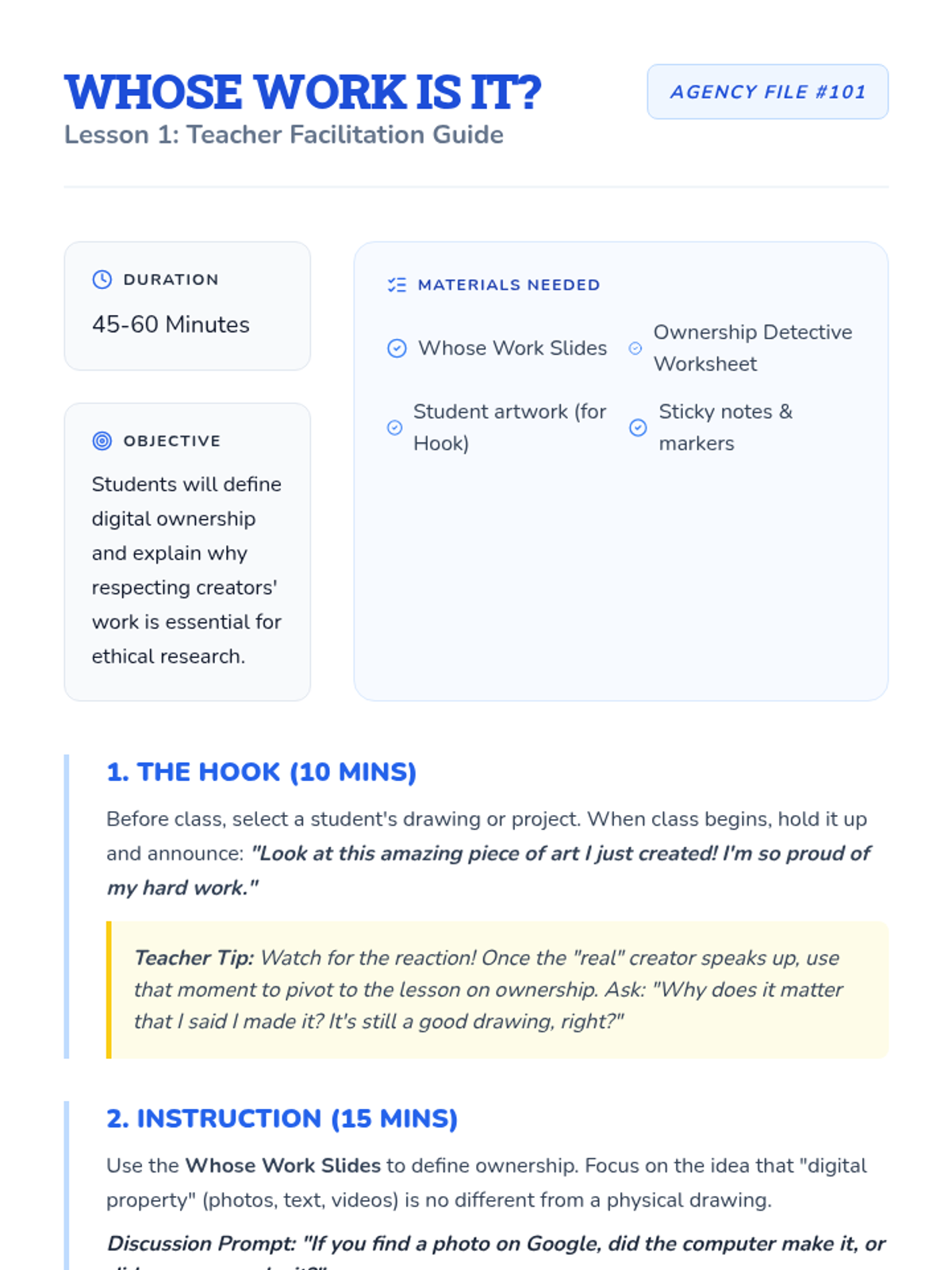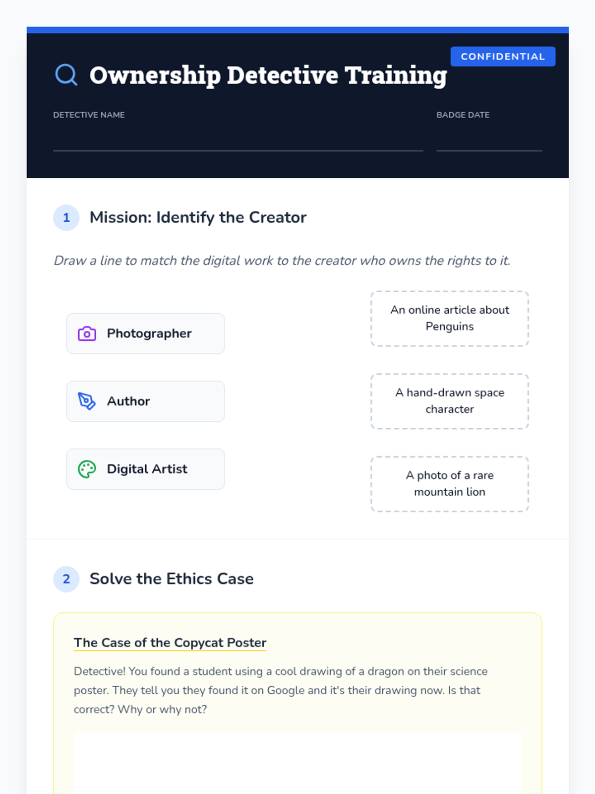A 3rd-grade sequence on digital ownership, ethical research, and citation basics using a 'Digital Detective' theme. Students learn to respect creators, distinguish facts from opinions, and attribute sources correctly.
