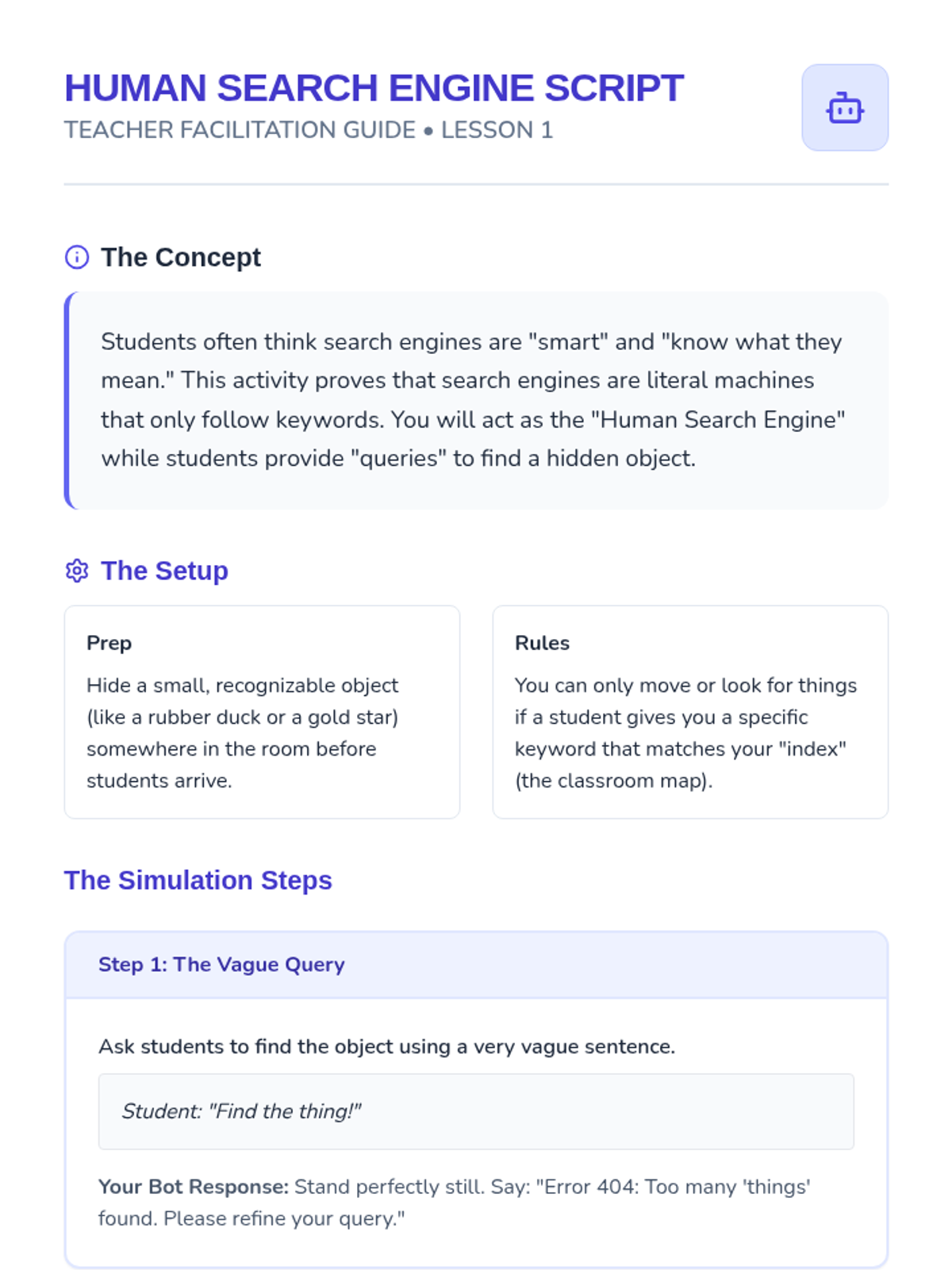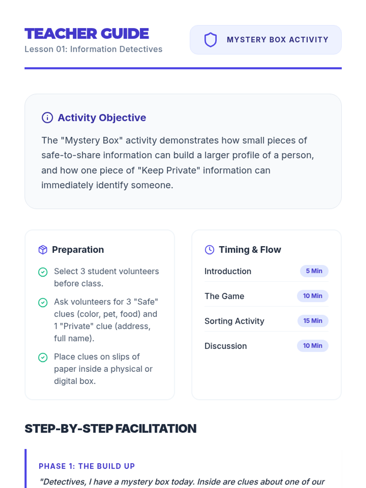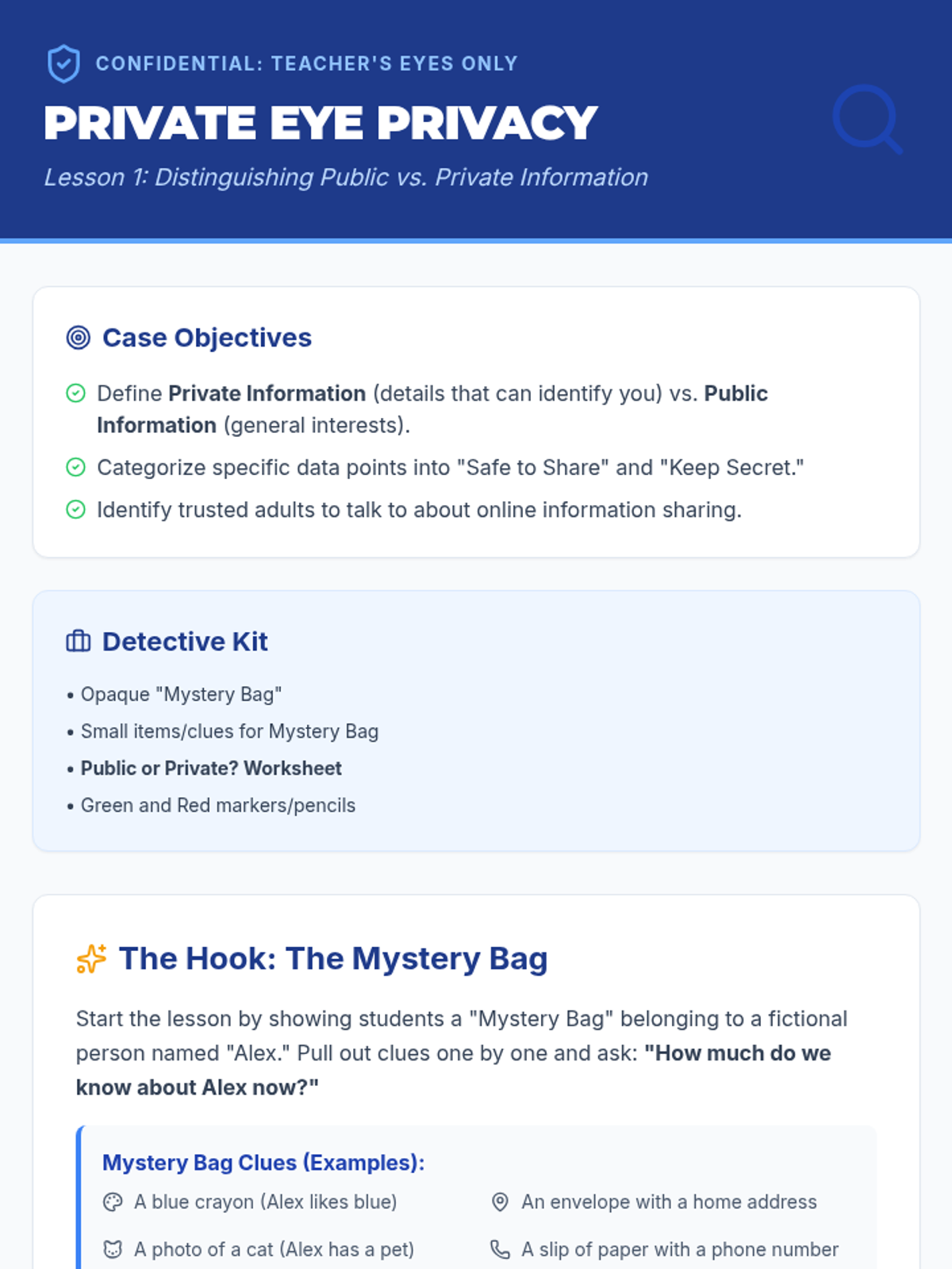 A comprehensive 3rd-grade sequence on digital literacy and online privacy. Students learn to distinguish personal info, create strong passwords, navigate privacy settings, and identify online strangers, culminating in a personal 'Digital Shield' safety plan.