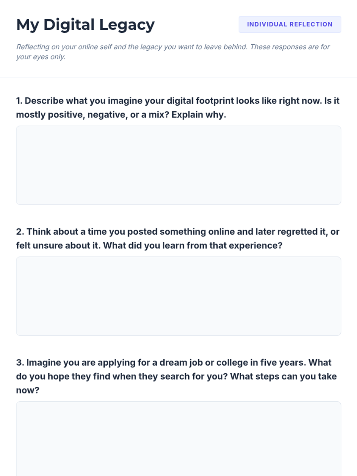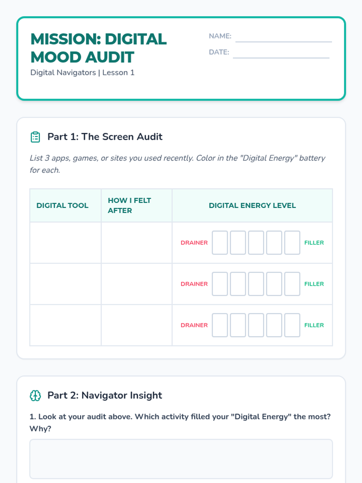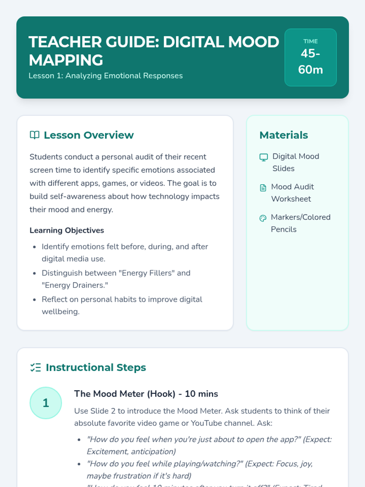 Students investigate the relationship between their digital habits and their emotional well-being through reflection, critical analysis, and practical goal-setting. The sequence covers emotional impacts of screen time, media literacy (curation vs. reality), cyberbullying intervention, physical health boundaries, and the creation of a personal Digital Wellness Pact.