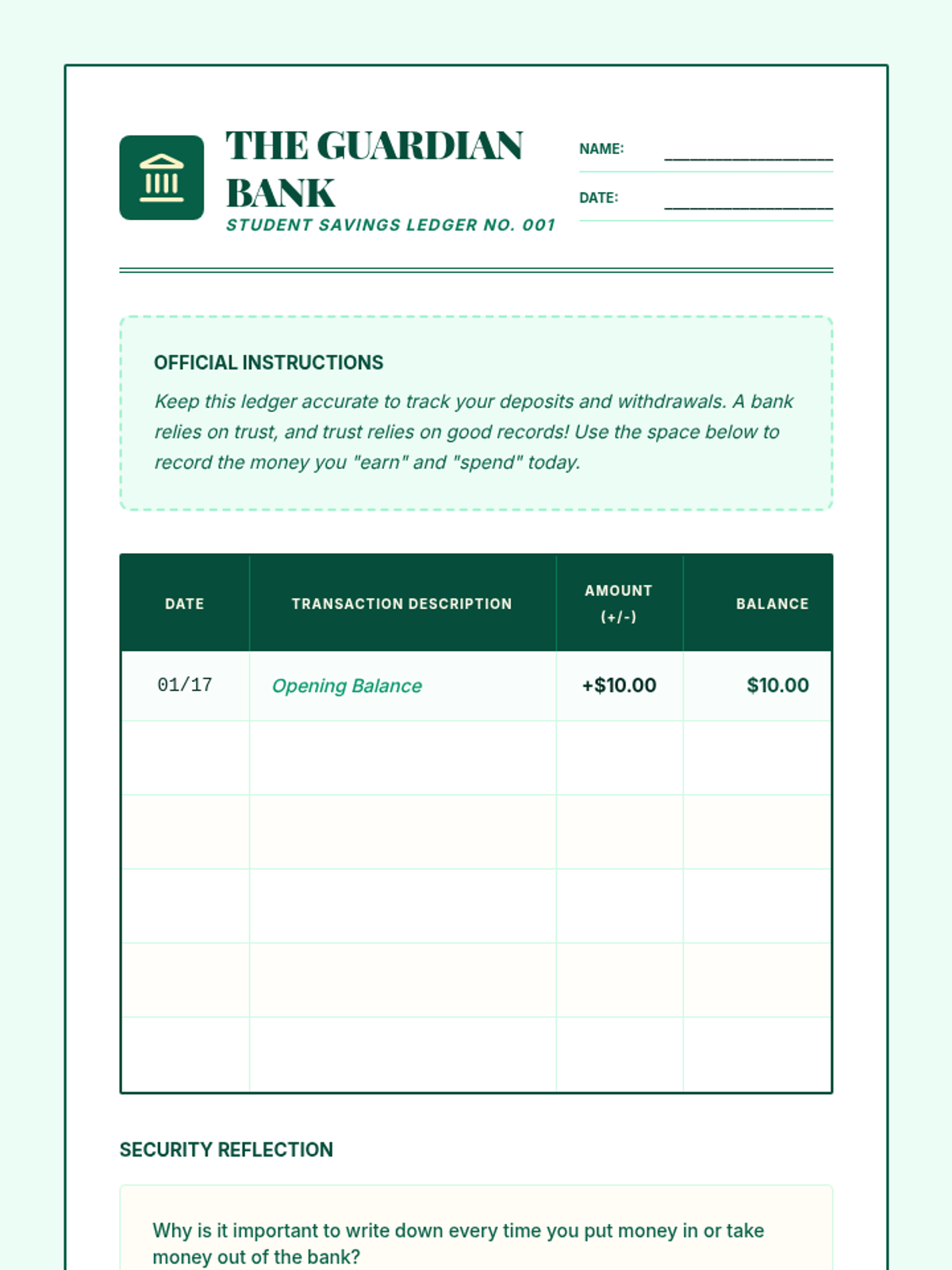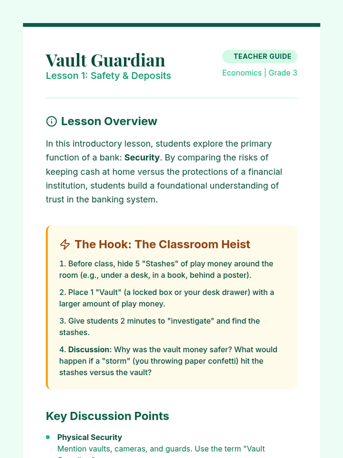 A 5-lesson sequence demystifying the role of banks as institutions that store money, lend capital, and facilitate the flow of currency. Students explore security, simple interest, lending systems, digital money, and participate in a final banking simulation.