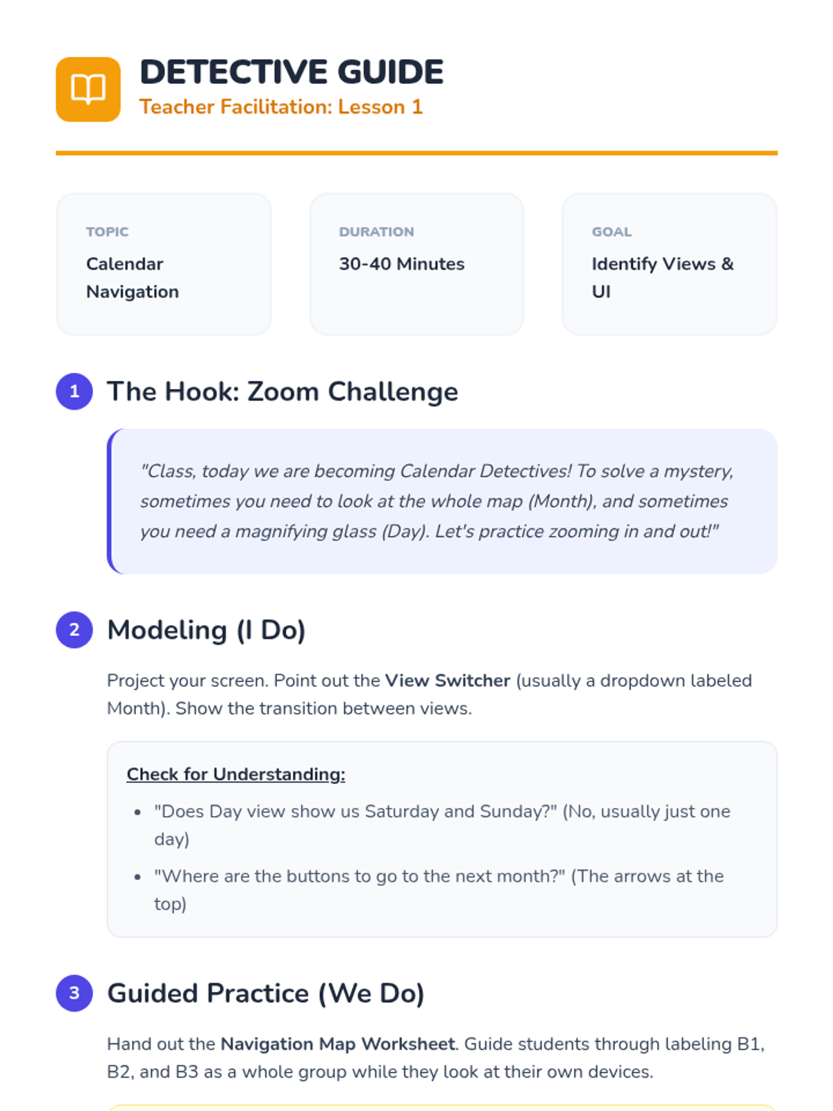 A sequence for 3rd Grade students to learn digital calendar navigation and entry. Designed for executive function support, students progress from basic interface navigation to creating and managing events.