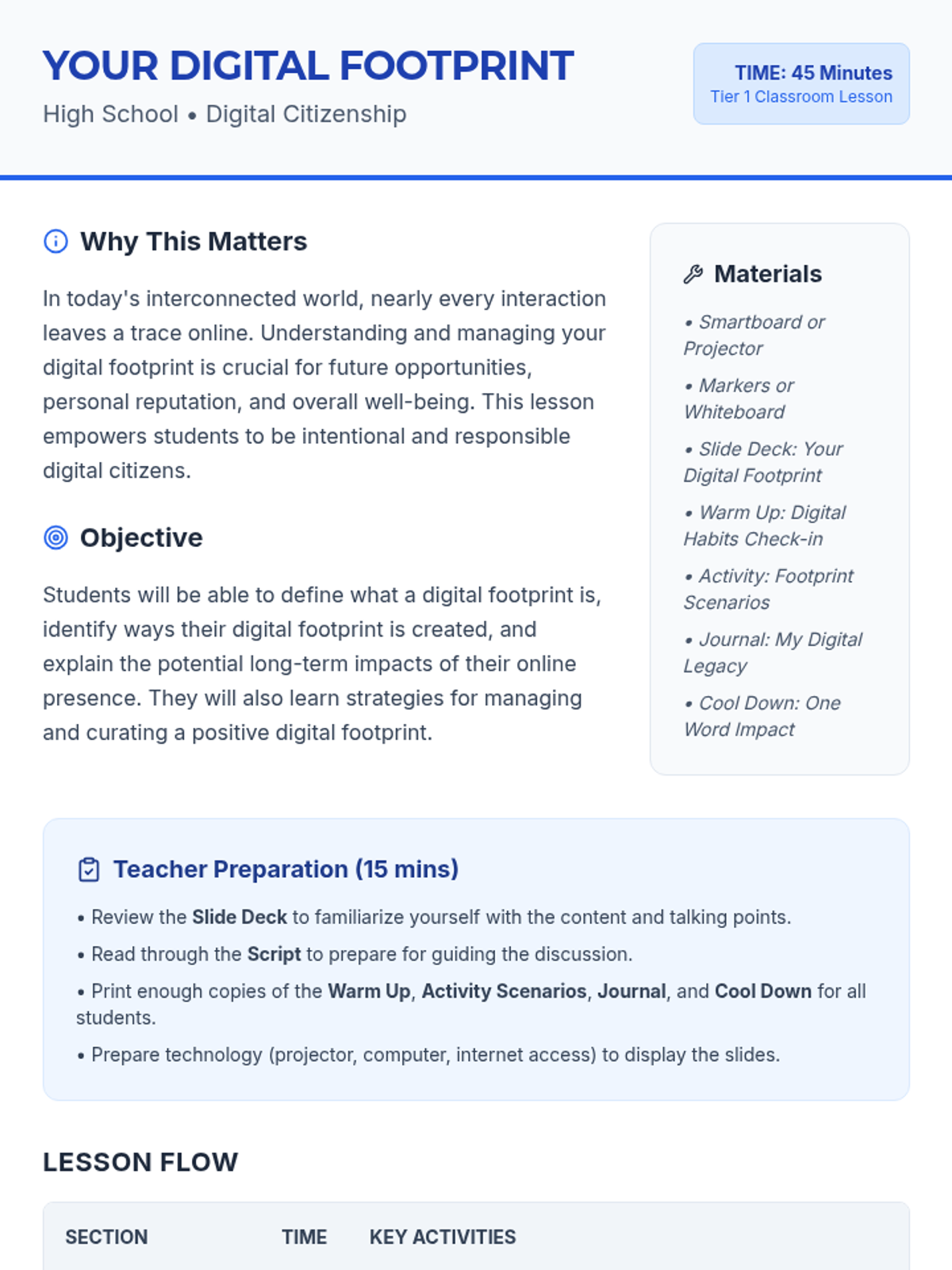 A collection of foundational classroom lessons covering digital citizenship for high schoolers and social-emotional group building for elementary students.