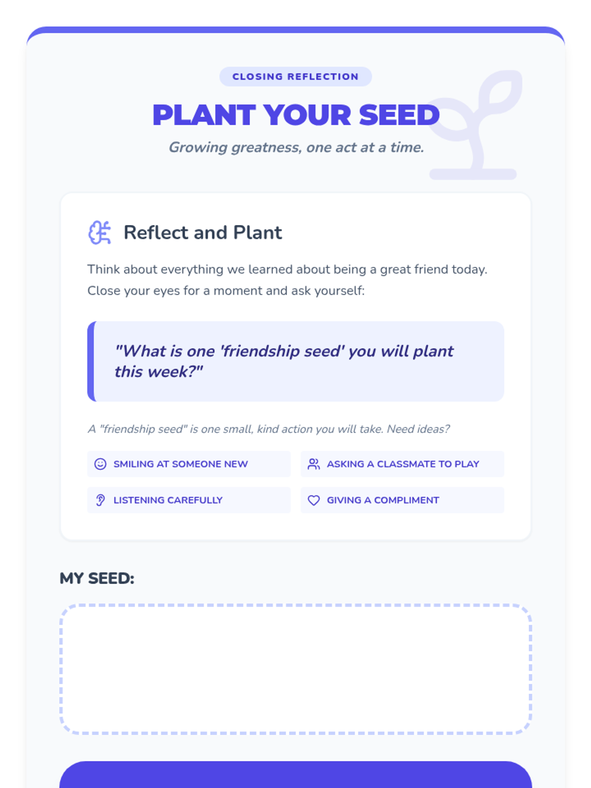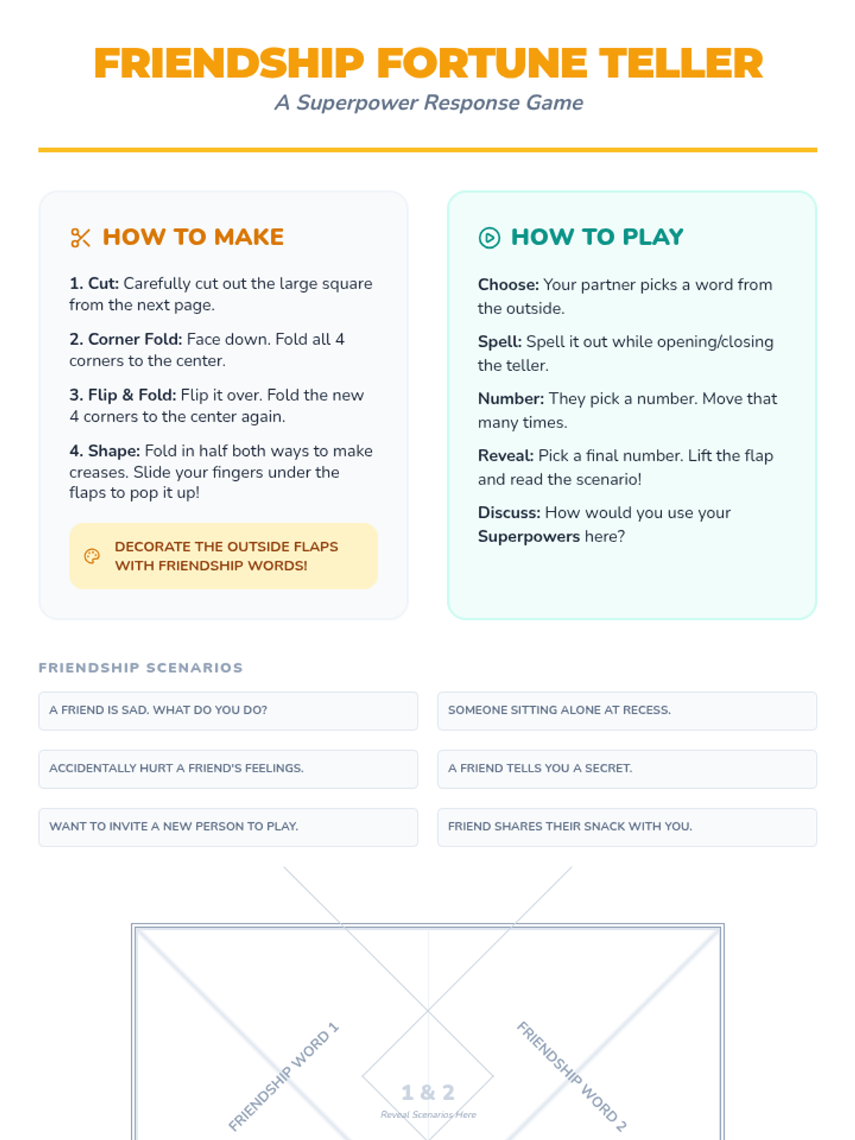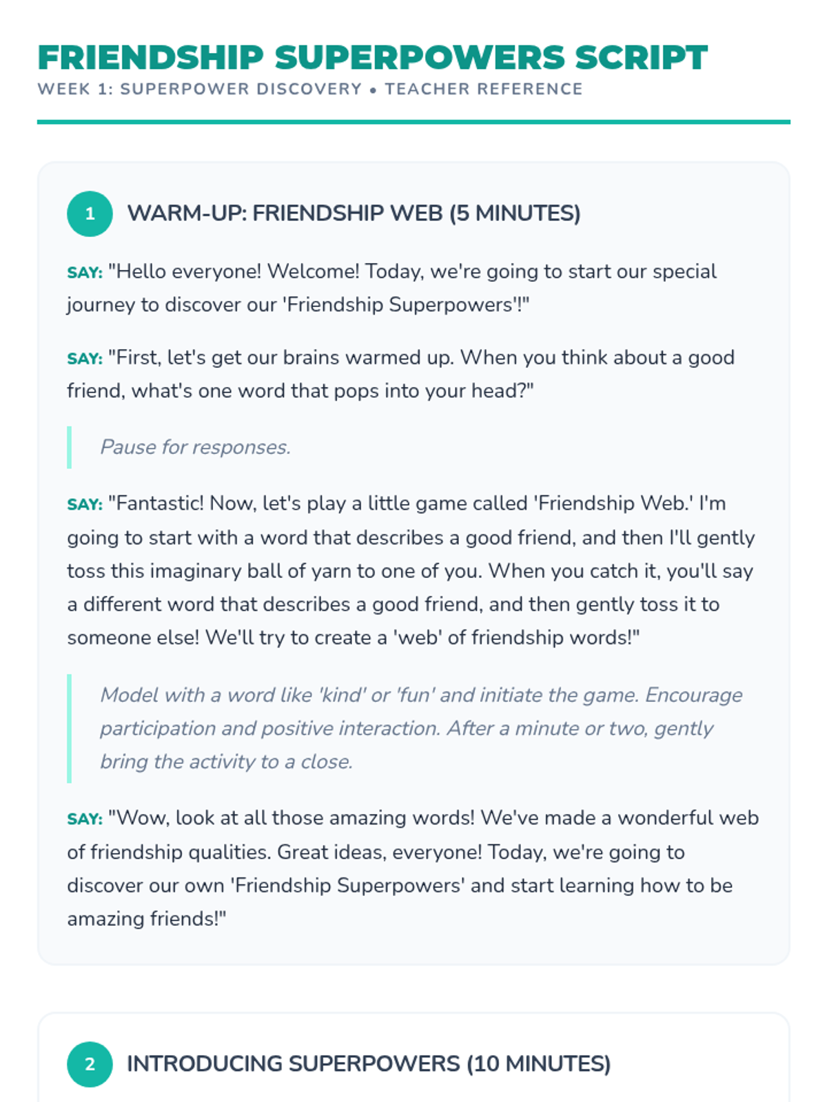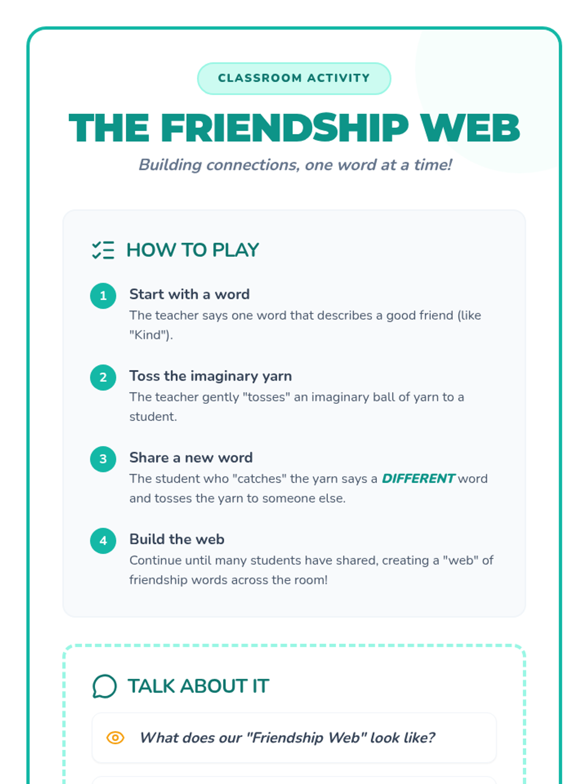 A 6-week social-emotional learning program and supplementary individual support lesson designed to help students understand friendship qualities, develop social skills, and process emotions. The program focuses on empathy, respect, and emotional resilience for primary students.