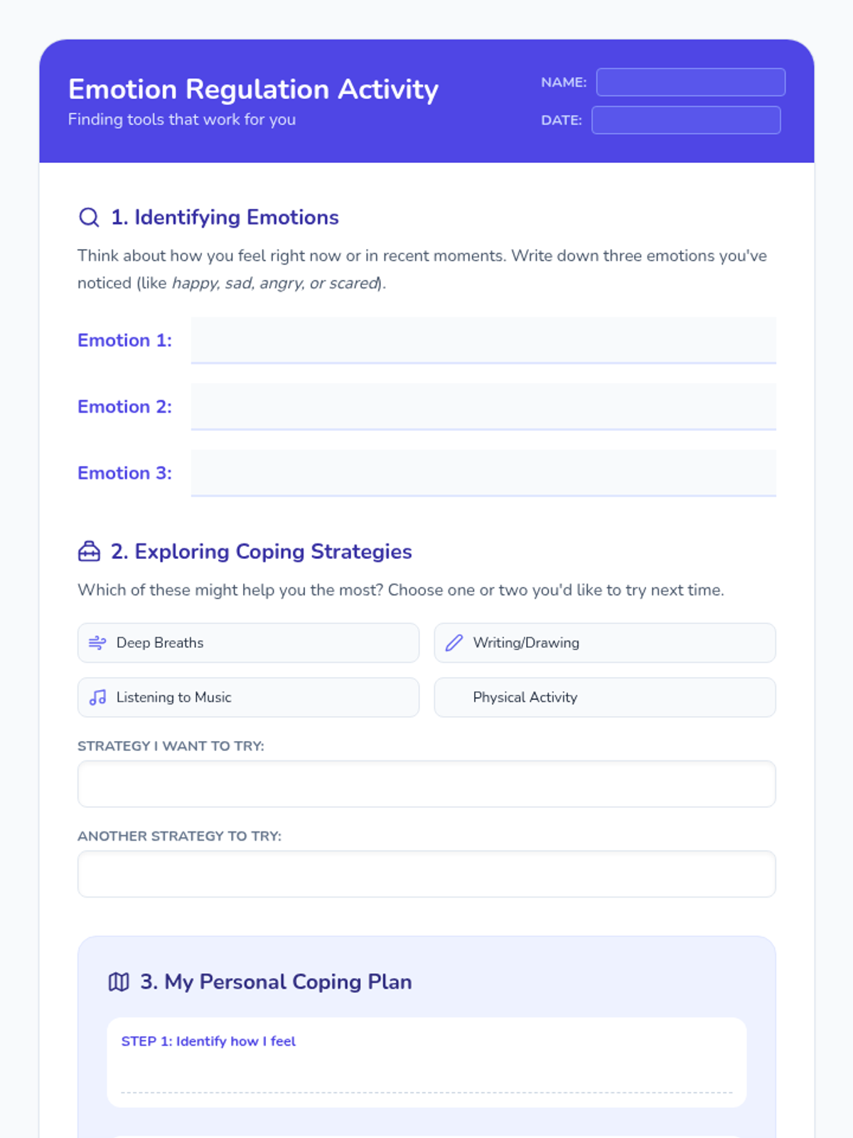 Counseling & Life SkillsSelf-AwarenessBasic Emotion RecognitionComplex Emotion IdentificationEmotional Nuance & Mixed FeelingsBuilding Positive Self-ImageRecognizing Strengths & Growth AreasAccurate Self-AssessmentPersonal Values IdentificationCultural & Individual Identity ExplorationValues-Based Decision MakingSelf-ManagementStop-and-Think StrategiesDelaying GratificationIndependent Impulse ManagementIdentifying Stress TriggersShort-Term Goal SettingSMART Goals DevelopmentGoal Monitoring & AdjustmentBuilding Perseverance & ResilienceInternal Motivation DevelopmentComprehensive Stress Reduction PlanningSocial AwarenessRecognizing Others' FeelingsDemonstrating EmpathyRespecting Individual DifferencesUnderstanding Cultural DiversityComplex Empathetic ResponsesMultiple Viewpoint ConsiderationMulti-Perspective AnalysisChallenging Stereotypes & BiasRelationship SkillsActive ListeningClear Verbal & Nonverbal CommunicationBuilding Positive FriendshipsWorking Cooperatively in GroupsCommunicating Personal BoundariesRespecting Others' BoundariesAssertive ExpressionPeaceful Problem-SolvingContributing to Team GoalsComplex Conflict NavigationMediation & NegotiationHealthy Romantic RelationshipsResponsible Decision-MakingDaily Problem IdentificationBrainstorming Multiple SolutionsEvaluating Pros & ConsRecognizing Risks & ConsequencesApplying Ethical FrameworksInformed Risk-Benefit DecisionsRoot Cause AnalysisMindfulnessMindful BreathingBody Scan MeditationDaily Mindfulness ApplicationDaily Self-Care RoutinesBalancing Life DemandsAdvocating for Wellness NeedsMental Health SupportUnderstanding Anxiety SymptomsWorry Management StrategiesProgressive Muscle RelaxationRecognizing Depression SignsBuilding Mood-Supporting RoutinesBehavioral Activation for MoodUnderstanding Grief StagesHealthy Grief CopingCreative Expression of LossBehavioral SupportDaily Check-In ProceduresDaily Goal Setting & ReviewRecognizing Escalation Warning SignsRequesting Breaks & SupportSelf-Calming During DistressUnderstanding Positive ReinforcementToken Economy ImplementationBehavior Chart TrackingAnalyzing Behavior PatternsIdentifying Antecedents & ConsequencesDetermining Behavior FunctionFunction-Based InterventionsIndividualized Behavior ContractsData-Driven Behavior AdjustmentTherapeutic ApproachesThoughts-Feelings-Behaviors ConnectionRecognizing Thinking PatternsChallenging Negative ThoughtsPositive Self-Talk PracticeThought Record TrackingAdvanced Cognitive RestructuringComprehensive CBT PlansBehavioral Activation TechniquesBuilding Positive ExperiencesExposure Hierarchies for AnxietyPresent-Moment AwarenessNon-Judgmental ObservationSelf-Soothing & DistractionComplex Emotion LabelingReducing Emotional Vulnerability (PLEASE)DEAR MAN CommunicationGIVE Skills for RelationshipsFAST Skills for Self-RespectRadical Acceptance PracticeCrisis Survival Skills (TIPP)Understanding Trauma EffectsTrauma Responses & TriggersIdentifying Trauma FeelingsGrounding TechniquesRegulation During Trauma DistressSafe Place VisualizationProcessing Through NarrativeDeveloping Trauma StoryPersonalized Safety PlanningGroup SupportTurn-Taking & SharingGroup Conversation SkillsSharing in Supportive EnvironmentLearning from Similar ChallengesBuilding Community & BelongingNavigating Peer RelationshipsGroup Skill PracticeGroup Mental Health EducationStress & Anxiety UnderstandingCrisis Support & SafetyKnowing When to Seek HelpIdentifying Mental Health CrisesGrounding During CrisisUsing Crisis HotlinesBuilding Support NetworksAccessing Mental Health ResourcesWarning Signs & Coping StrategiesDeveloping Personal Safety PlansUnderstanding Suicide Warning SignsGatekeeper Skills for PeersDigital LiteracySocial MediaTechnology BasicsProductivity ToolsInternet and Online ResearchWeb Design and PublishingDigital CitizenshipOnline Safety and PrivacyEmerging TechnologiesFinancial LiteracyMaking Financial DecisionsBanking and AccountsConsumer SkillsSaving and InvestingCredit and DebtEmployment and IncomeTaxesInsuranceMajor PurchasesEconomic ConceptsFinancial PlanningCollege & Post-Secondary PlanningCareer ExplorationUnderstanding Post-Secondary OptionsCollege Research & SelectionAdmission RequirementsCollege Application ProcessPersonal Statement WritingFAFSA CompletionScholarship Search & ApplicationsUnderstanding Student LoansContinuing Education PlanningInterview PreparationResearching EmployersCommon Interview QuestionsSTAR Method ResponsesProfessional Interview PresenceVirtual Interview SkillsInterview Follow-UpJob Search SkillsUnderstanding Job PostingsEffective Job Search StrategiesNetworking for OpportunitiesResume Writing BasicsAction Verbs & AchievementsTailoring Resumes to JobsCover Letter WritingProfessional ReferencesProfessional CommunicationBusiness Email EtiquettePhone & Voicemail ProfessionalismMeeting ParticipationPresentation SkillsProfessional Work EthicTime Management & ProductivityTeamwork & CollaborationAdaptability & FlexibilityProblem-Solving at WorkConstructive FeedbackWorkplace RightsUnderstanding Employment LawsPay & Benefits UnderstandingWorkplace SafetyAnti-Discrimination & Harassment