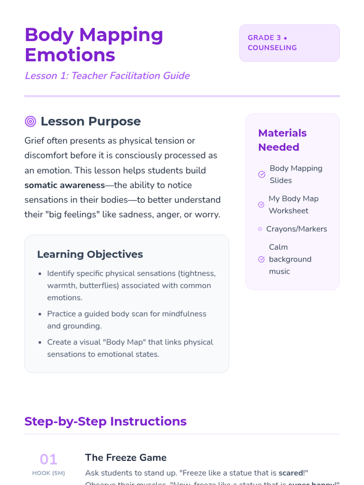 A 5-lesson sequence for 3rd grade focused on using somatic awareness, movement, and storytelling to process grief and loss. Students explore where emotions live in the body and use creative arts to express and release complex feelings.