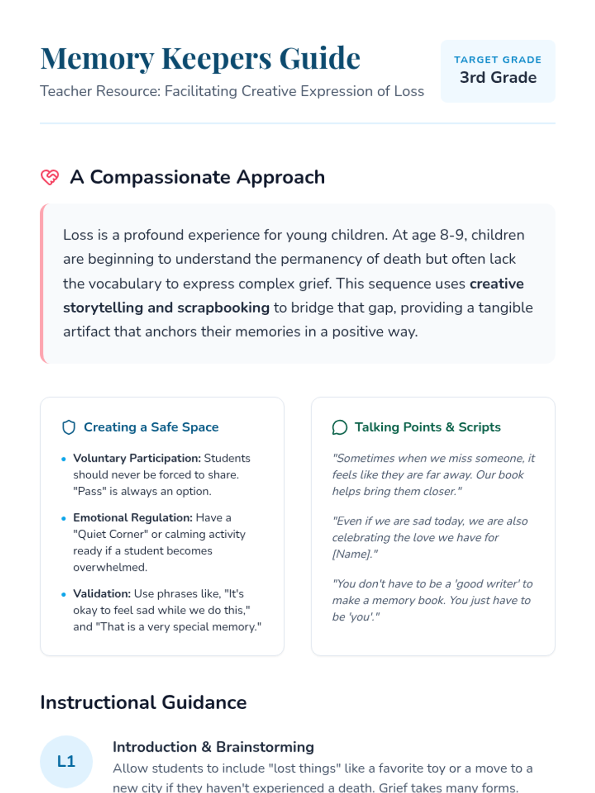 This 5-lesson sequence for 3rd-grade students provides a safe, creative space to process loss through the creation of a 'Memory Book'. Students learn to preserve connections to loved ones or pets by using sensory details, letter writing, and gratitude practices, culminating in a personalized comfort object and a toolkit of coping strategies.