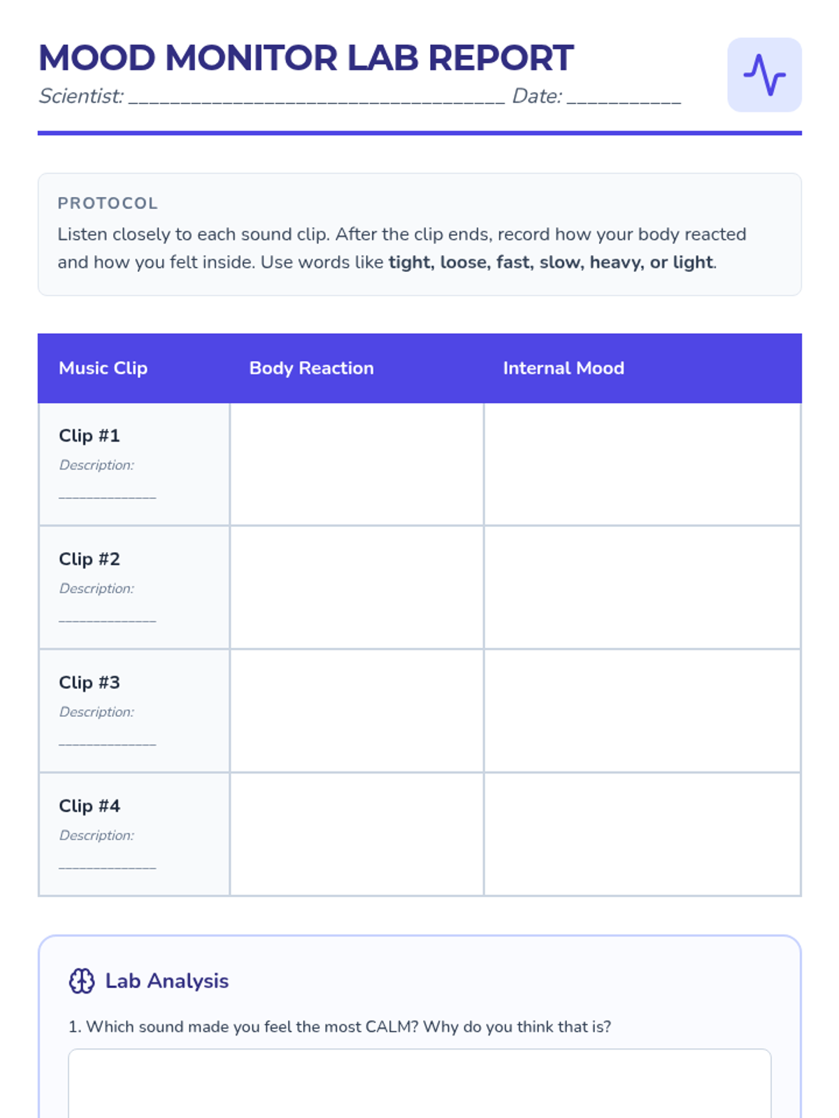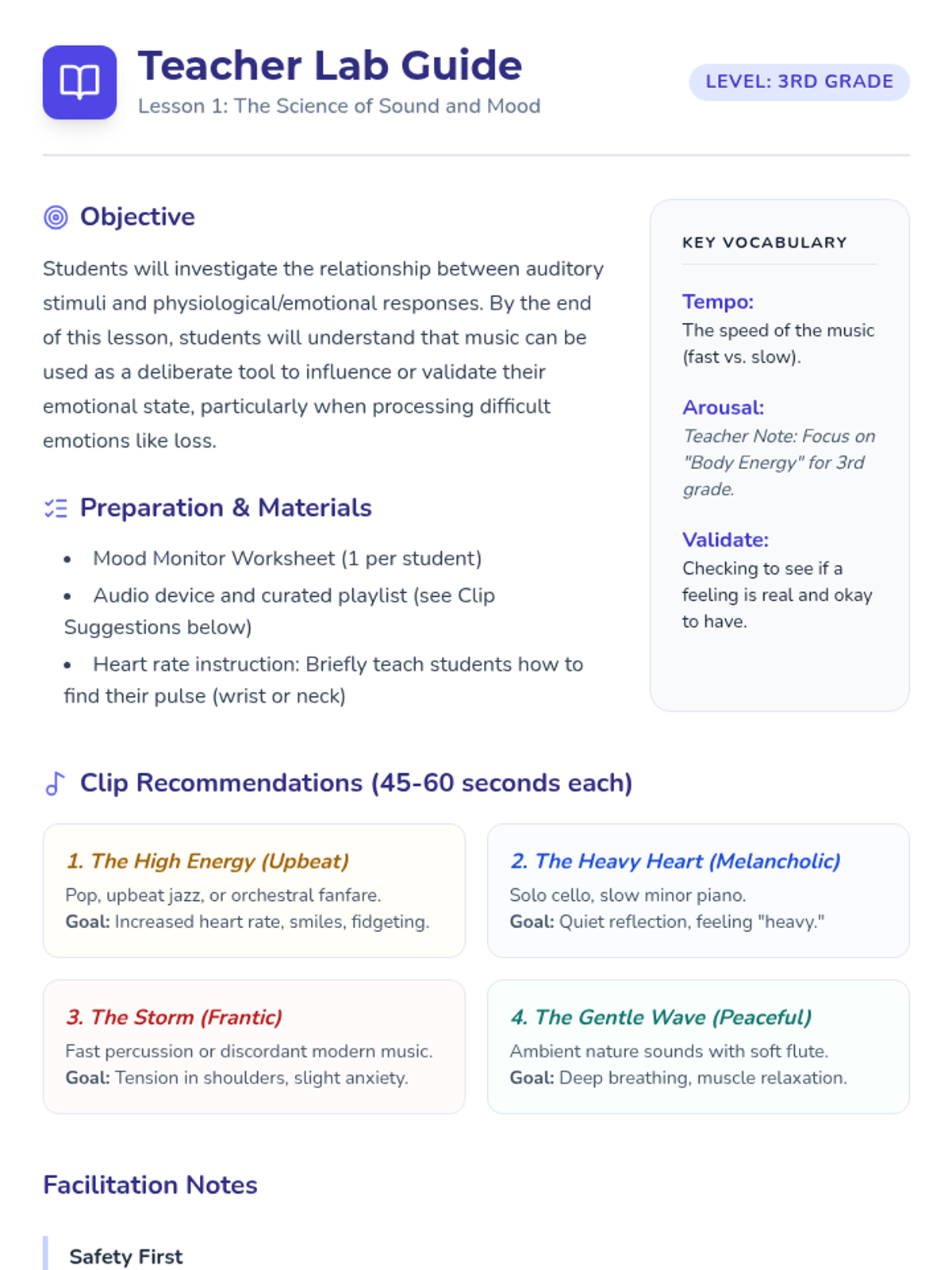 This sequence explores the connection between sound, music, and mood regulation for students experiencing loss. Students learn to identify how different tempos and tones mirror internal states and discover how to use sound to soothe themselves and express difficult feelings.
