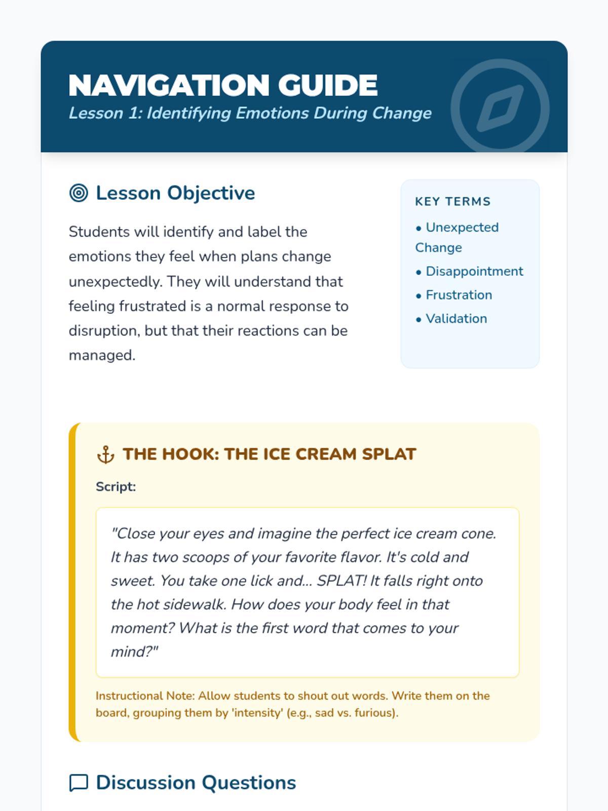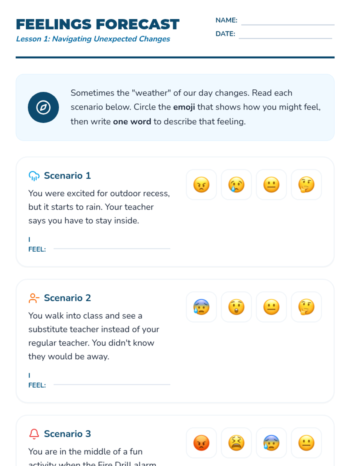 A sequence for 3rd Grade students focusing on cognitive flexibility and emotional regulation when plans change. Students learn to identify emotions, use calming strategies, and follow the 'Stop, Breathe, Ask' routine to manage transitions.
