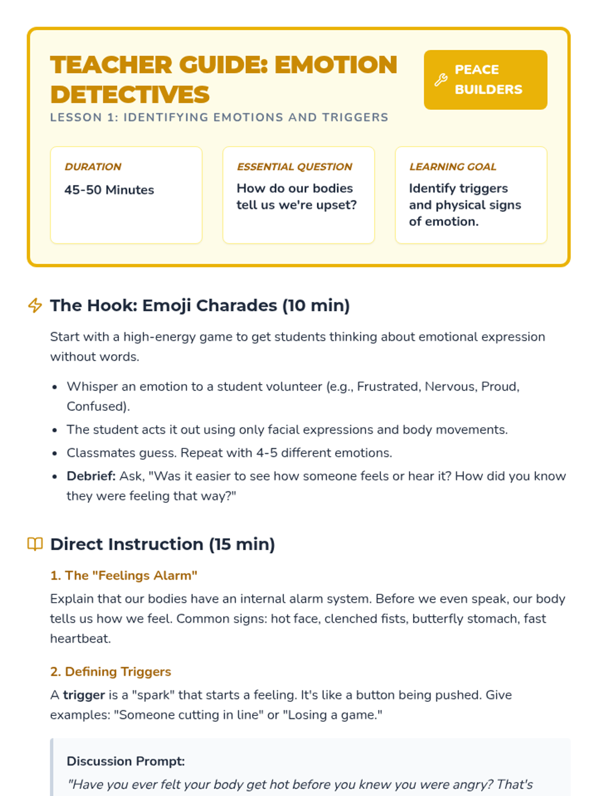 A comprehensive four-lesson series designed to help students identify their emotions, recognize physical triggers, build a coping toolbox, and align their reactions with the size of their problems.