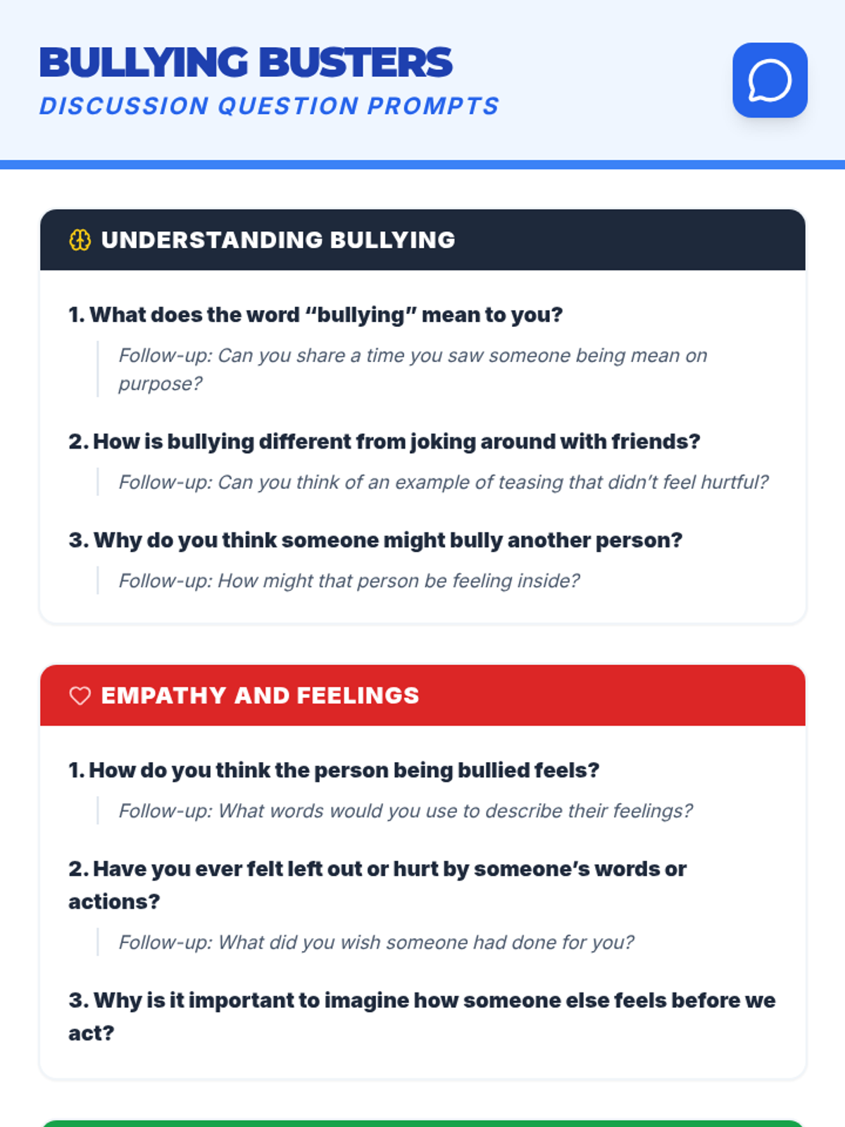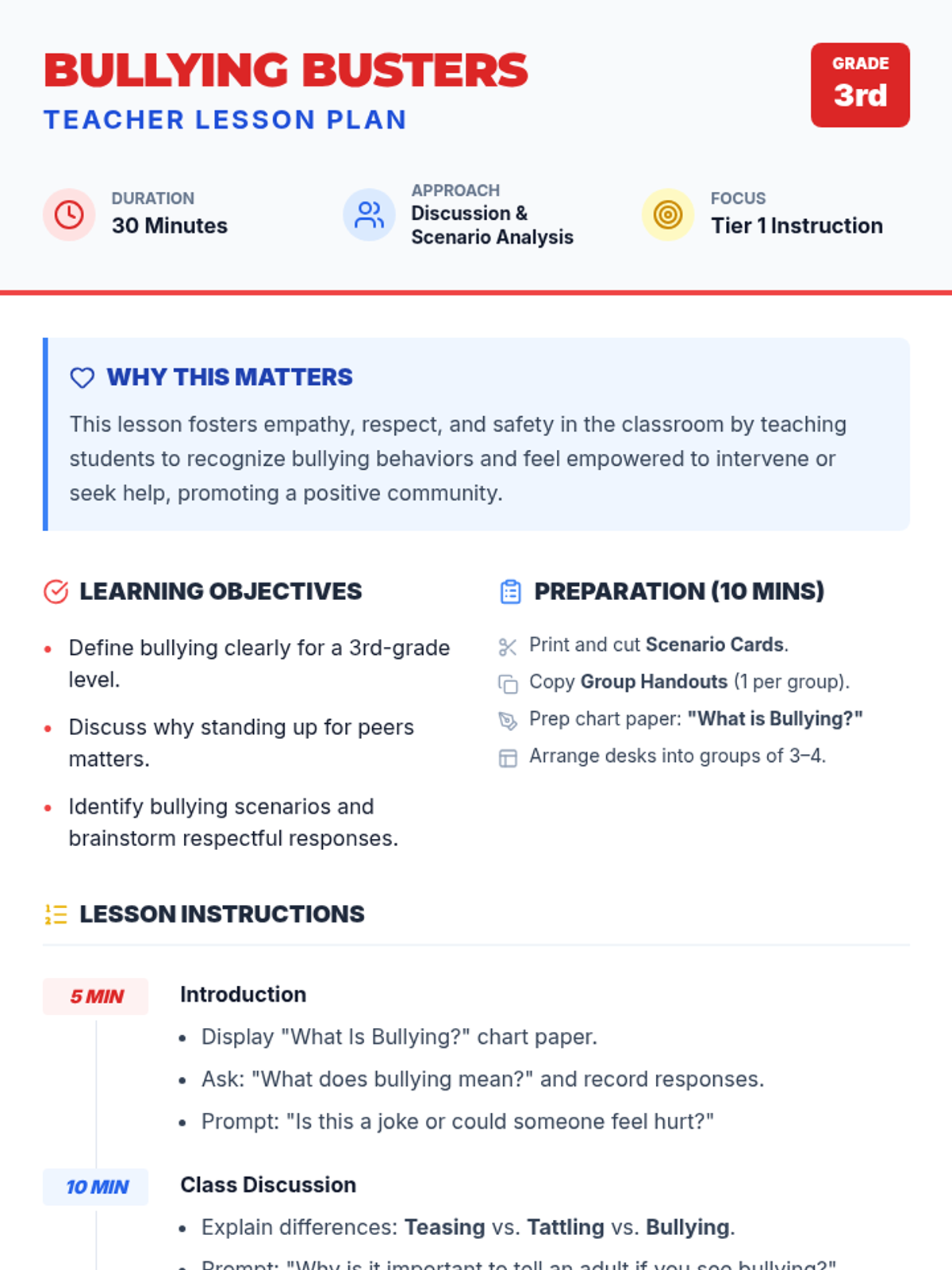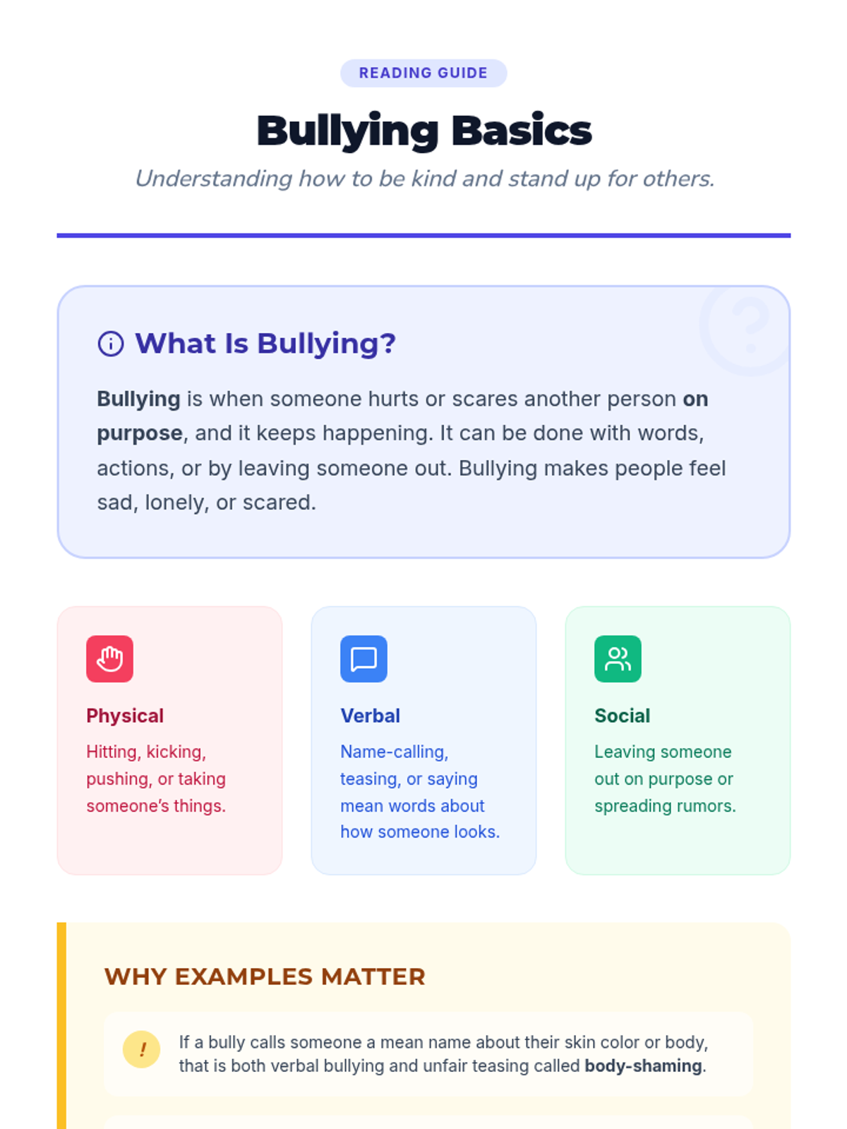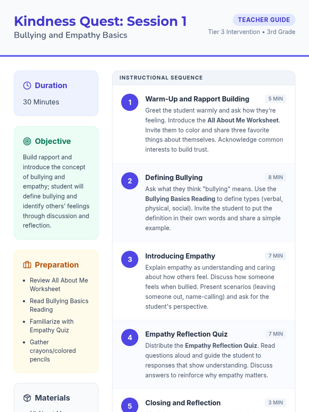 A six-lesson series for K-3 students with communication IEPs, specifically those who stutter. The sequence focuses on defining bullying, identifying feelings, building self-advocacy through brave words and I-statements, and fostering empathy to become upstanders.