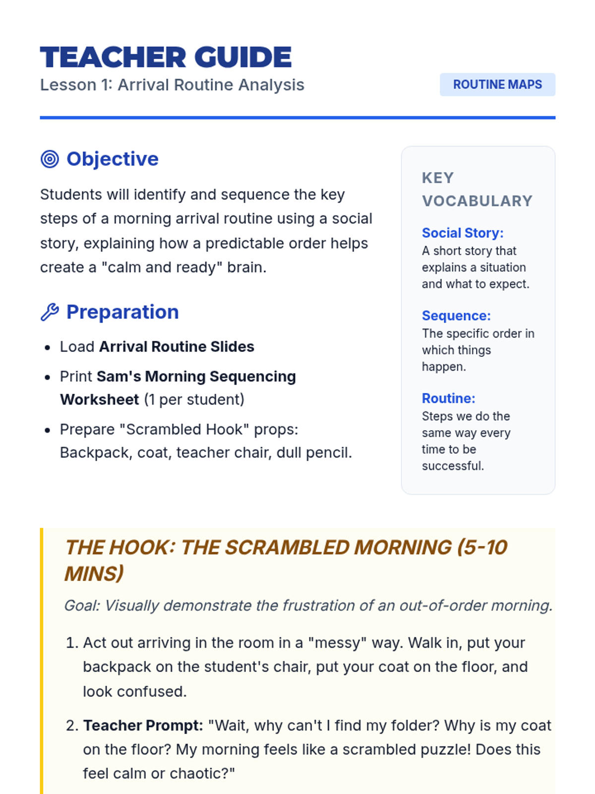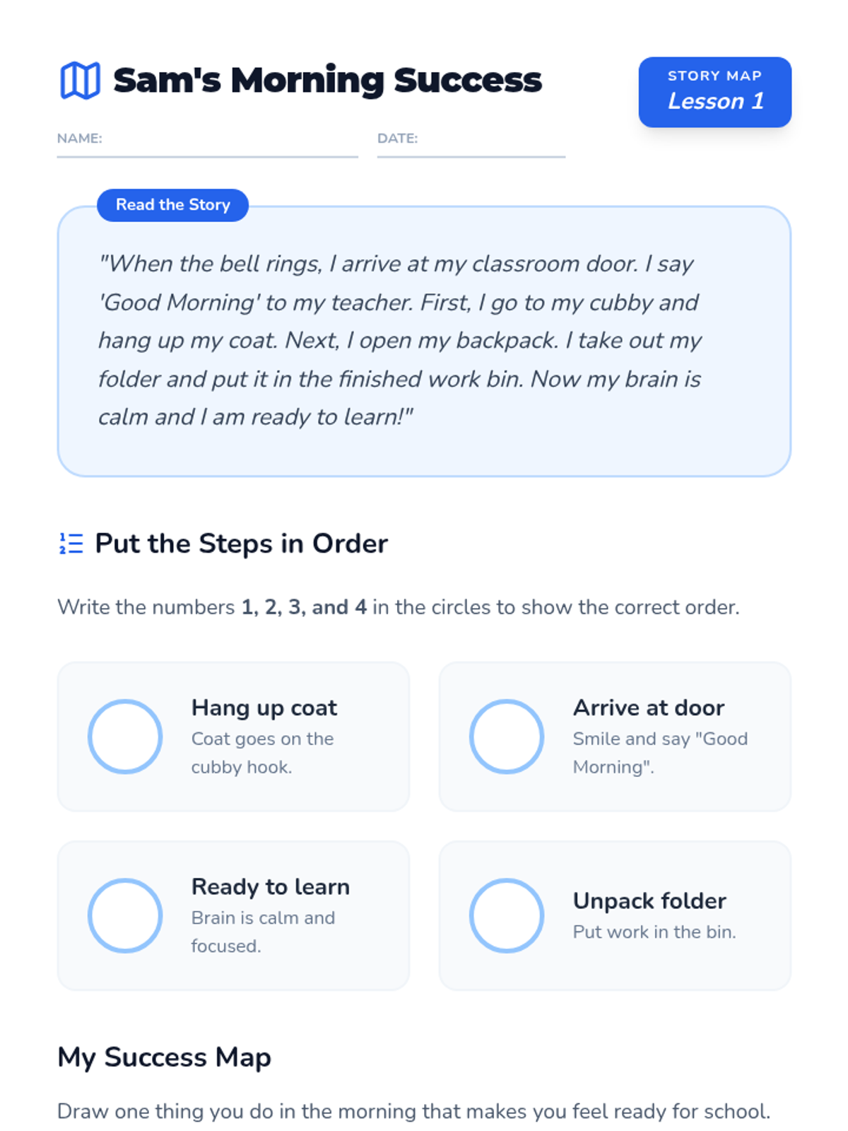 A 5-lesson sequence for 3rd-grade students focused on internalizing school routines through social stories. Students explore arrival, hallways, cafeteria, transitions, and dismissal to build self-regulation and community awareness.