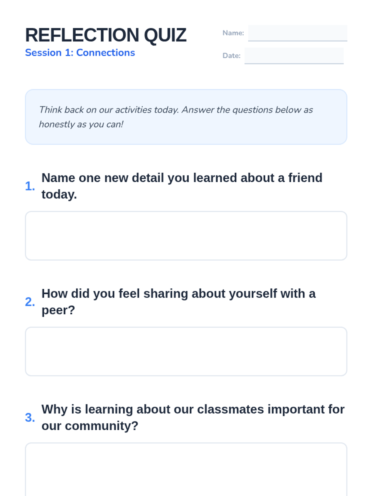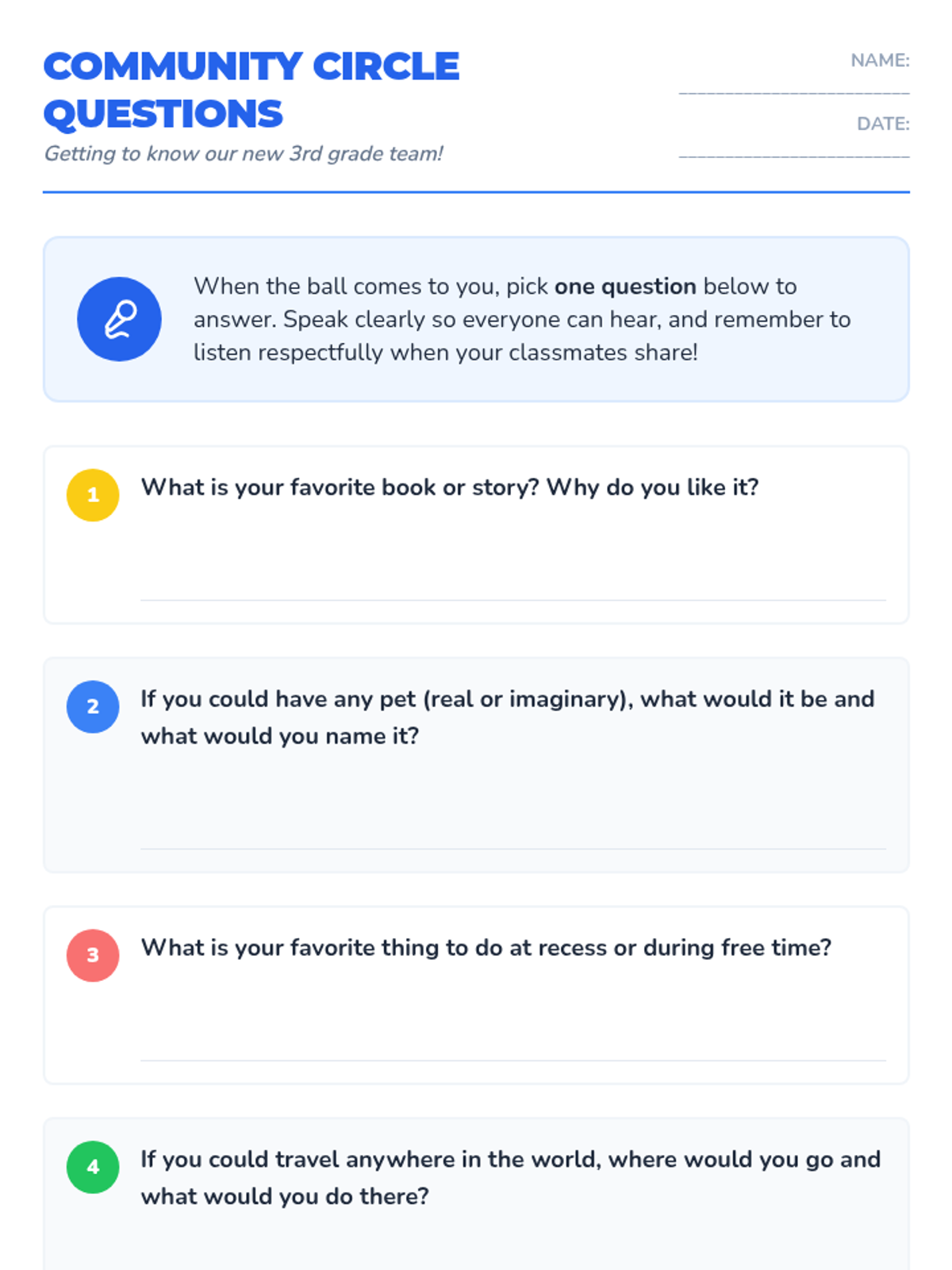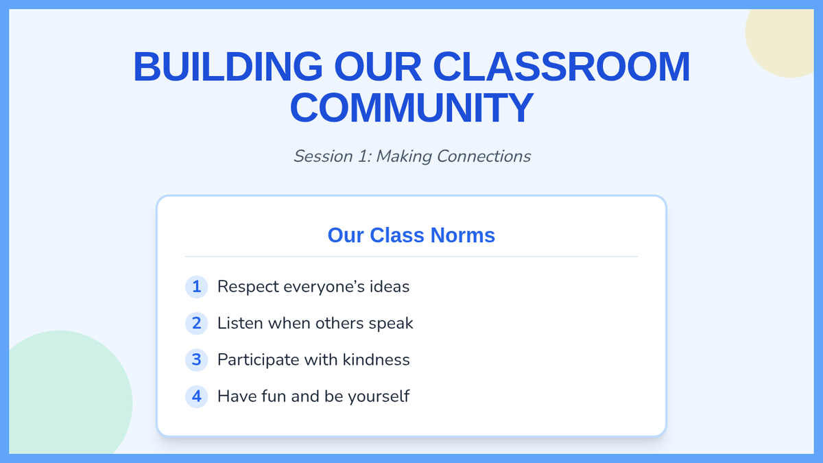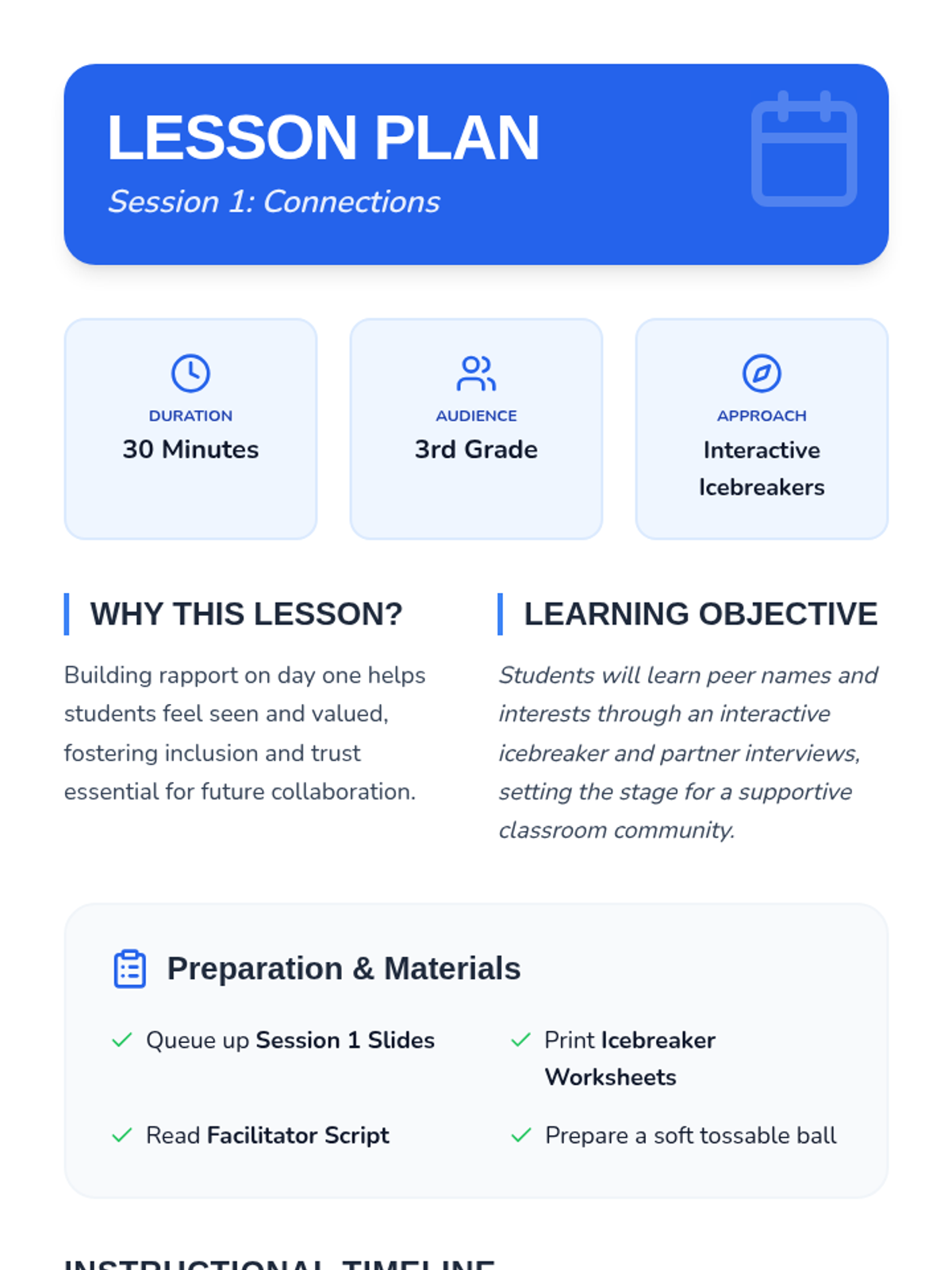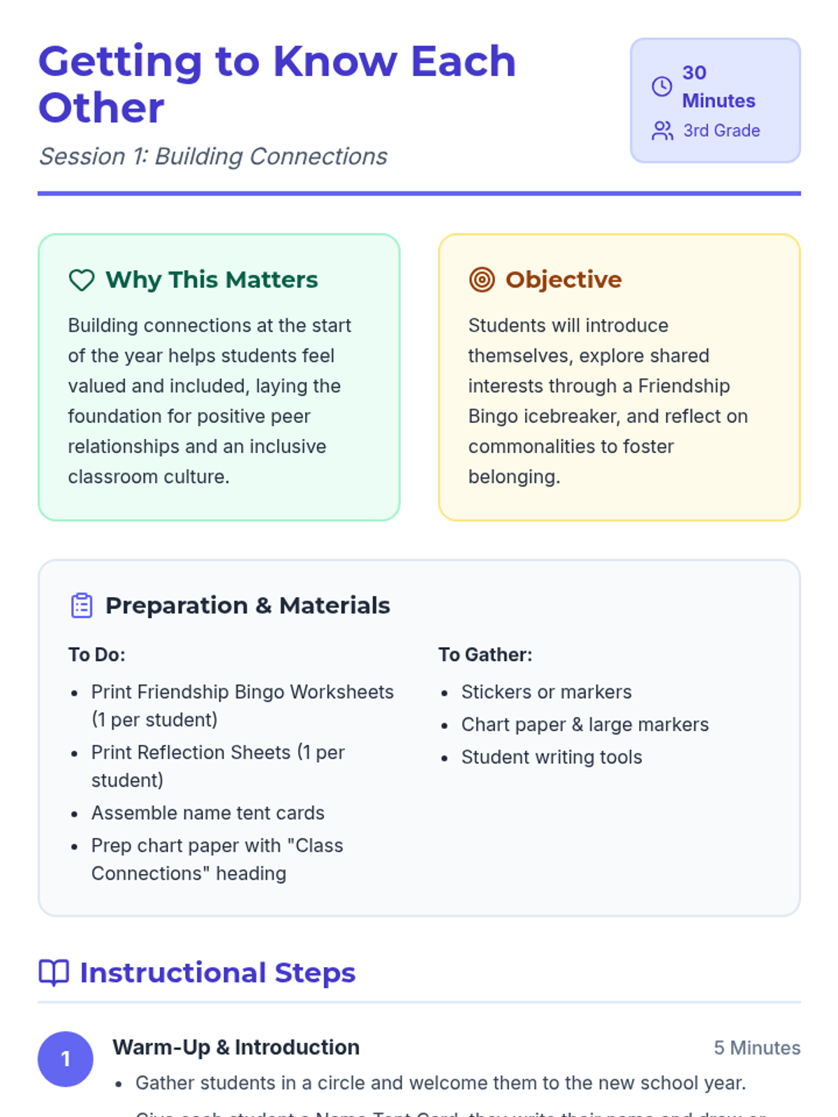 A 3-session unit for 3rd graders designed to build belonging and inclusion through interactive icebreakers, collaborative norm-setting, and personal storytelling. students will connect through shared interests, establish community standards, and celebrate their unique strengths.