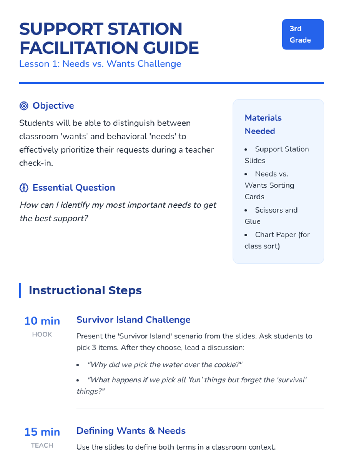 A sequence focused on social-emotional communication skills for 3rd graders, teaching them how to advocate for their behavioral needs and support discreetly and respectfully.