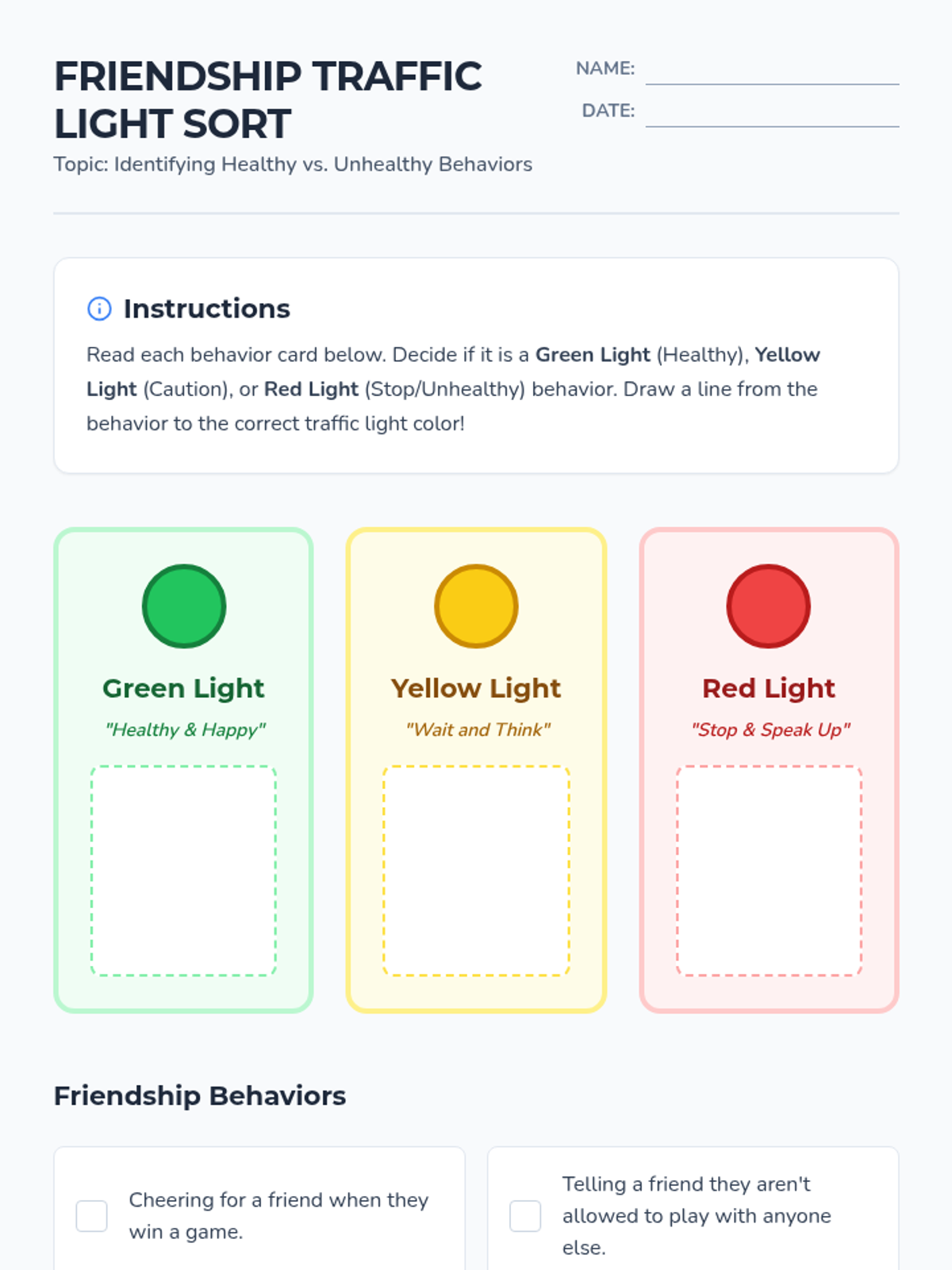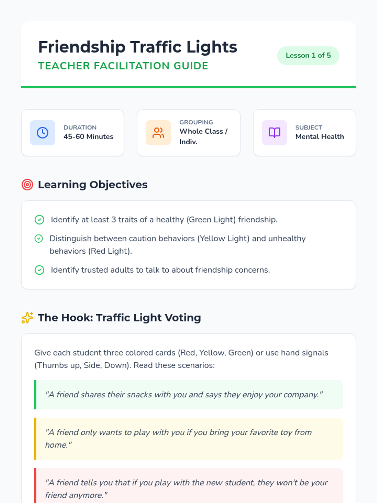 A 5-lesson unit where students become 'Friendship Detectives' to identify healthy and unhealthy relationship dynamics. Using case studies, sorting games, and creative projects, students learn to recognize green and red flags, distinguish between teasing and bullying, and resolve conflicts safely.