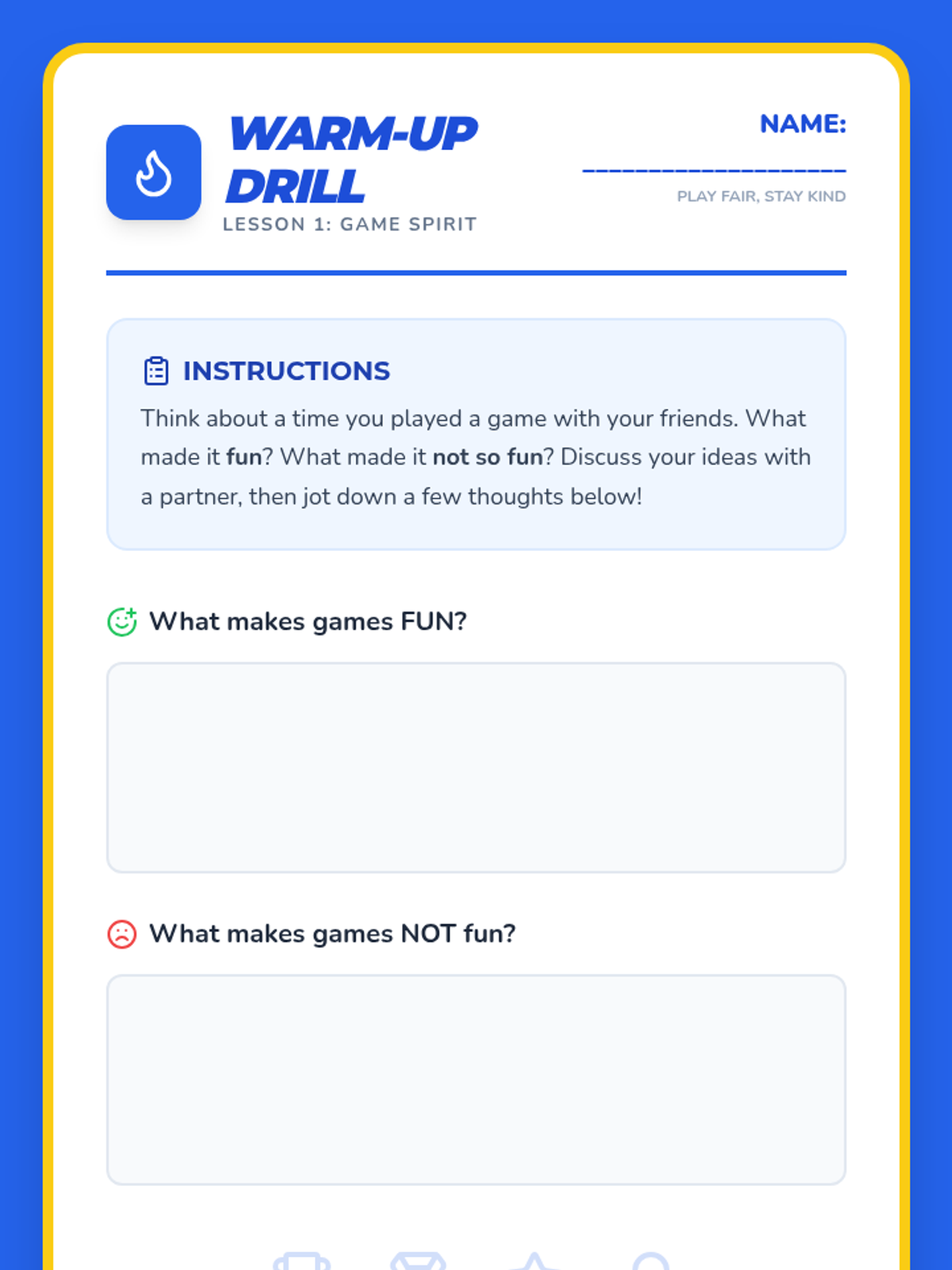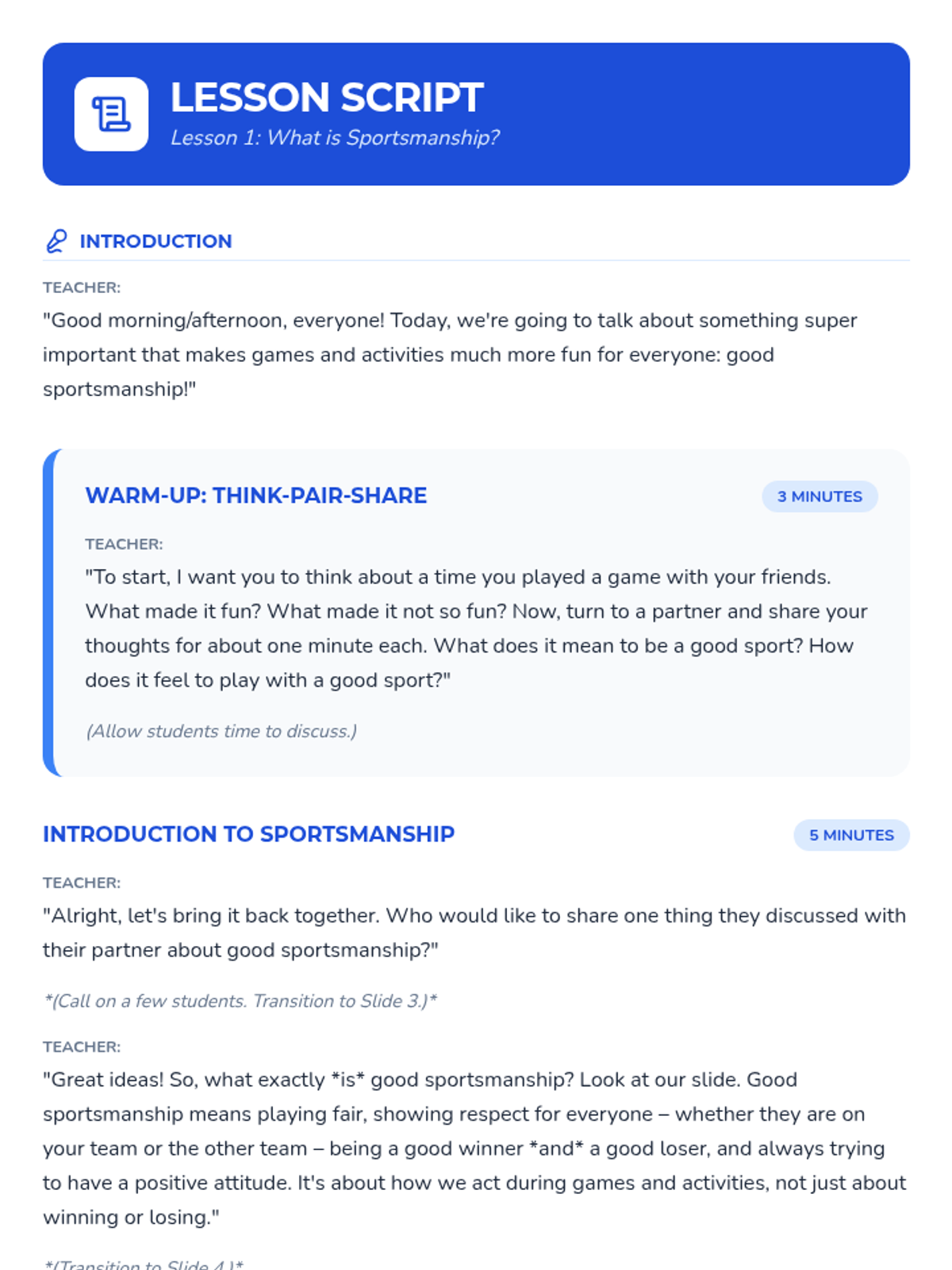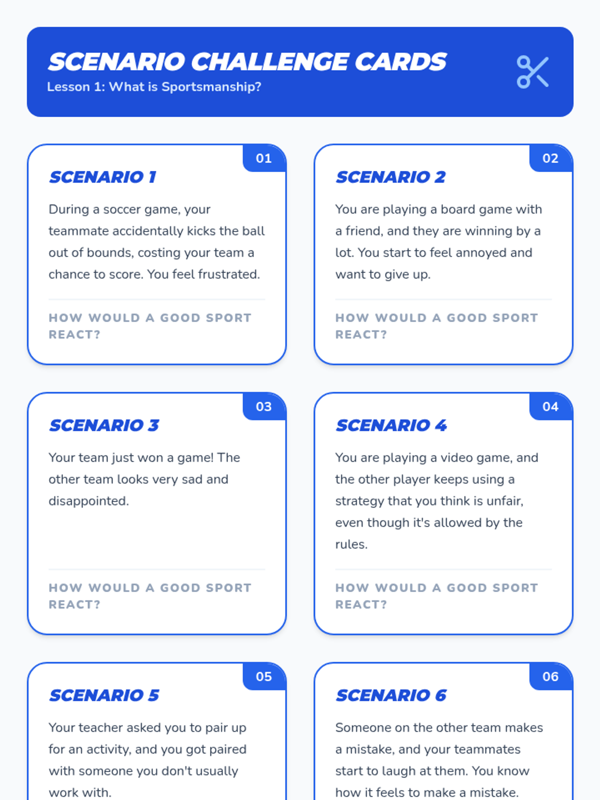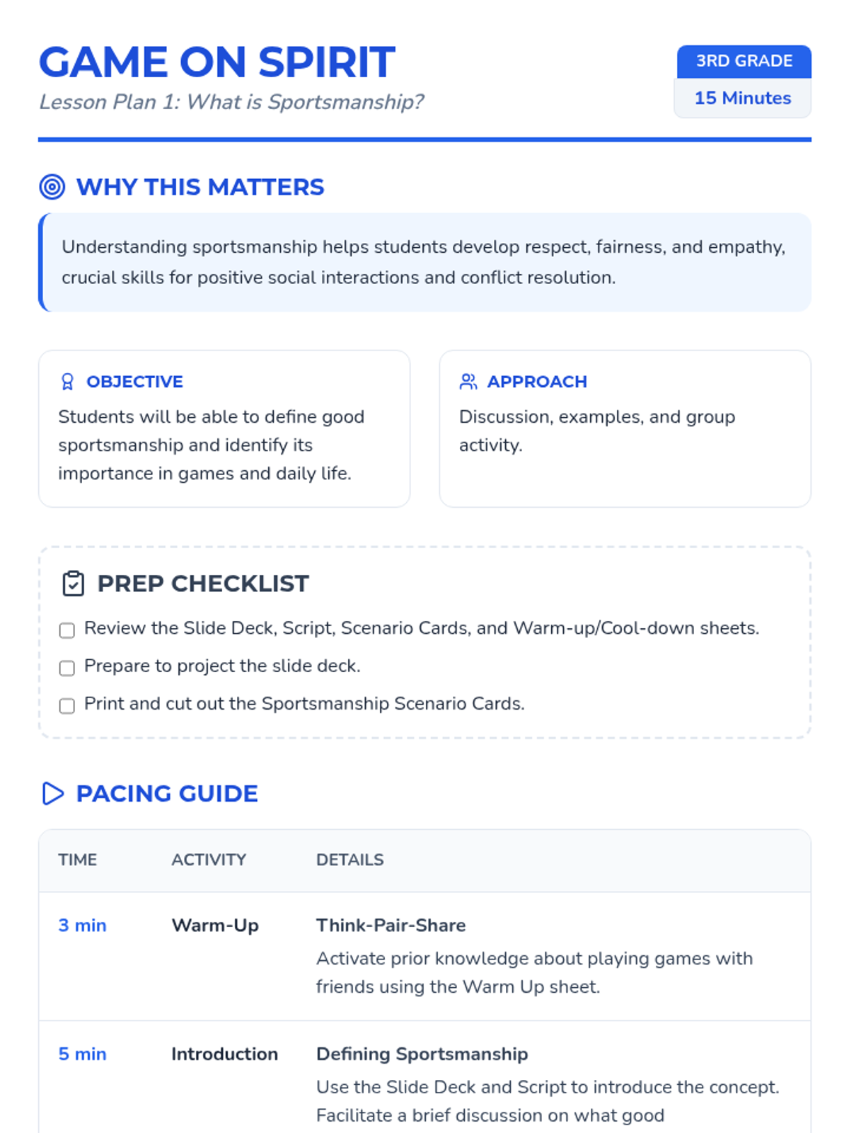 A series of five mini-lessons for 3rd-grade students focused on sportsmanship, fairness, respect, resilience, and teamwork in games and daily life.
