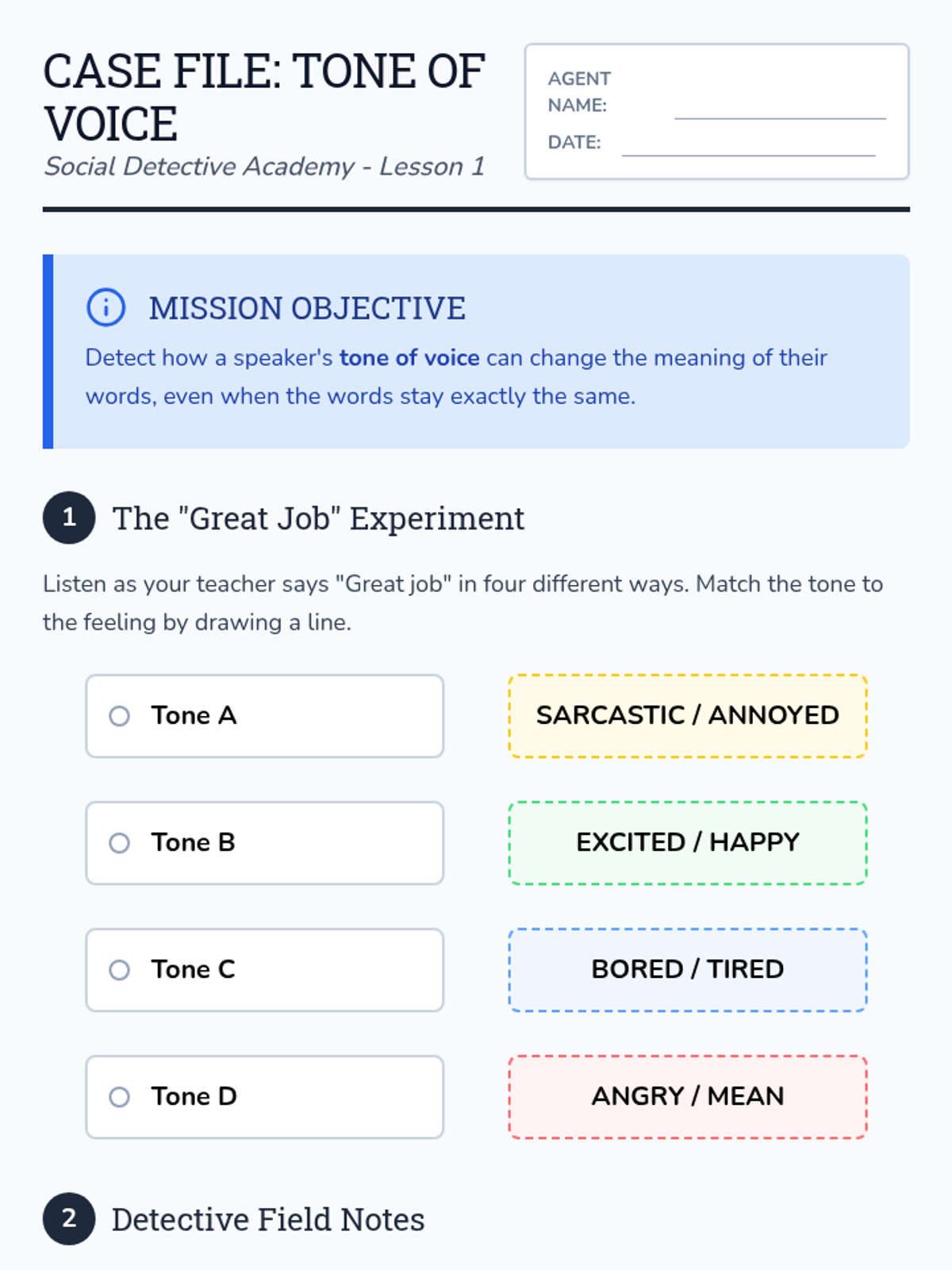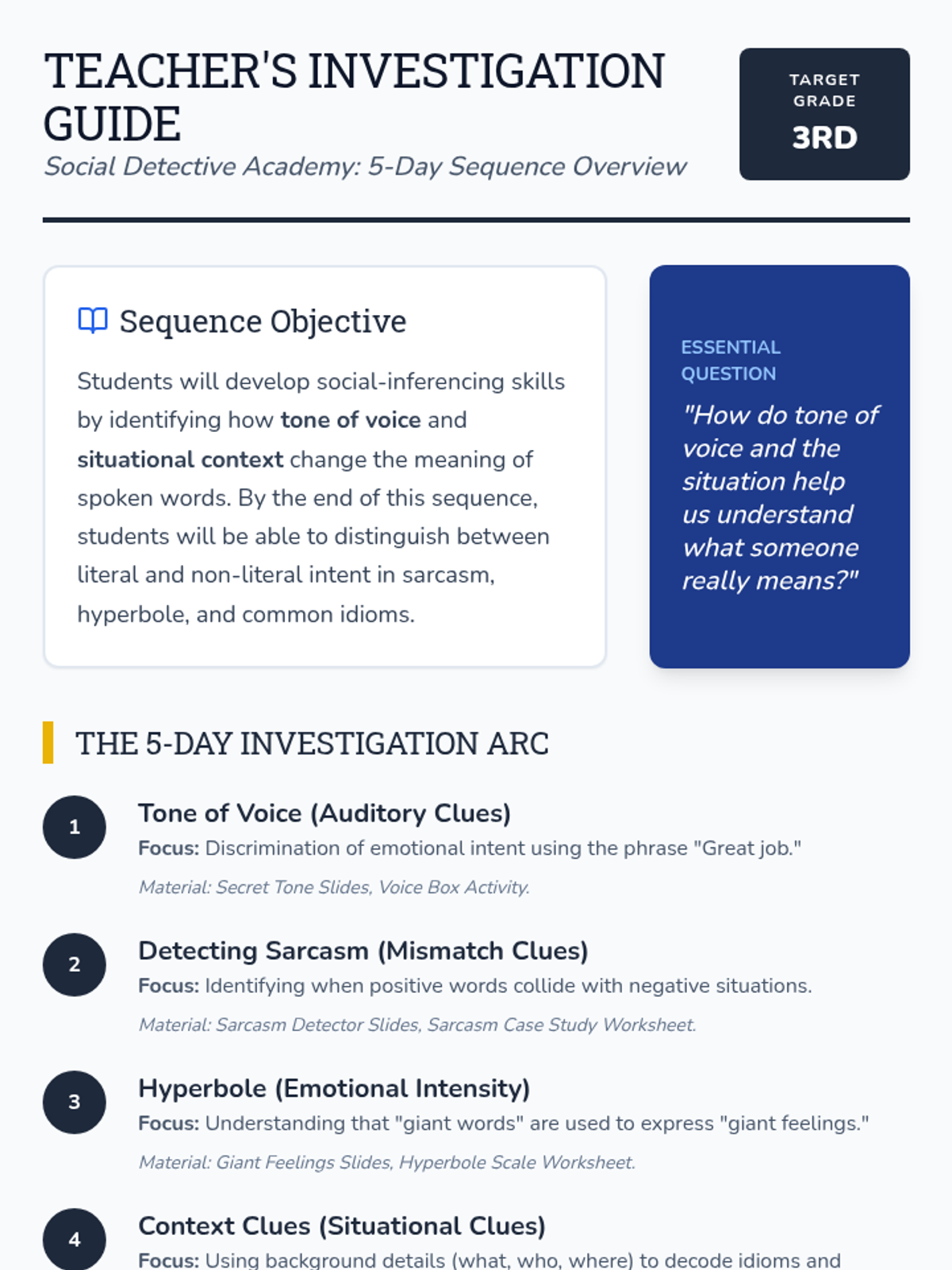 A 5-lesson sequence for 3rd-grade students focusing on social communication, specifically how tone of voice and context clues help infer meaning behind idioms, sarcasm, and hyperbole. Students act as 'Social Detectives' to uncover hidden meanings in everyday speech.
