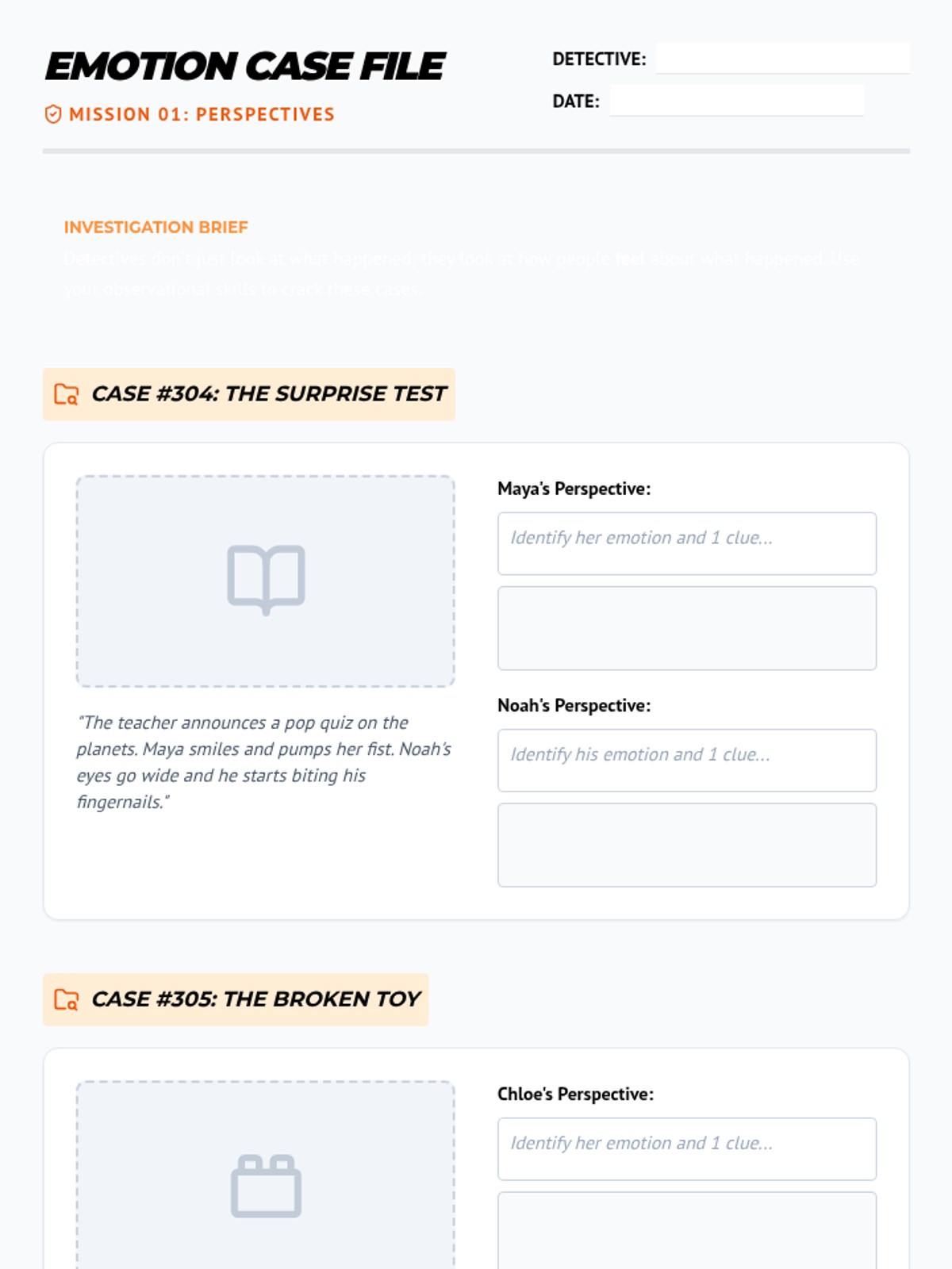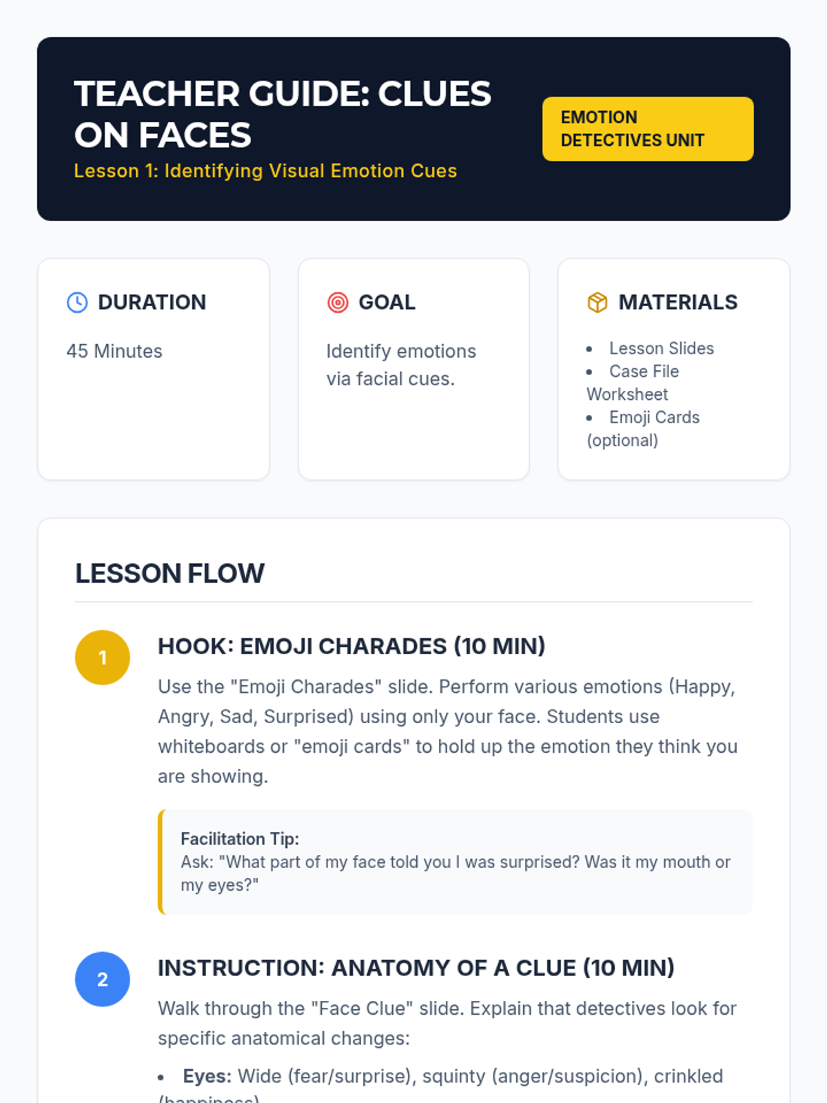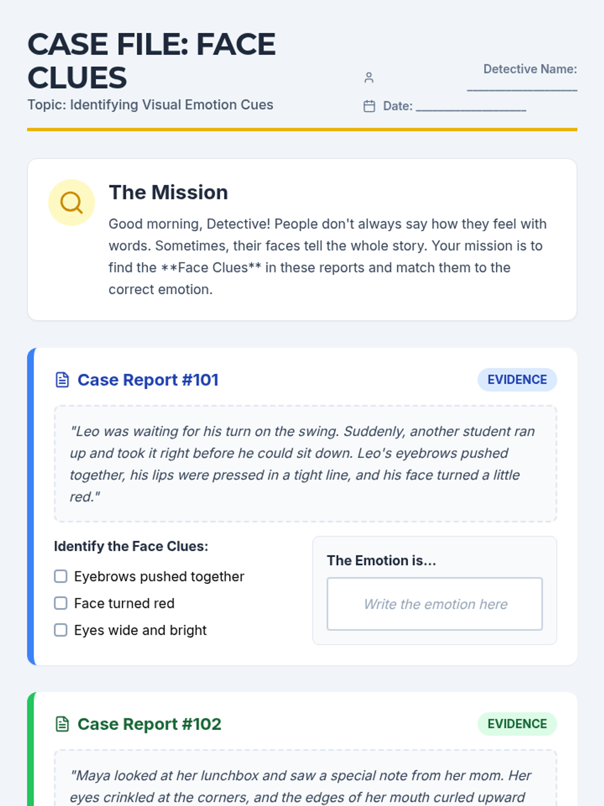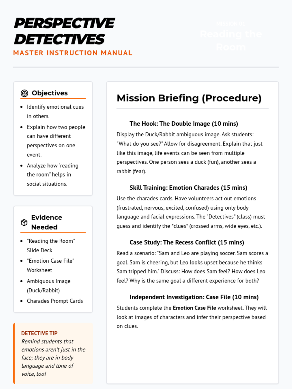 A 5-lesson unit for 3rd-grade students focused on interpreting non-verbal social cues, body language, and perspective-taking through a 'detective' lens. Students learn to decode emotions and predict social outcomes using social story analysis.