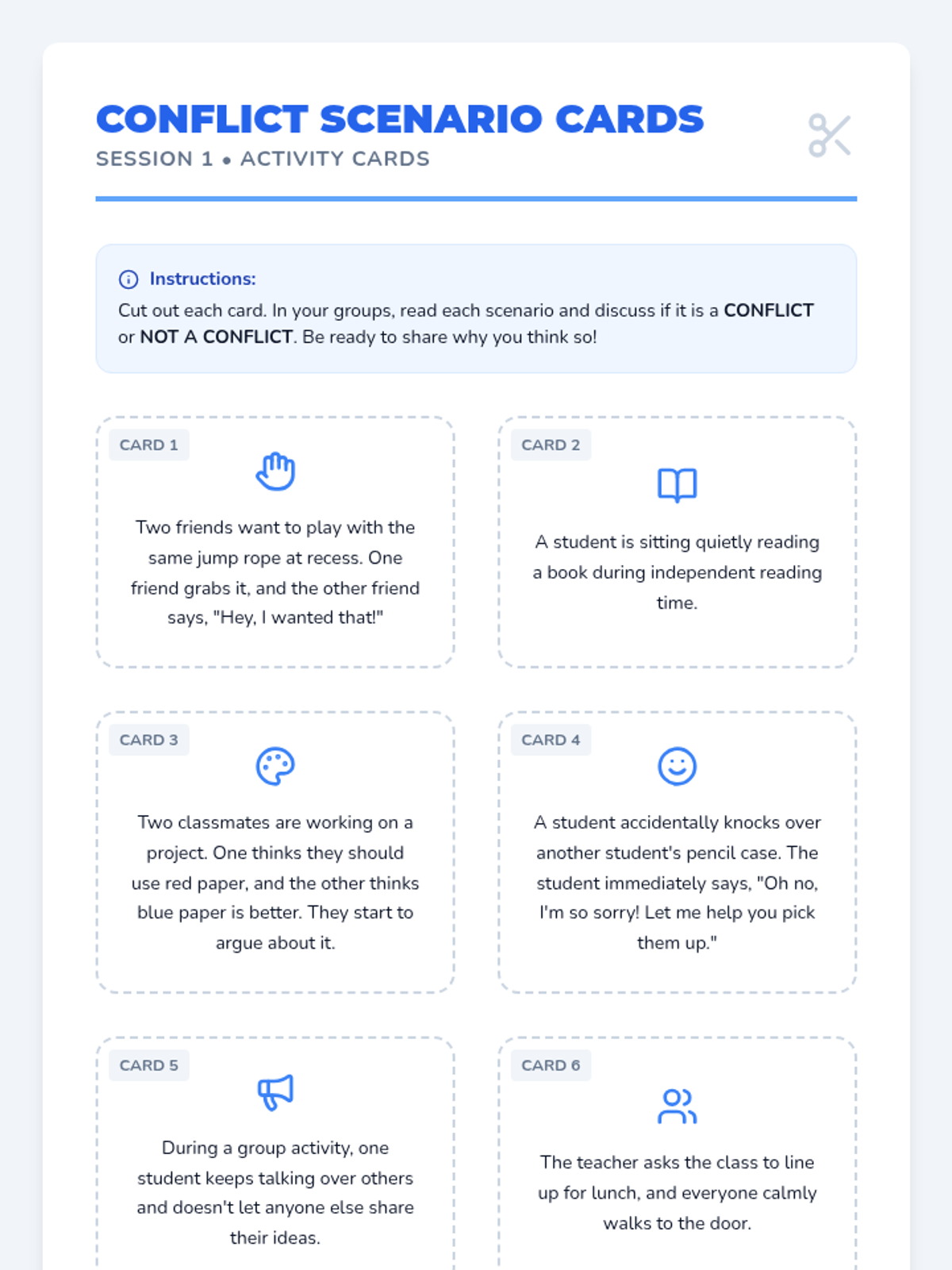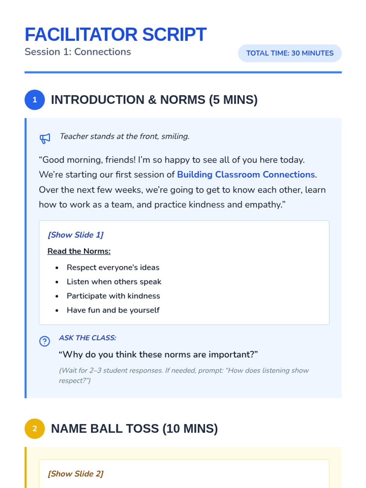 A 4-session series for third graders focused on building positive relationships, teamwork, and empathy to create a supportive classroom culture. Students engage in interactive icebreakers, collaborative challenges, and reflection activities.