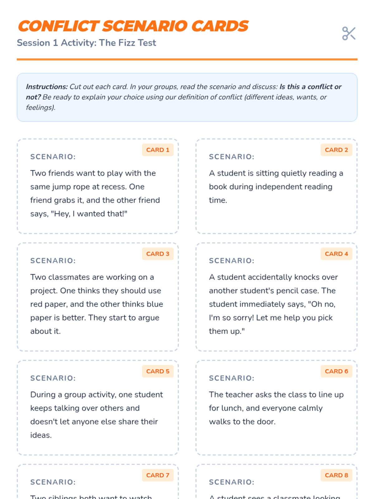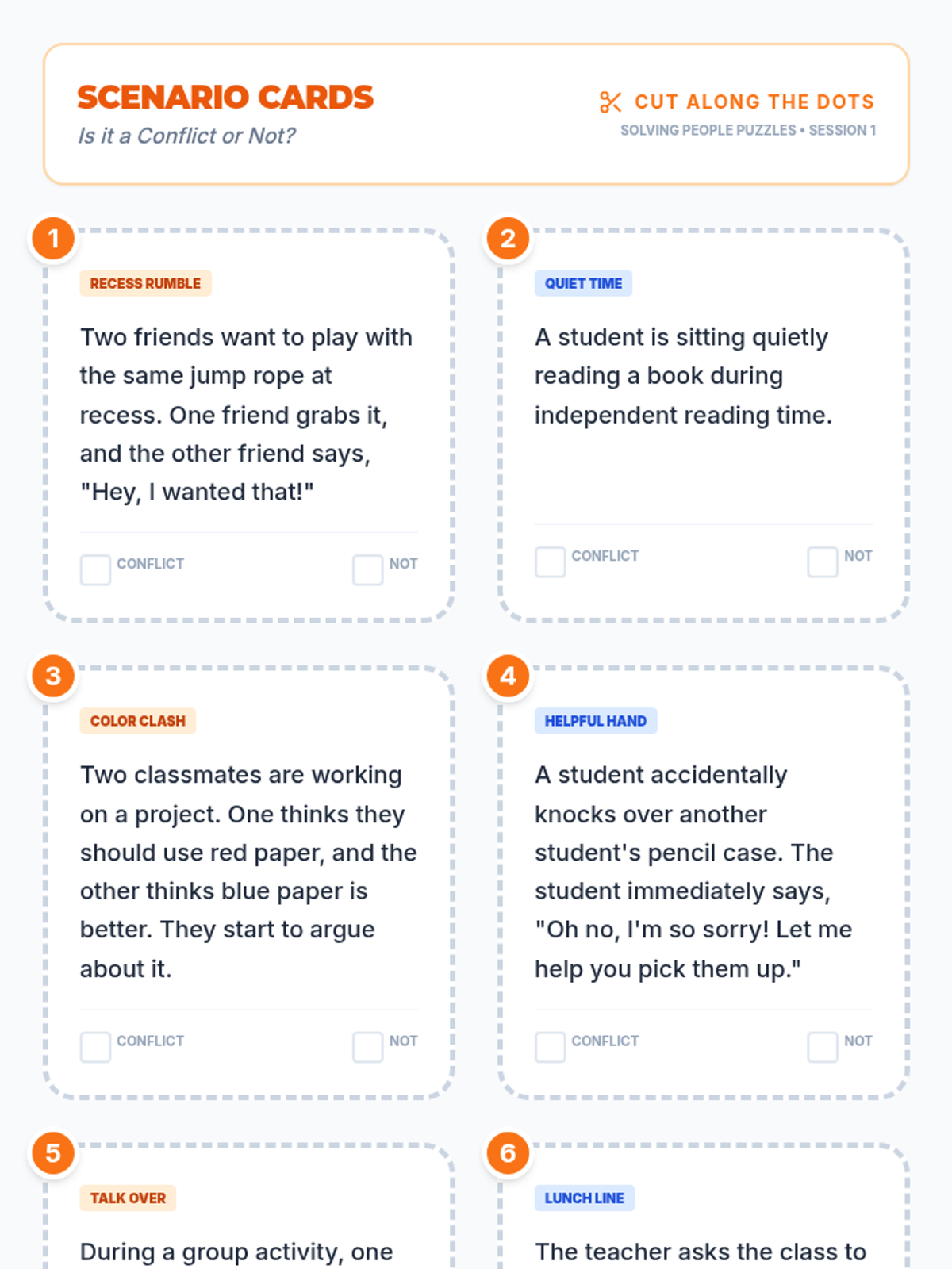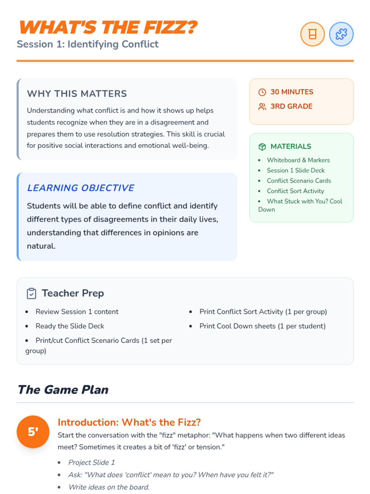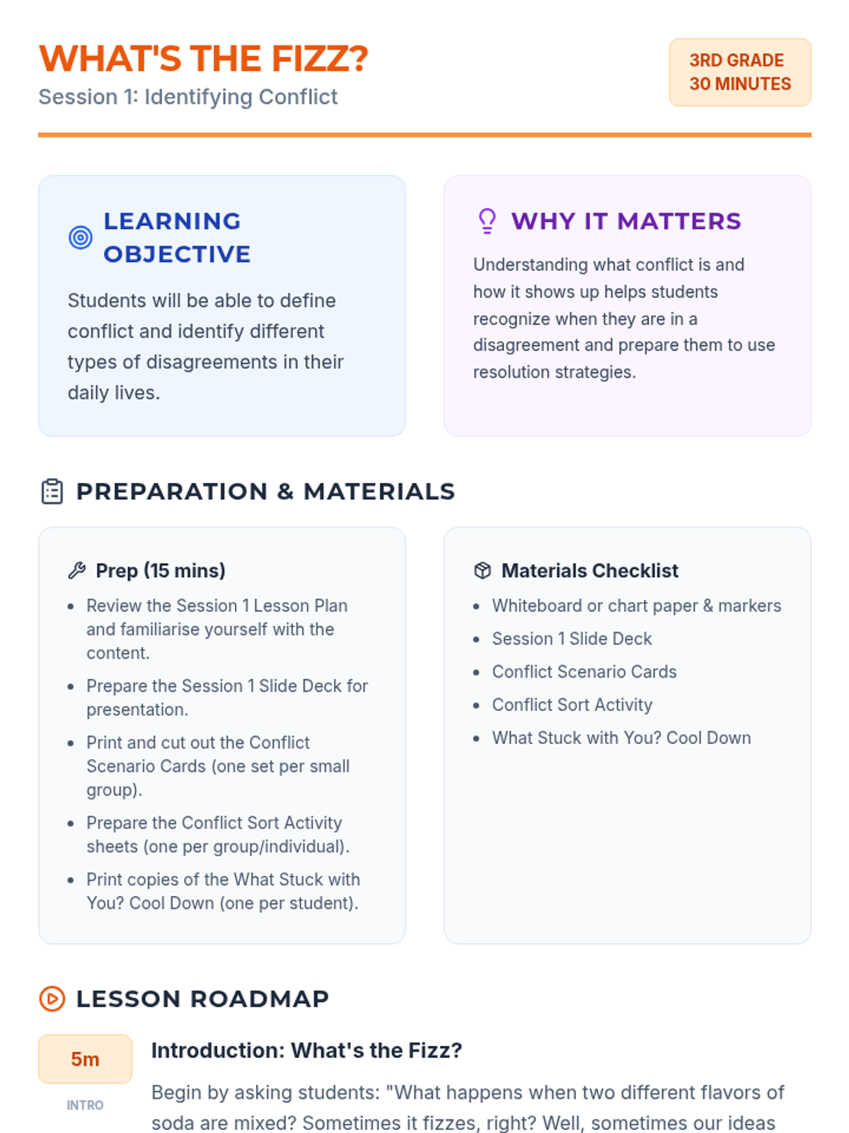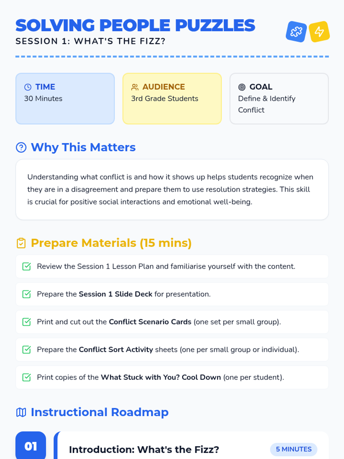 A comprehensive four-session social-emotional learning sequence for 3rd graders focused on identifying conflict, applying resolution strategies ('Fizz-Busters'), and fostering respect for diverse perspectives. Students move from recognizing the 'fizz' of disagreement to becoming expert 'People Puzzle Solvers' through interactive games, role-plays, and reflective journaling.