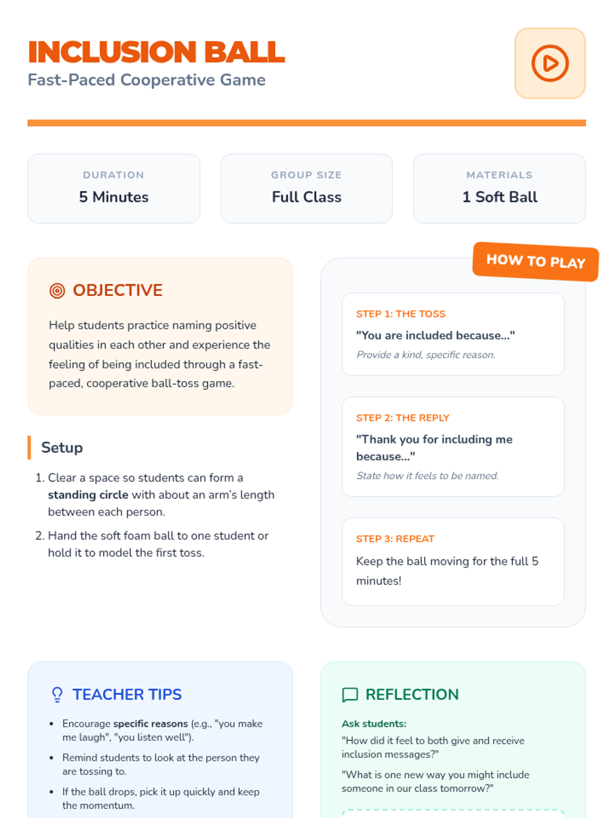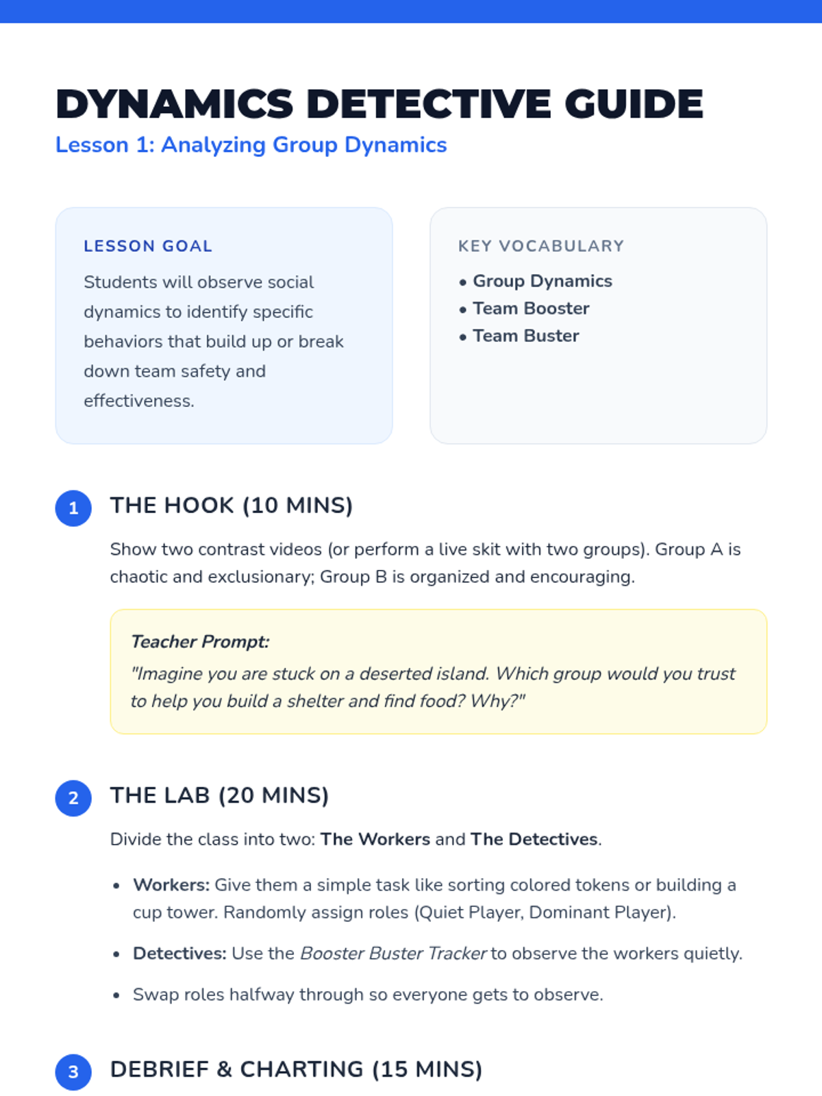 This sequence focuses on group dynamics, inclusion, and team morale for 3rd graders. Students explore how to make teams safe and welcoming through observation, simulation, and practical skill-building.
