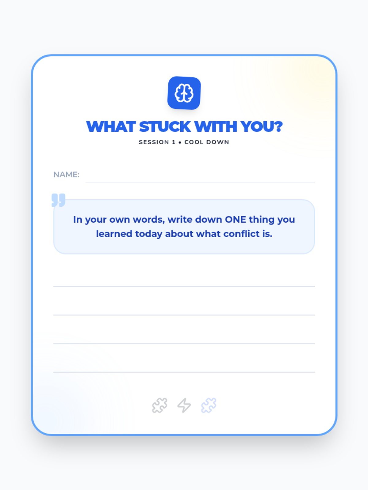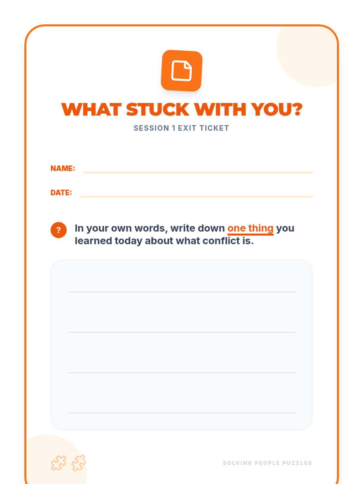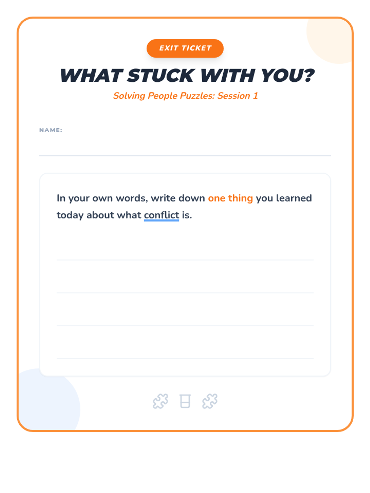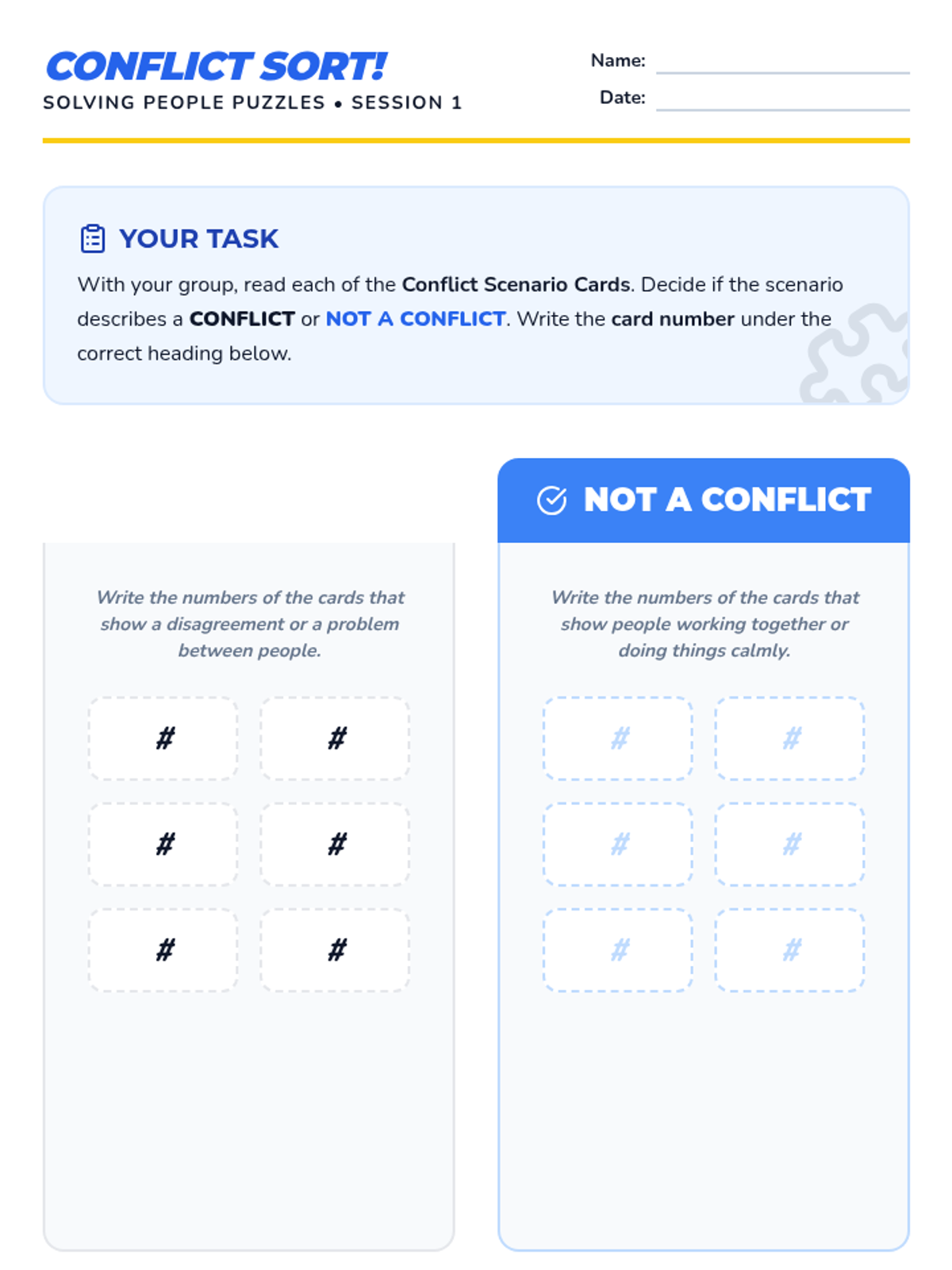A four-session social-emotional learning sequence for 3rd graders focused on identifying conflict, applying resolution strategies, and practicing respect for diverse perspectives through the metaphor of 'People Puzzles' and 'Fizz'.