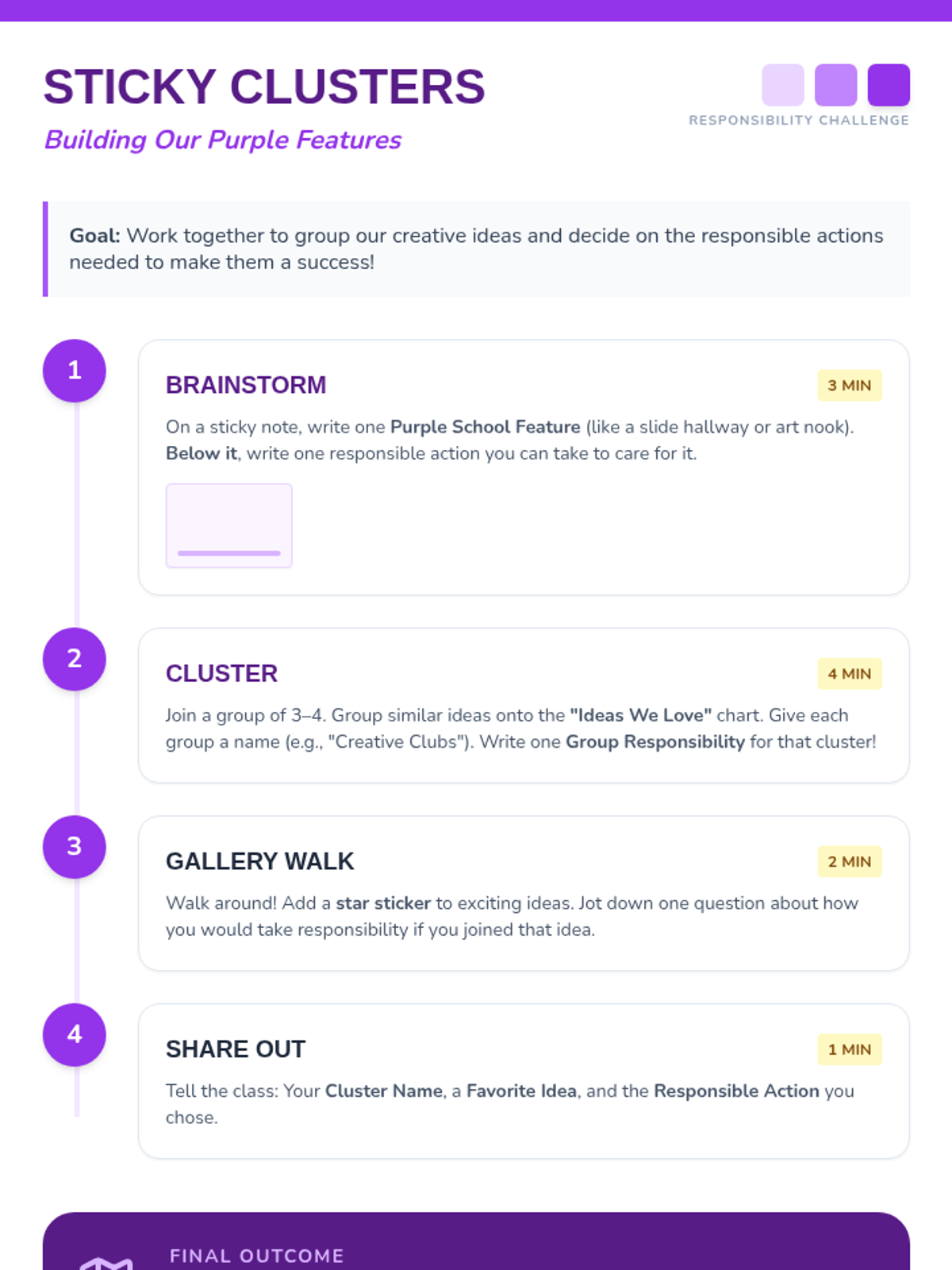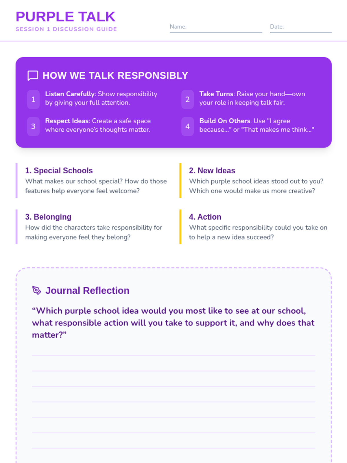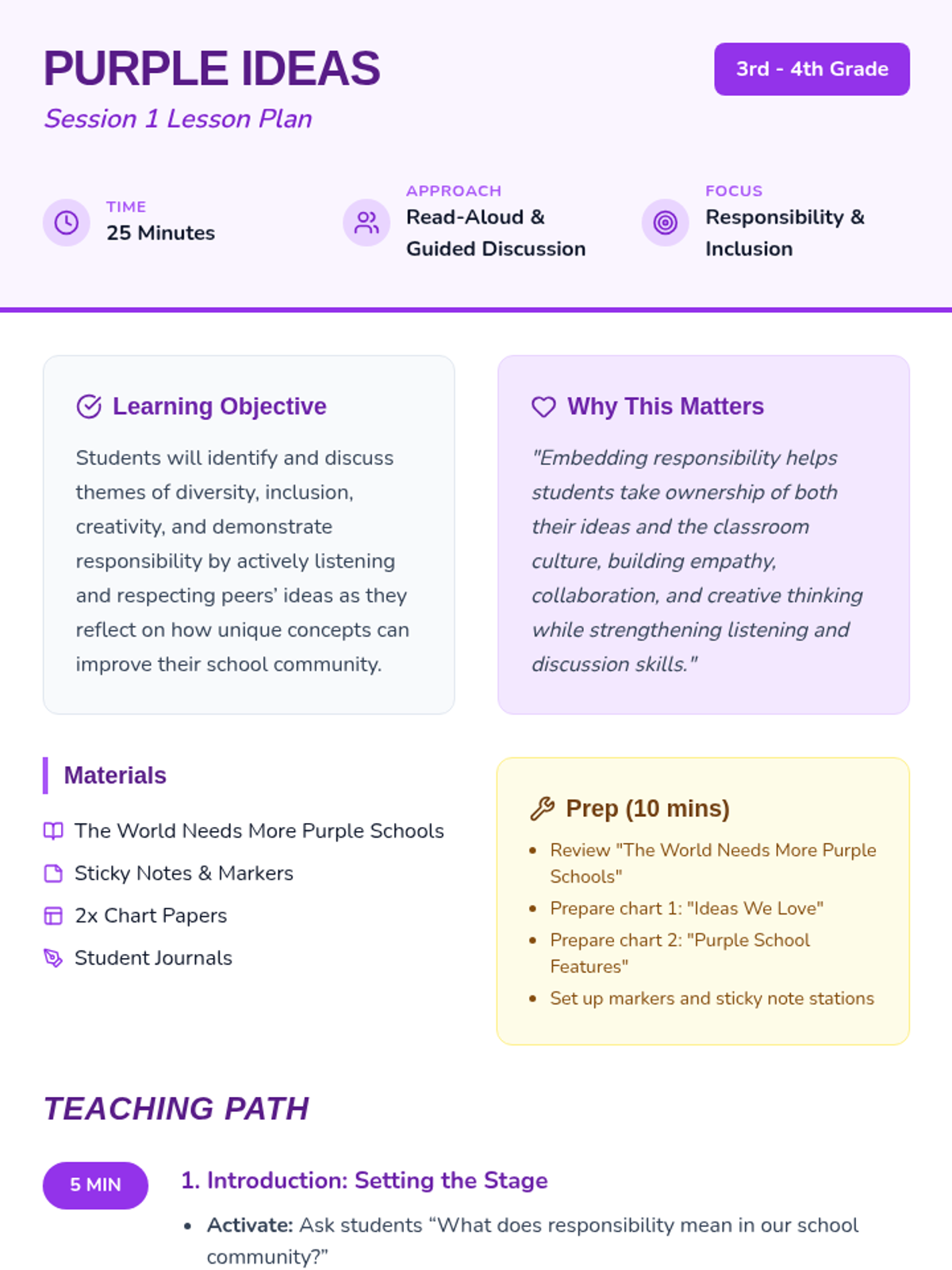 A two-session read-aloud and design sequence for 3rd and 4th graders exploring diversity, inclusion, and responsibility through 'The World Needs More Purple Schools' by Bob Shea. Students move from discussing core values to designing their own inclusive school blueprints.