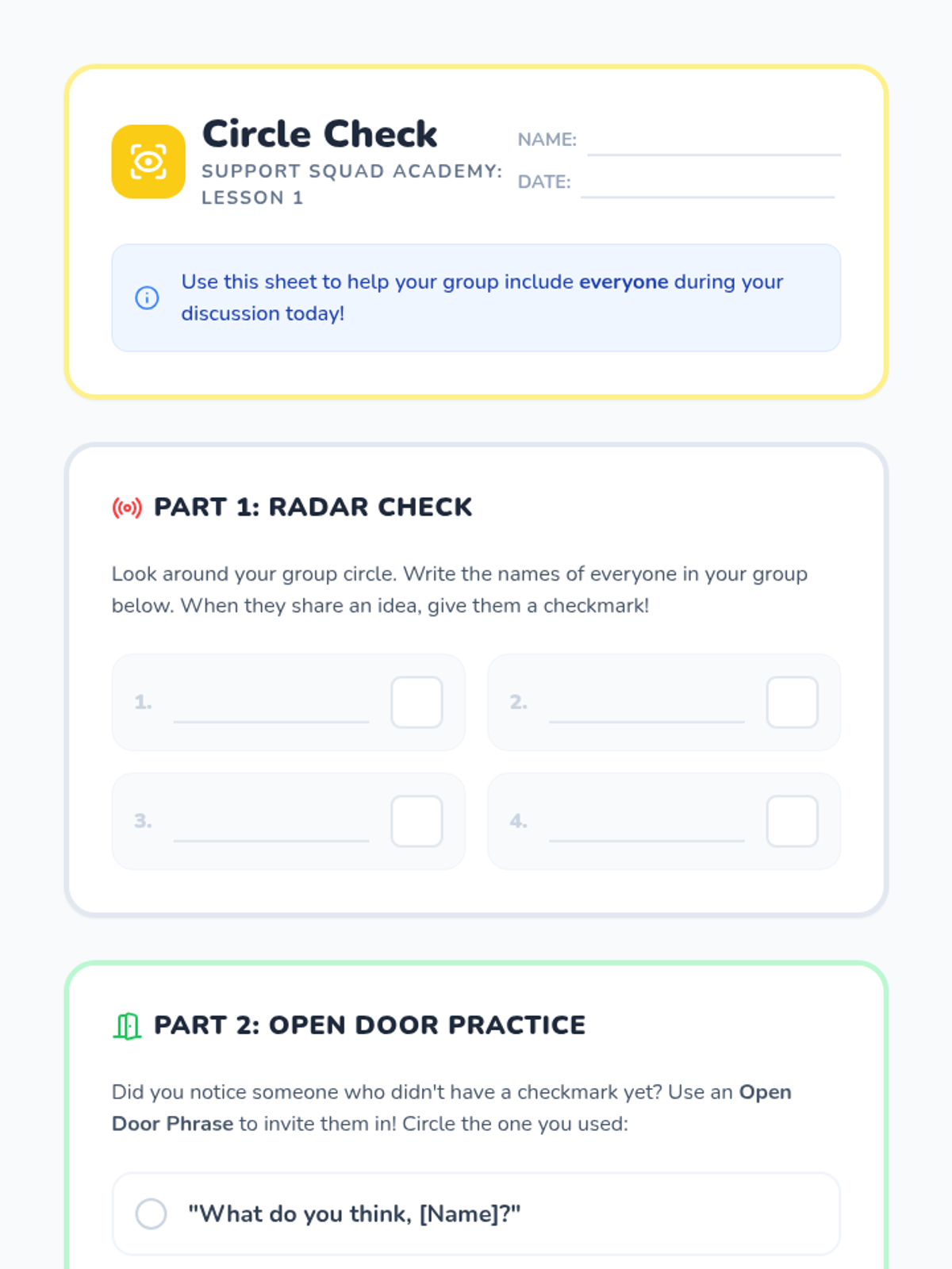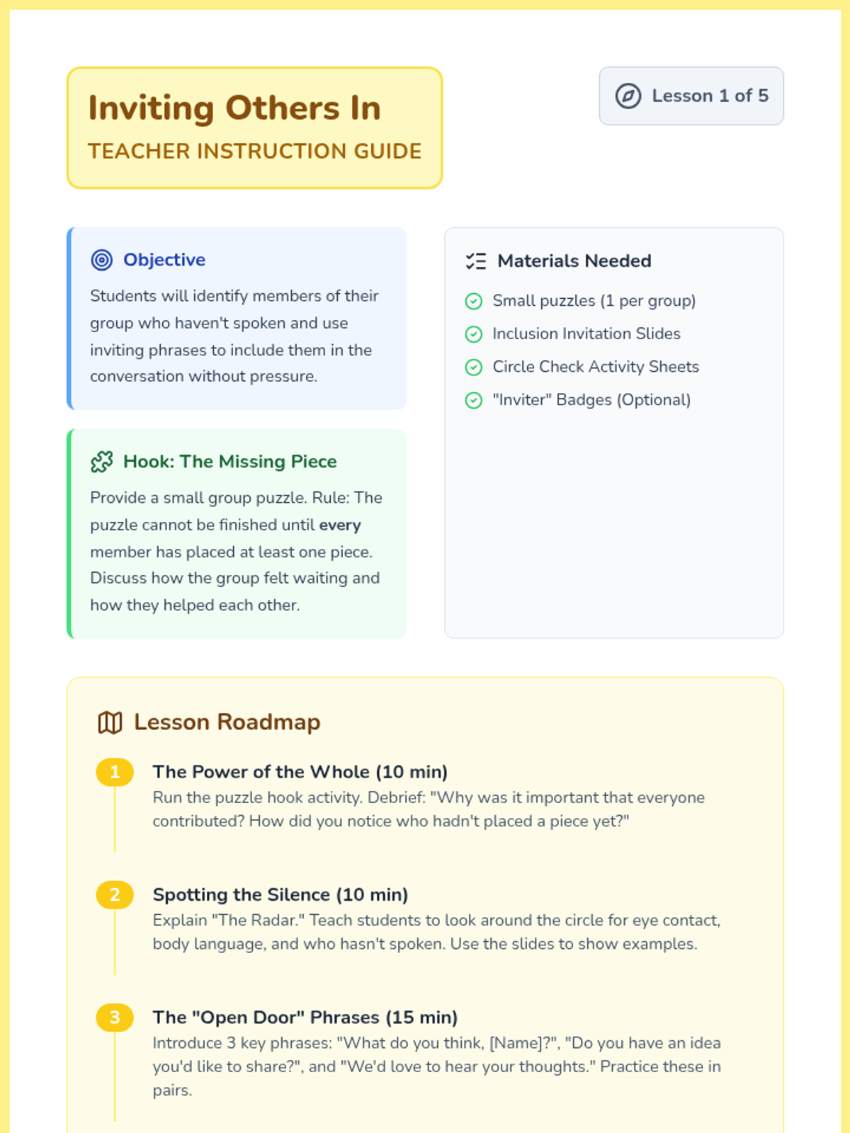 A 5-lesson sequence for 3rd graders focused on building inclusive, encouraging, and respectful group dynamics. Students learn to invite others in, manage interruptions, use encouraging language, and navigate disagreements while maintaining a supportive environment.