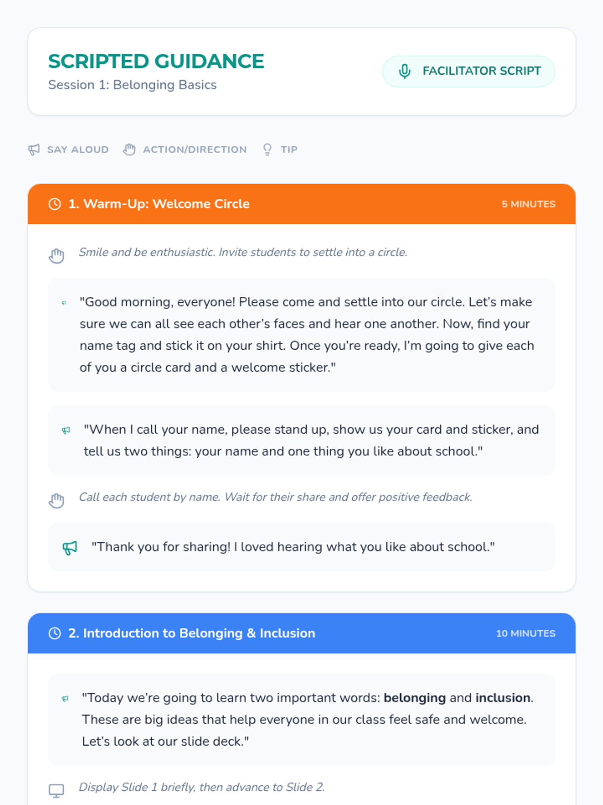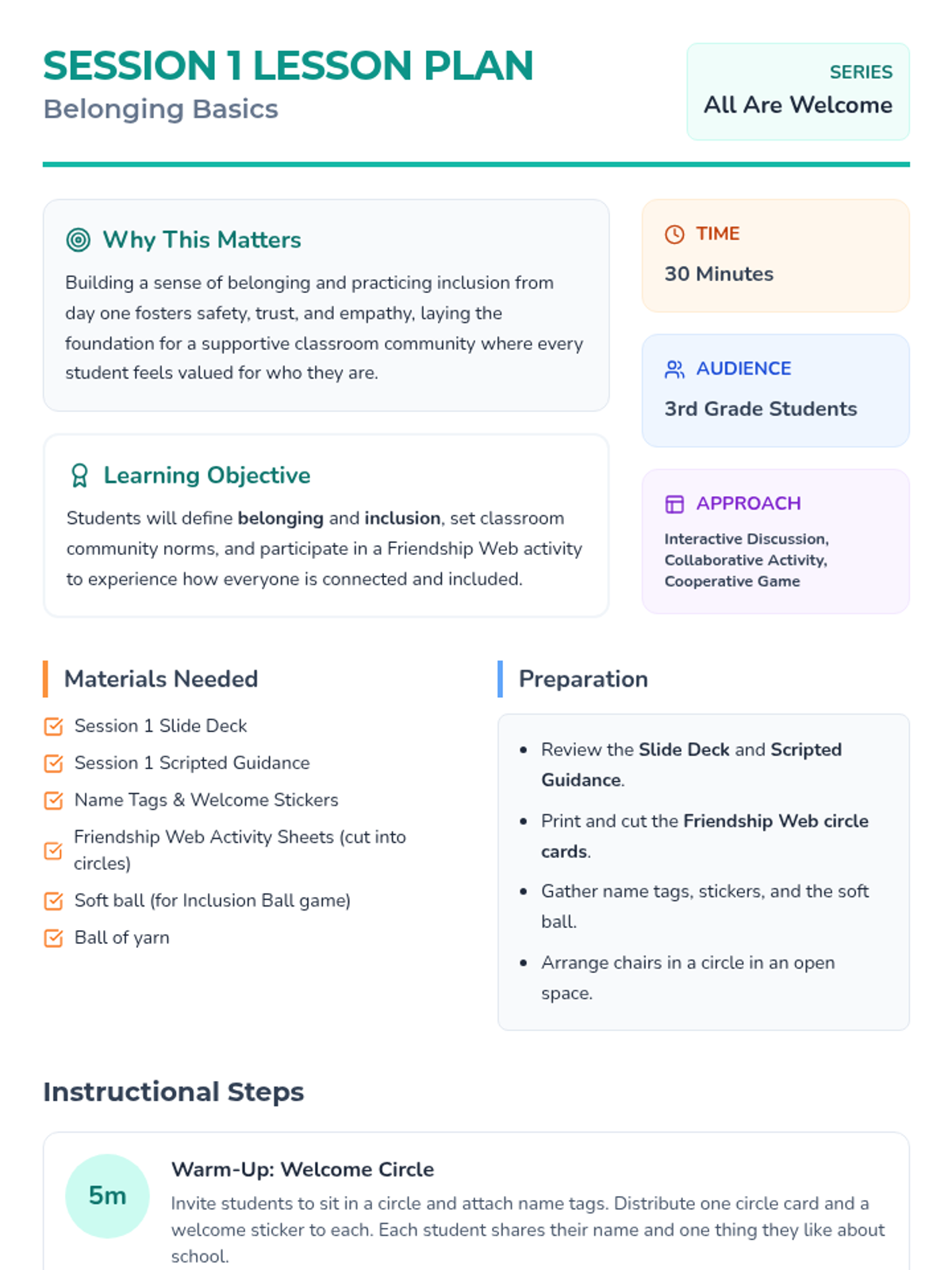A 5-session series for 3rd graders focused on building belonging, empathy, and inclusion through interactive classroom activities. Students move from defining belonging to practicing active inclusion and celebrating their diverse community.