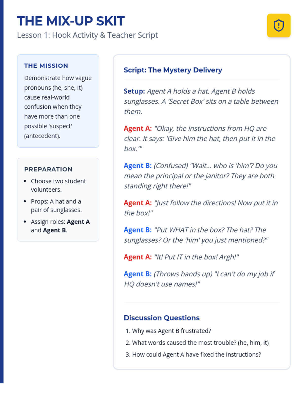 A 5-lesson grammar sequence for 3rd grade focusing on pronoun clarity. Students learn to identify and fix vague or ambiguous pronoun references through a fun 'Pronoun Patrol' detective theme.