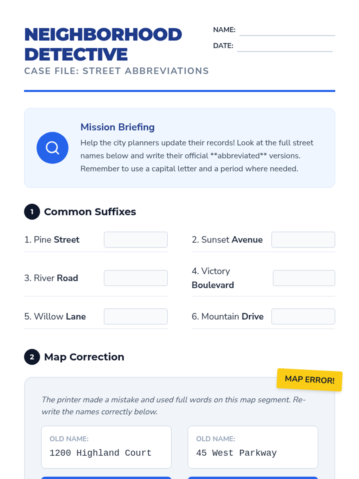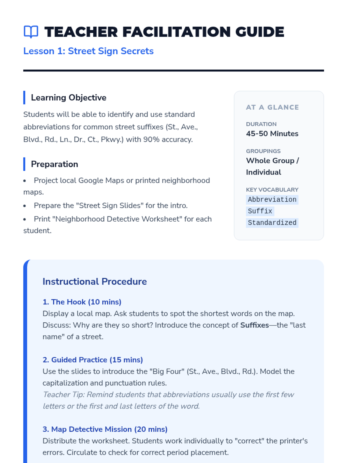 This sequence immerses students in the practical application of abbreviations related to geography, mailing addresses, and locations. Through a simulation of a classroom post office, students learn the specific conventions for street suffixes, state codes, and directional markers.