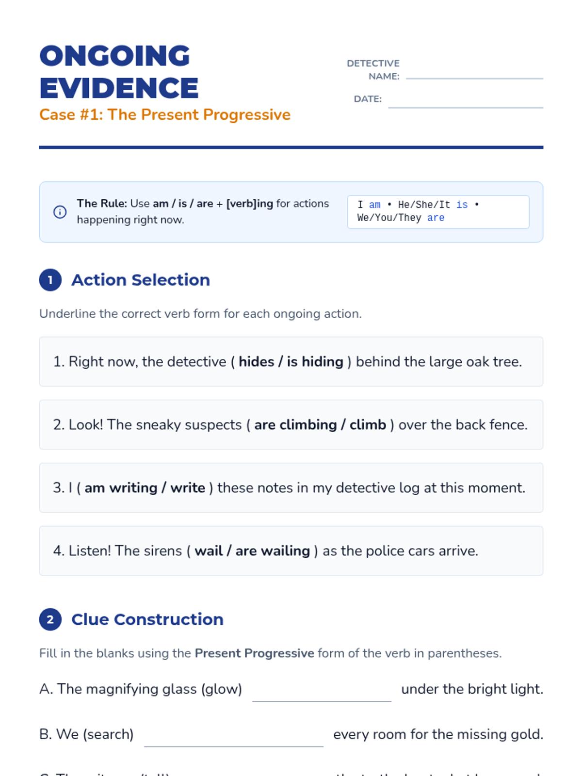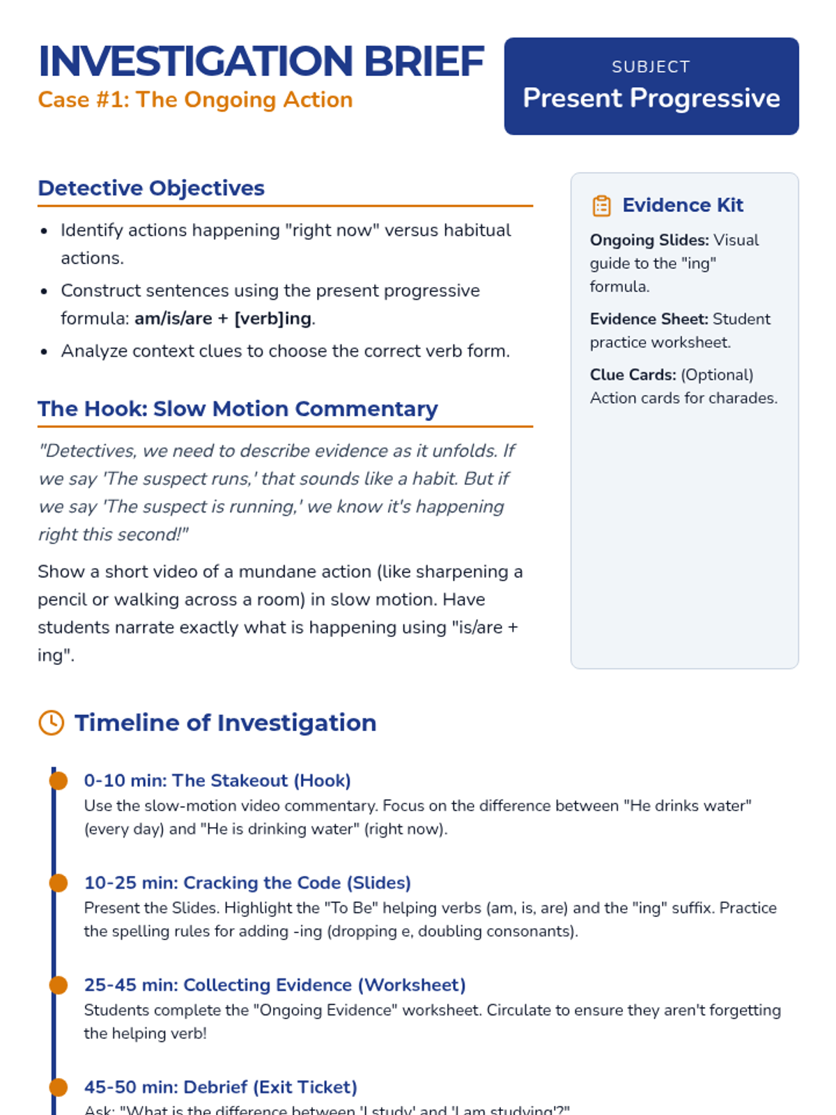 A 5-lesson unit for 3rd grade students introducing progressive and perfect verb tenses using a 'Time Detective' theme. Students learn to distinguish between ongoing, interrupted, and completed actions to improve their writing precision.