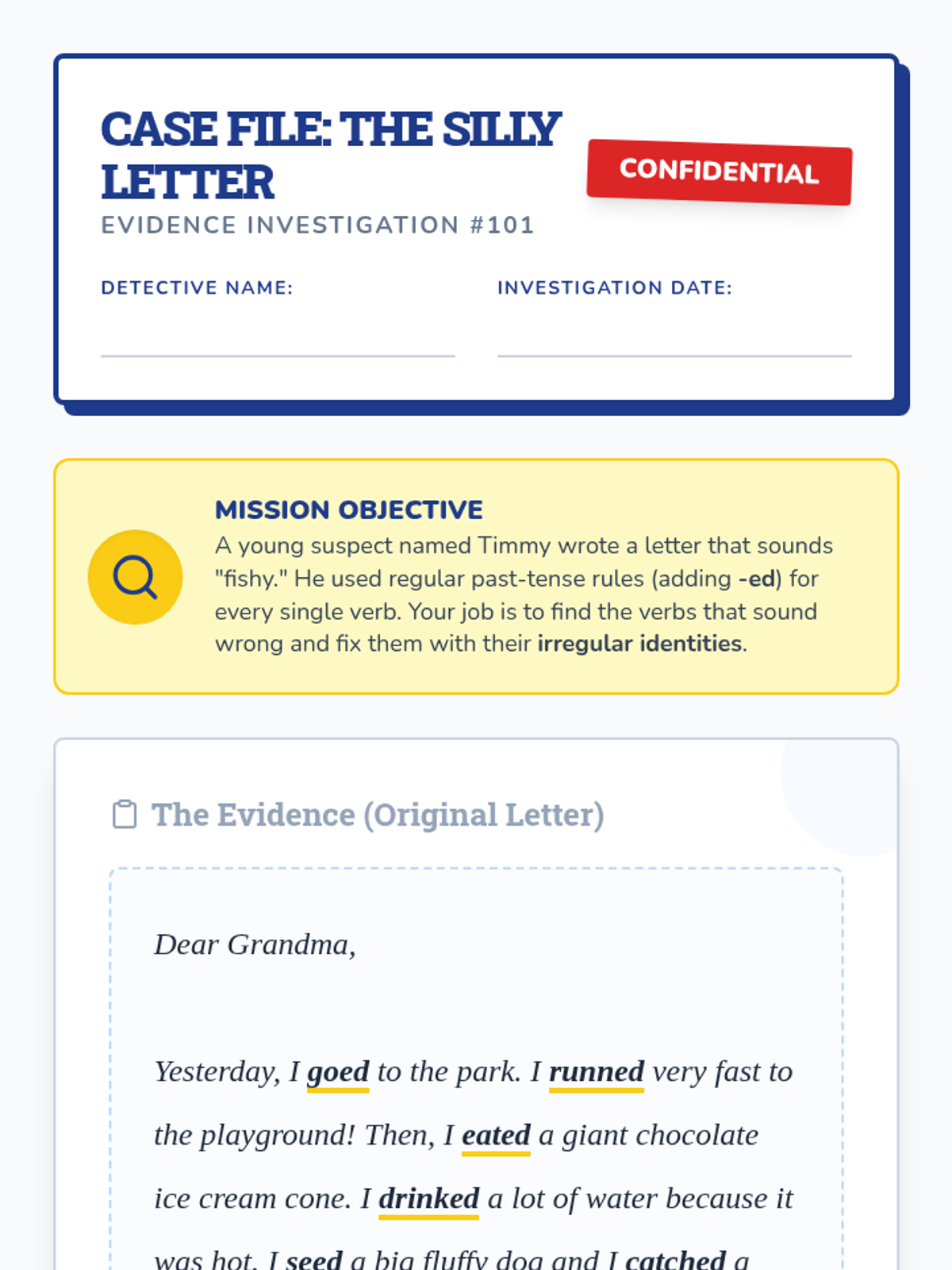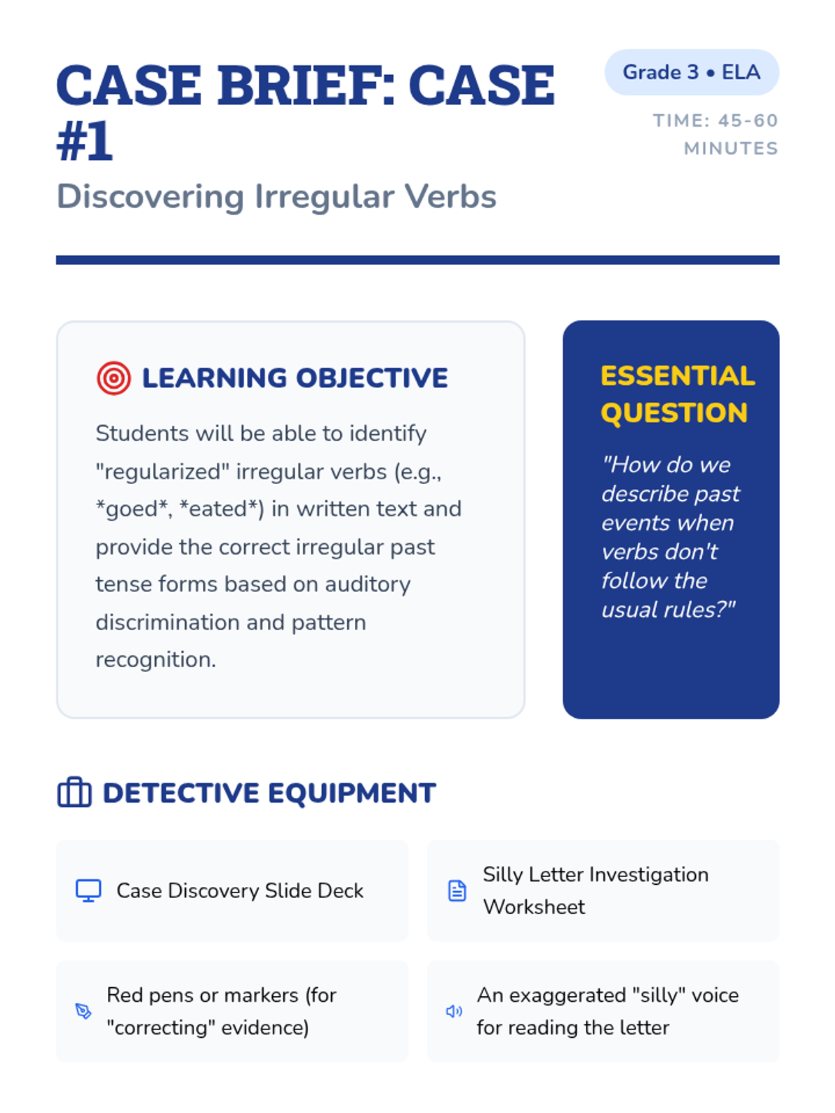 This sequence guides 3rd-grade students through the world of irregular past tense verbs using a 'Grammar Detective' theme. Students identify, categorize, and apply irregular verbs through investigative activities, culminating in a personal narrative project.
