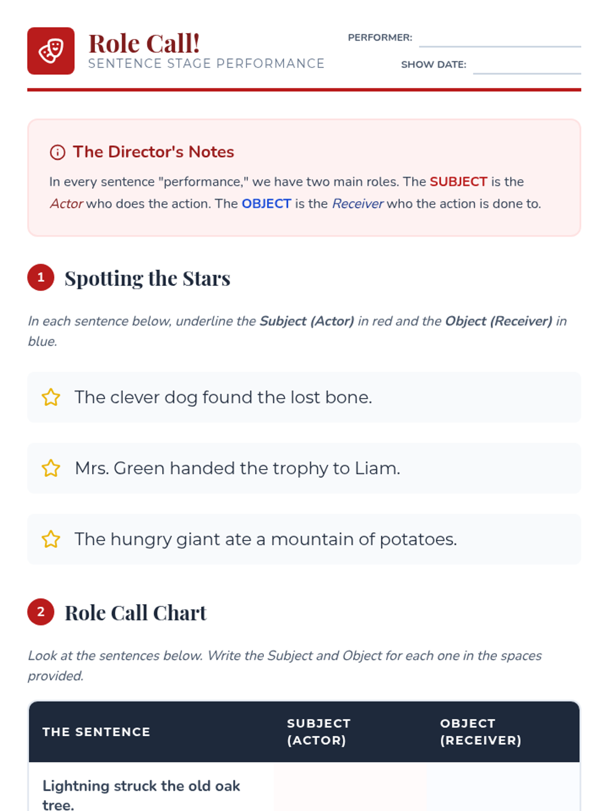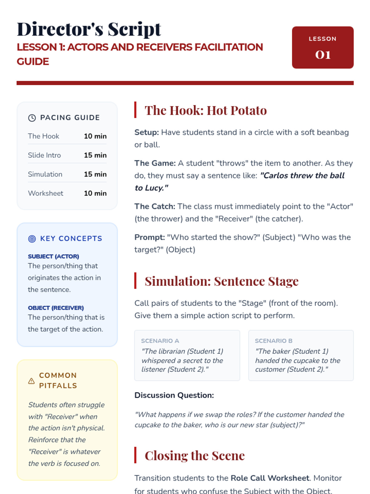 A 5-lesson sequence for 3rd graders focused on distinguishing between subject and object pronouns through a theater-inspired 'Actors vs. Receivers' framework. Students move from physical role-playing to mastering complex compound subjects and case proficiency.
